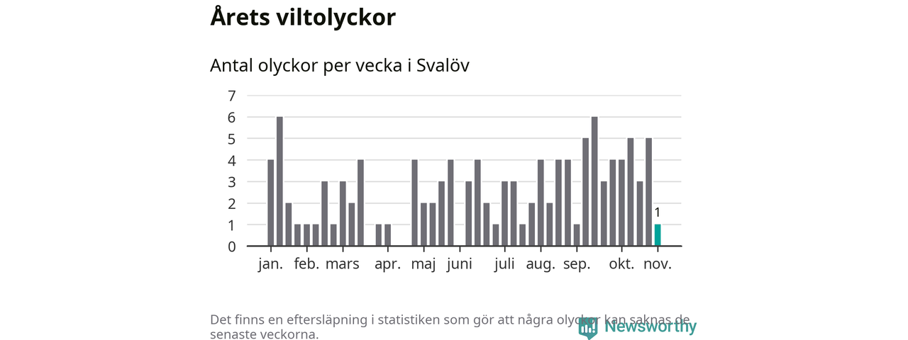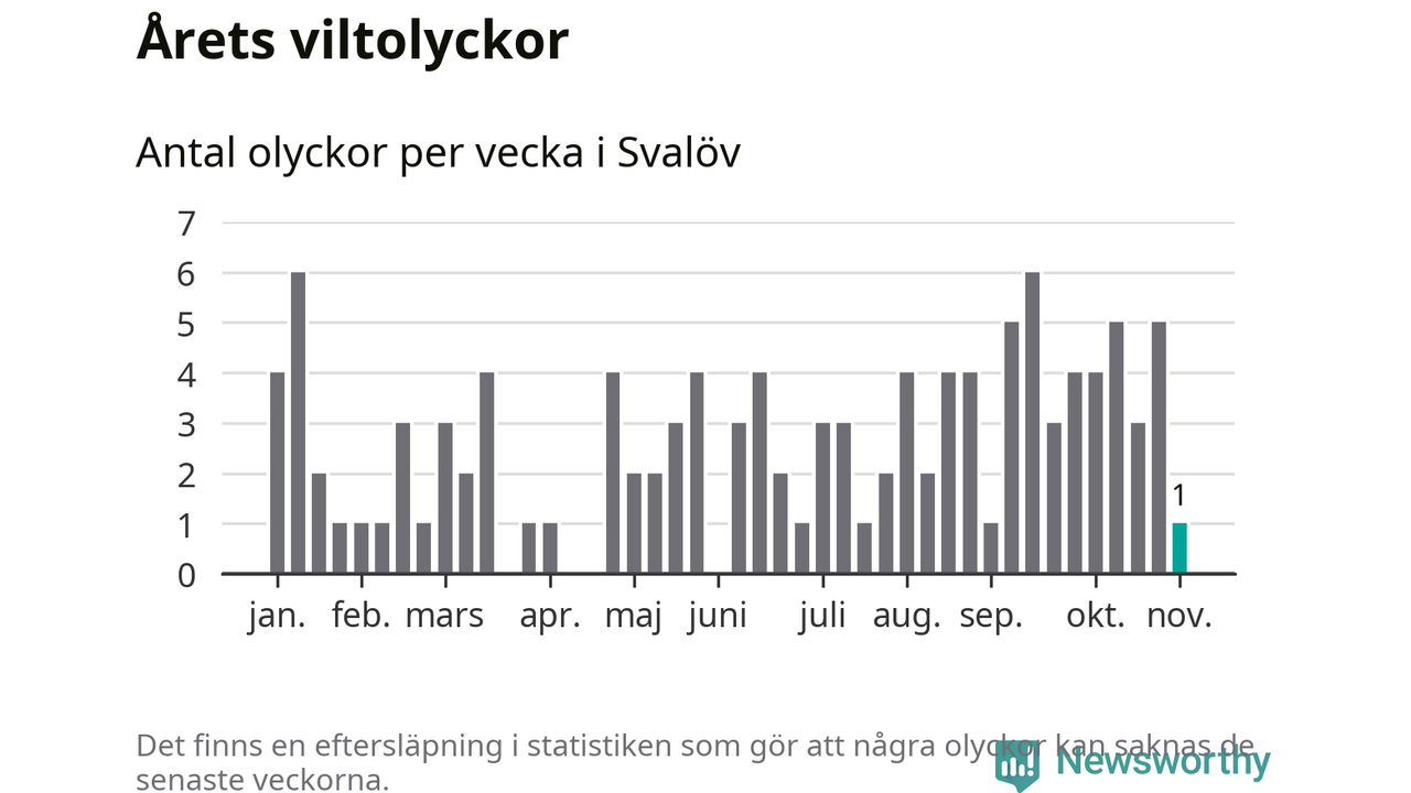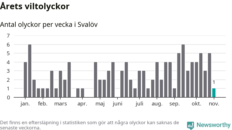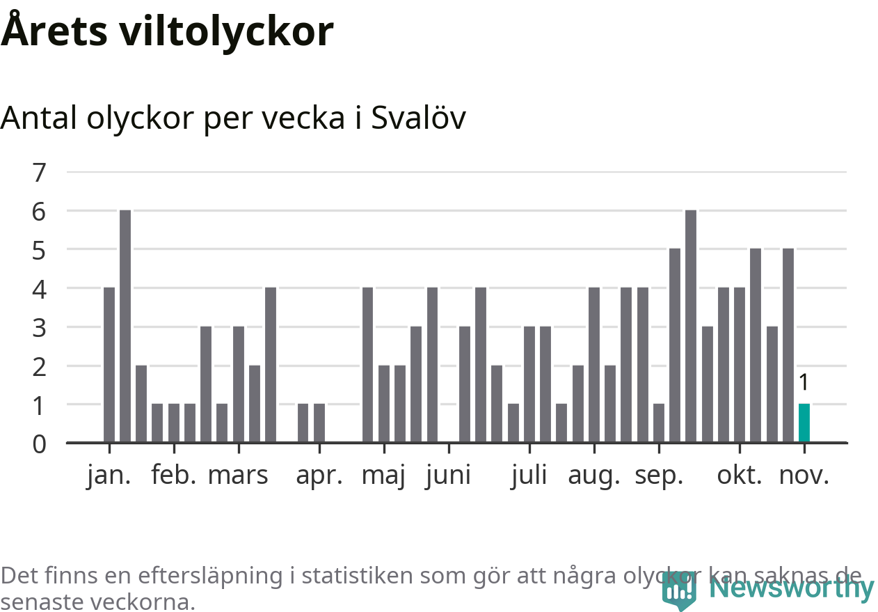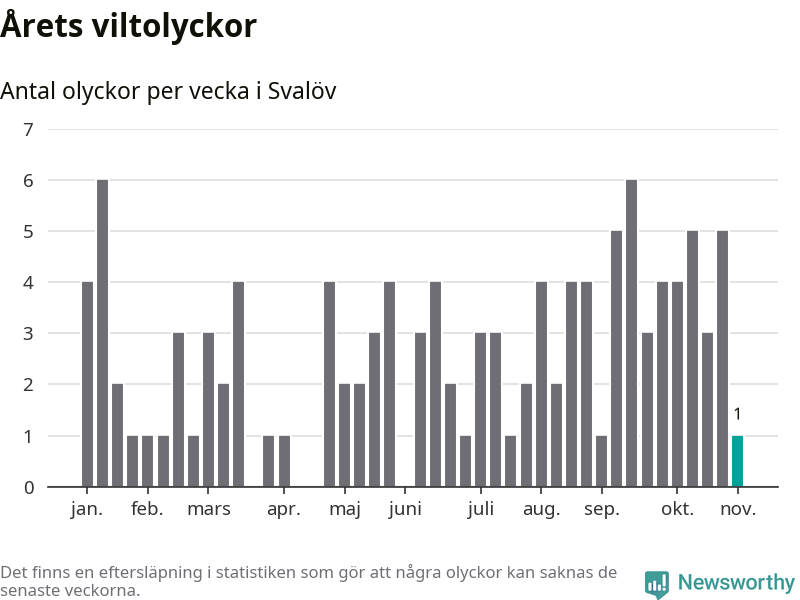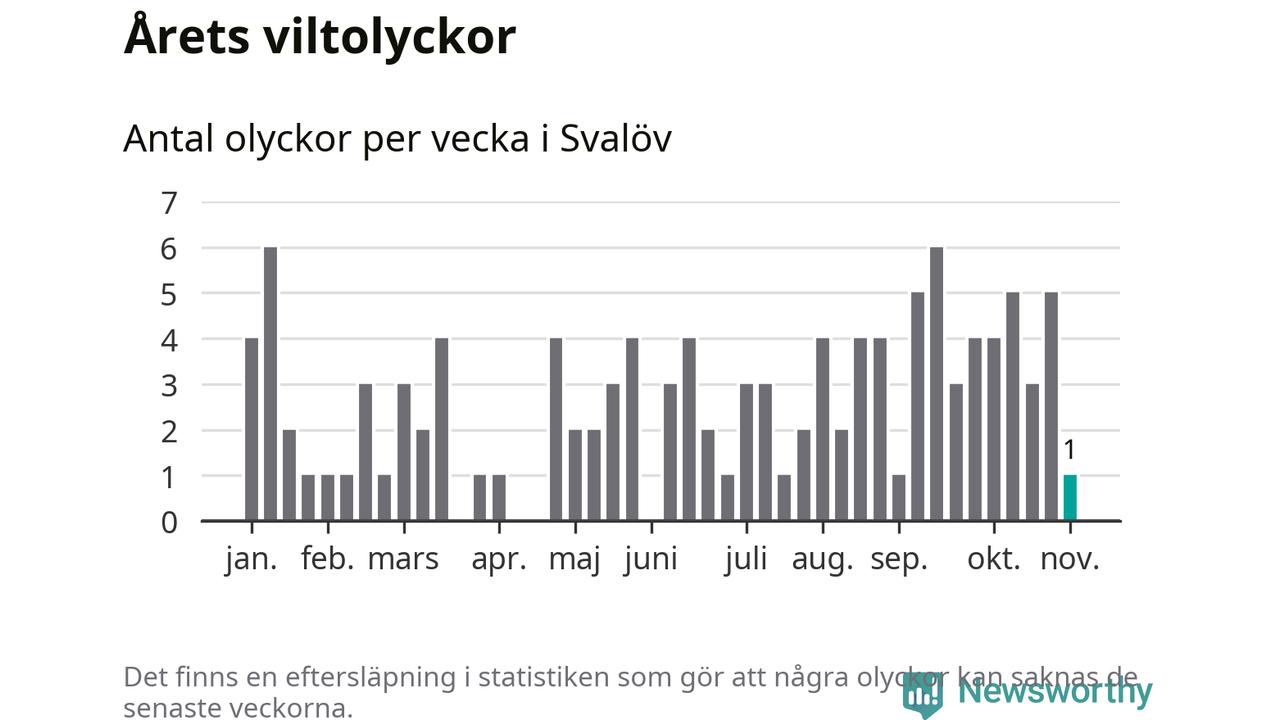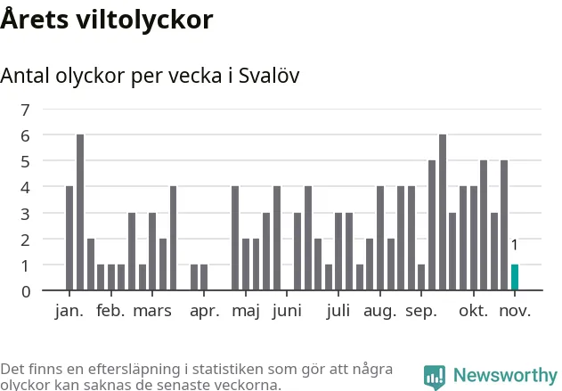 Från förra veckan (vecka 45) har hittills en viltolycka rapporterats in i Svalövs kommun.