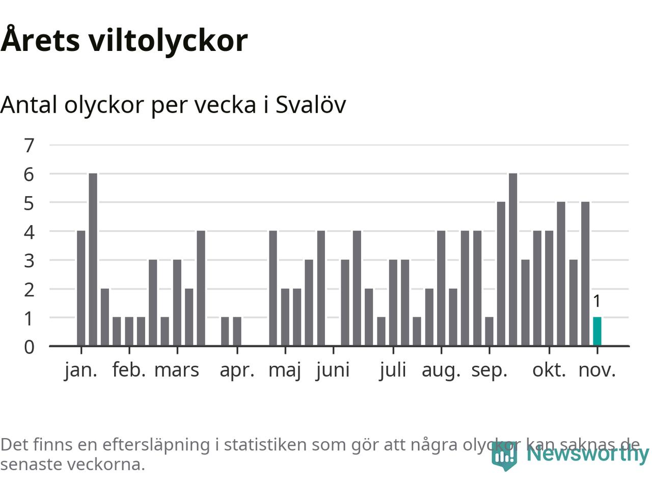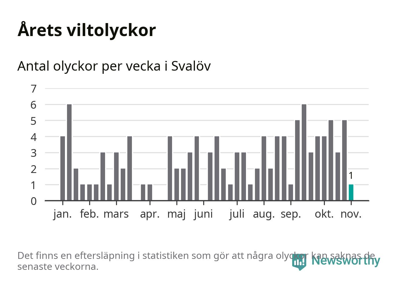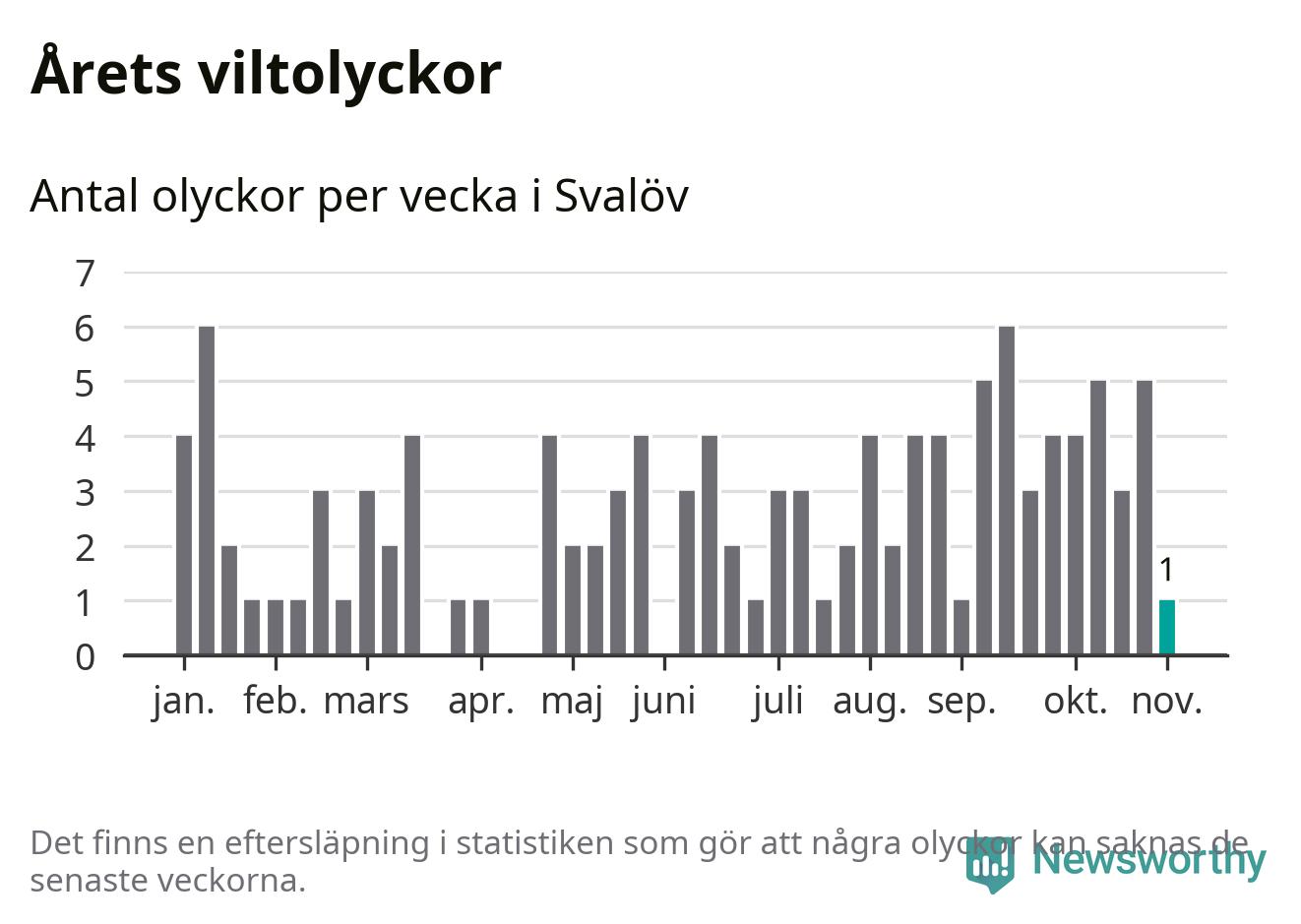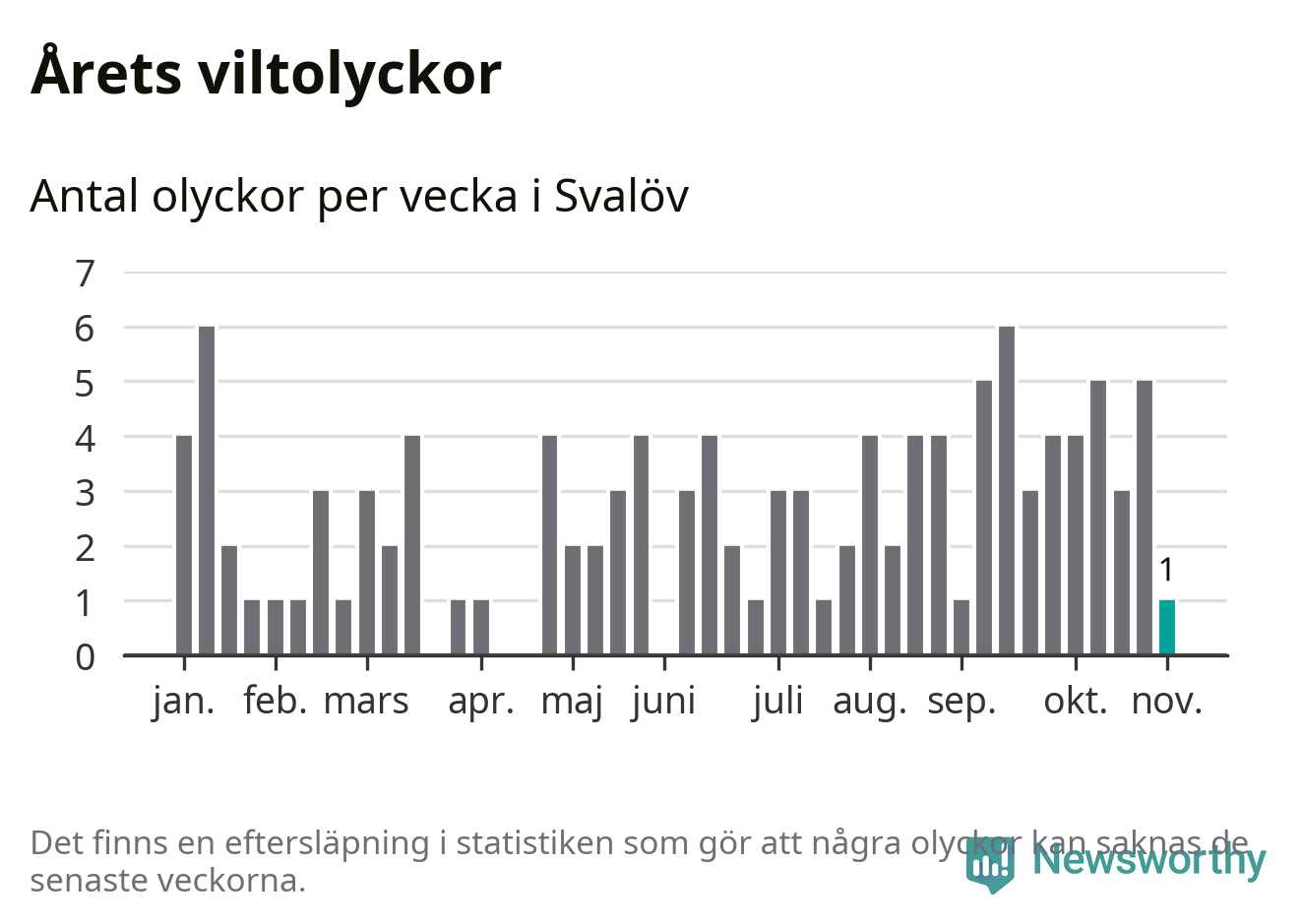 Från förra veckan (vecka 45) har hittills en viltolycka rapporterats in i Svalövs kommun.