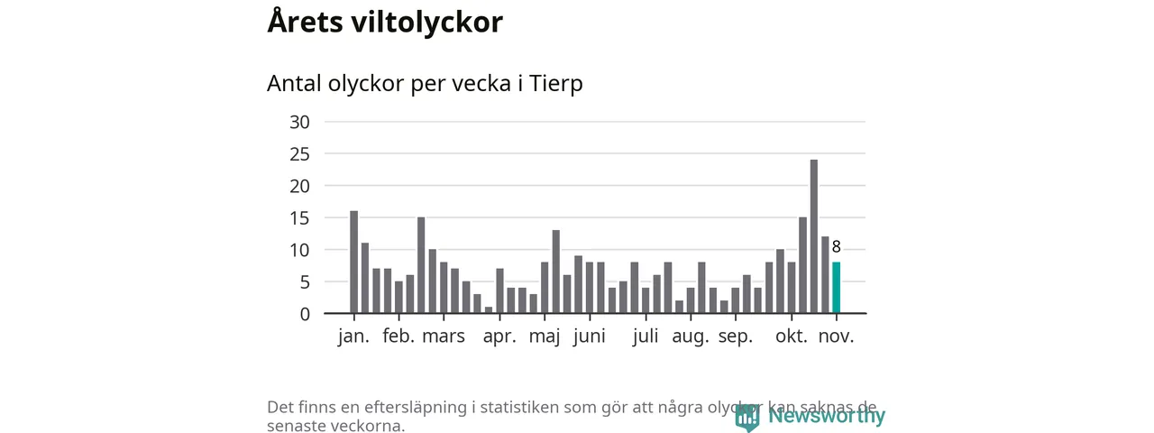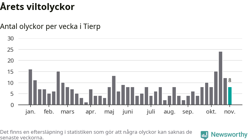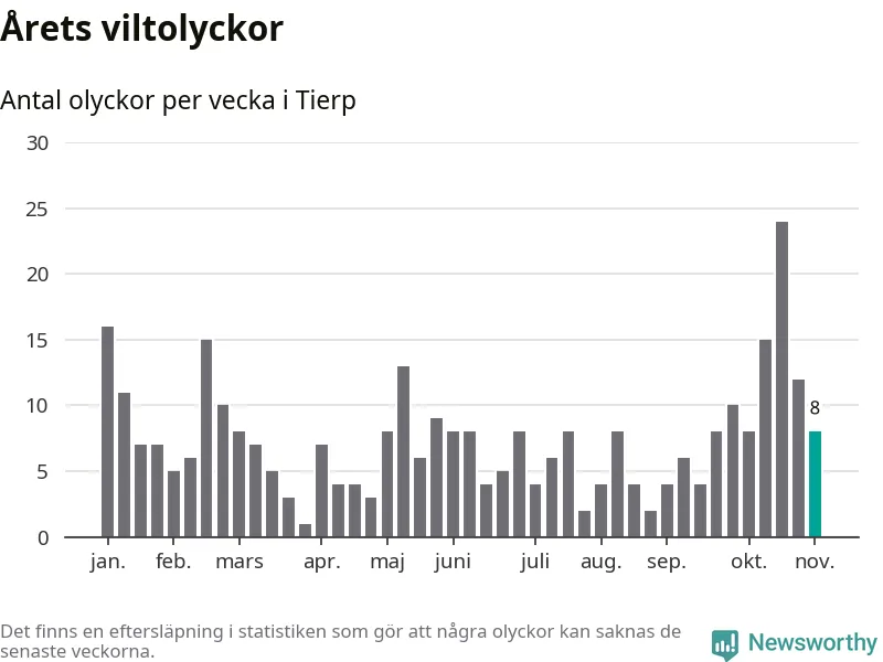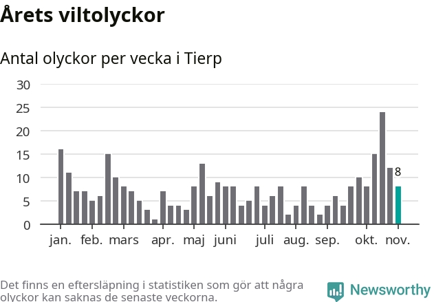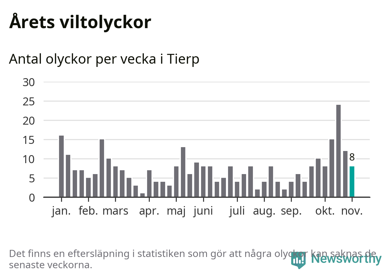 Hittills har åtta viltolyckor rapporterats in i Tierps kommun från vecka 45. Se listan här.