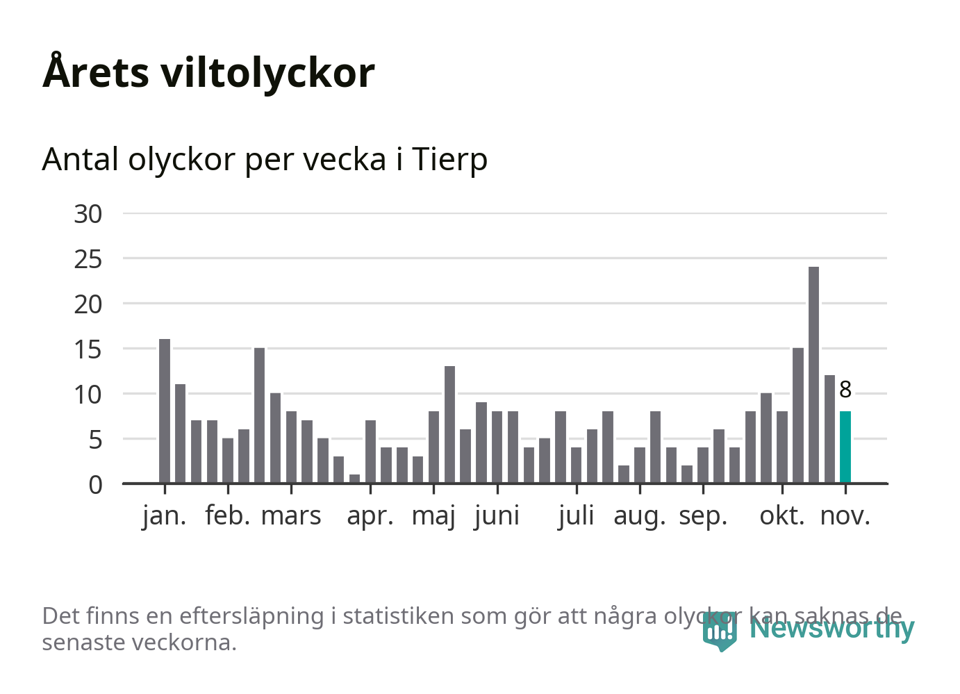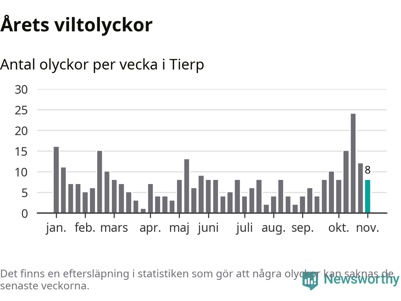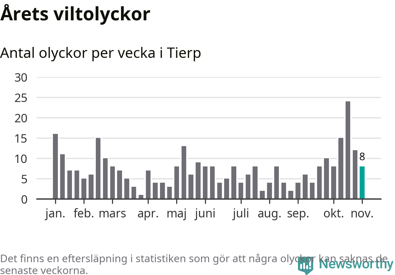 Hittills har åtta viltolyckor rapporterats in i Tierps kommun från vecka 45. Se listan här.