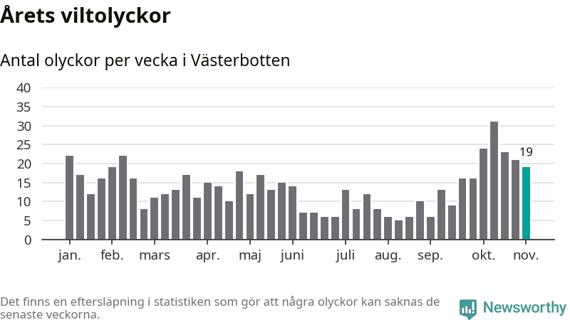 611 viltolyckor i länet. Det är en normal nivå i förhållande till hur det har sett ut under de senaste tio åren – genomsnittet för motsvarande period är 596.