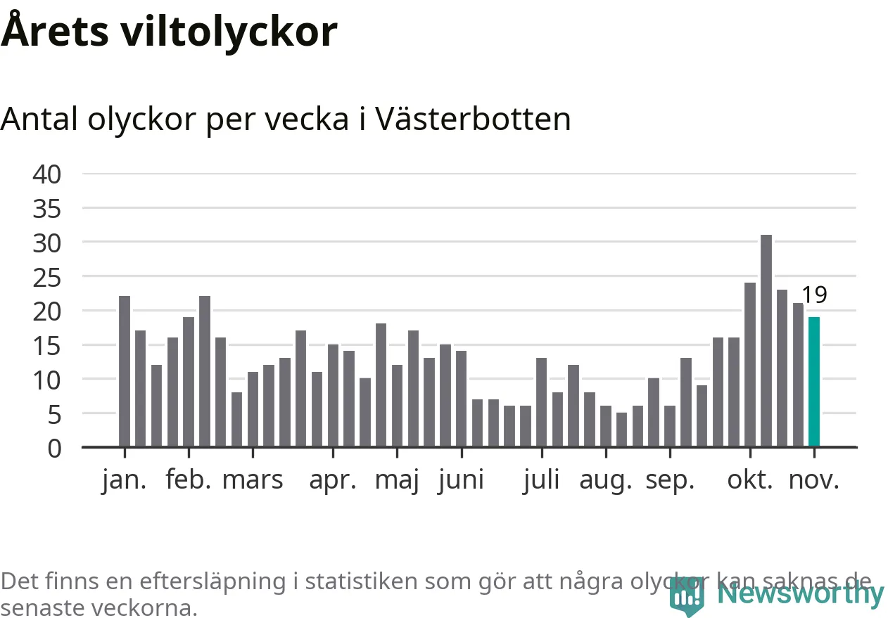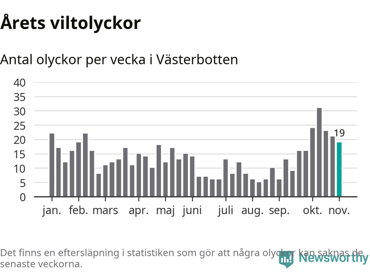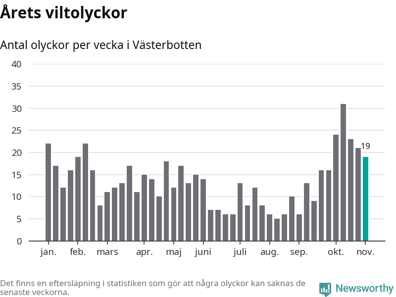 sett till de senaste tio årens statistik. I statistiken ingår inte olyckor med ren, som här räknas som tamdjur.