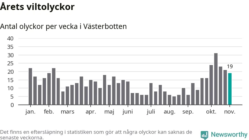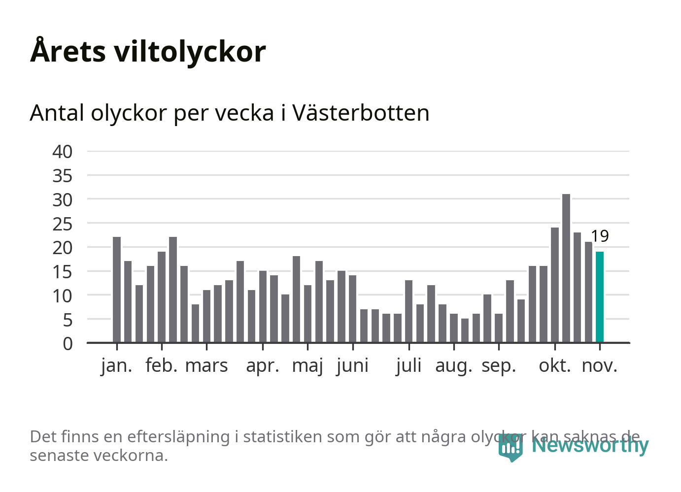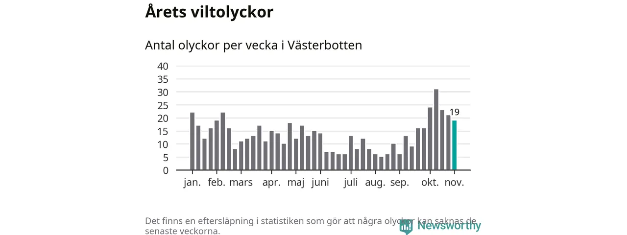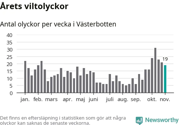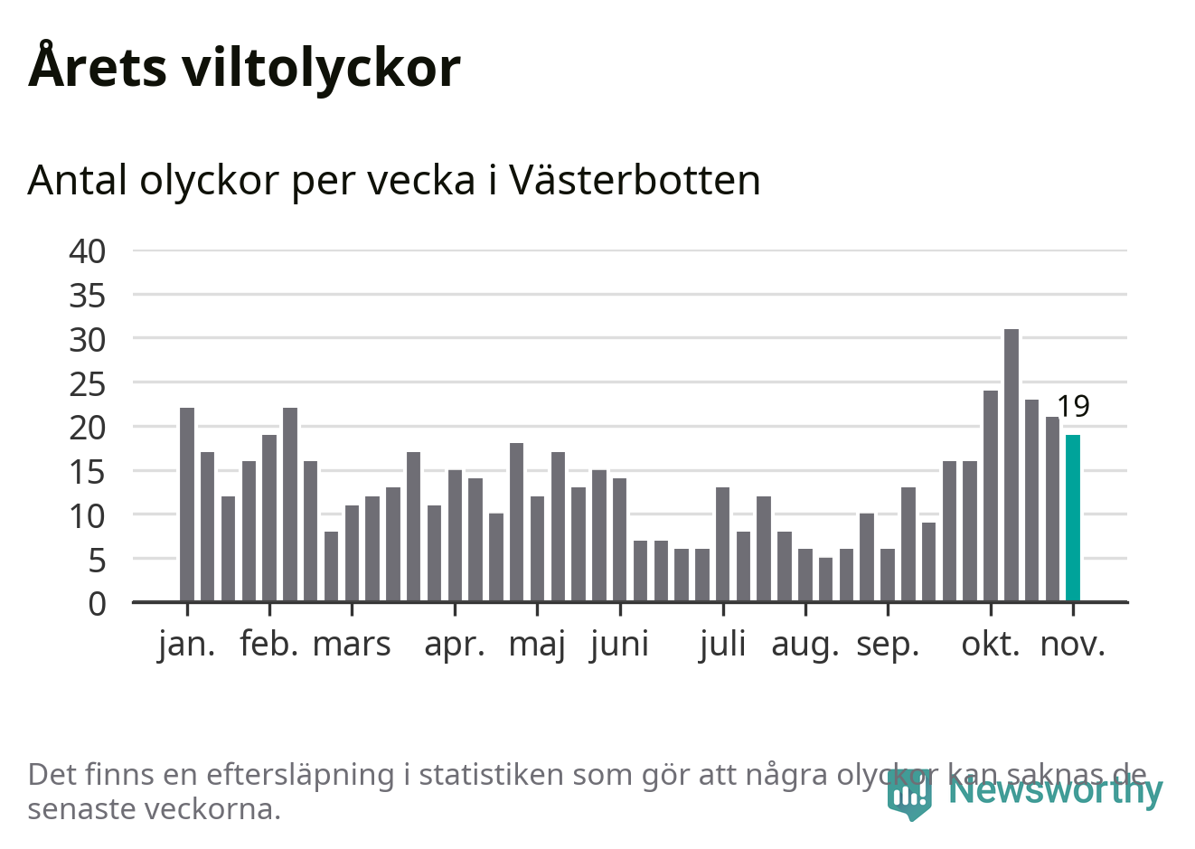 sett till de senaste tio årens statistik. I statistiken ingår inte olyckor med ren, som här räknas som tamdjur.
