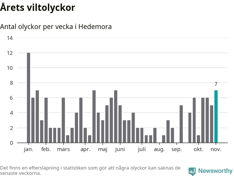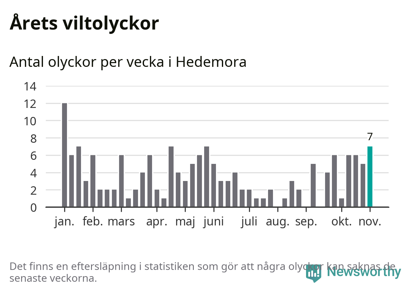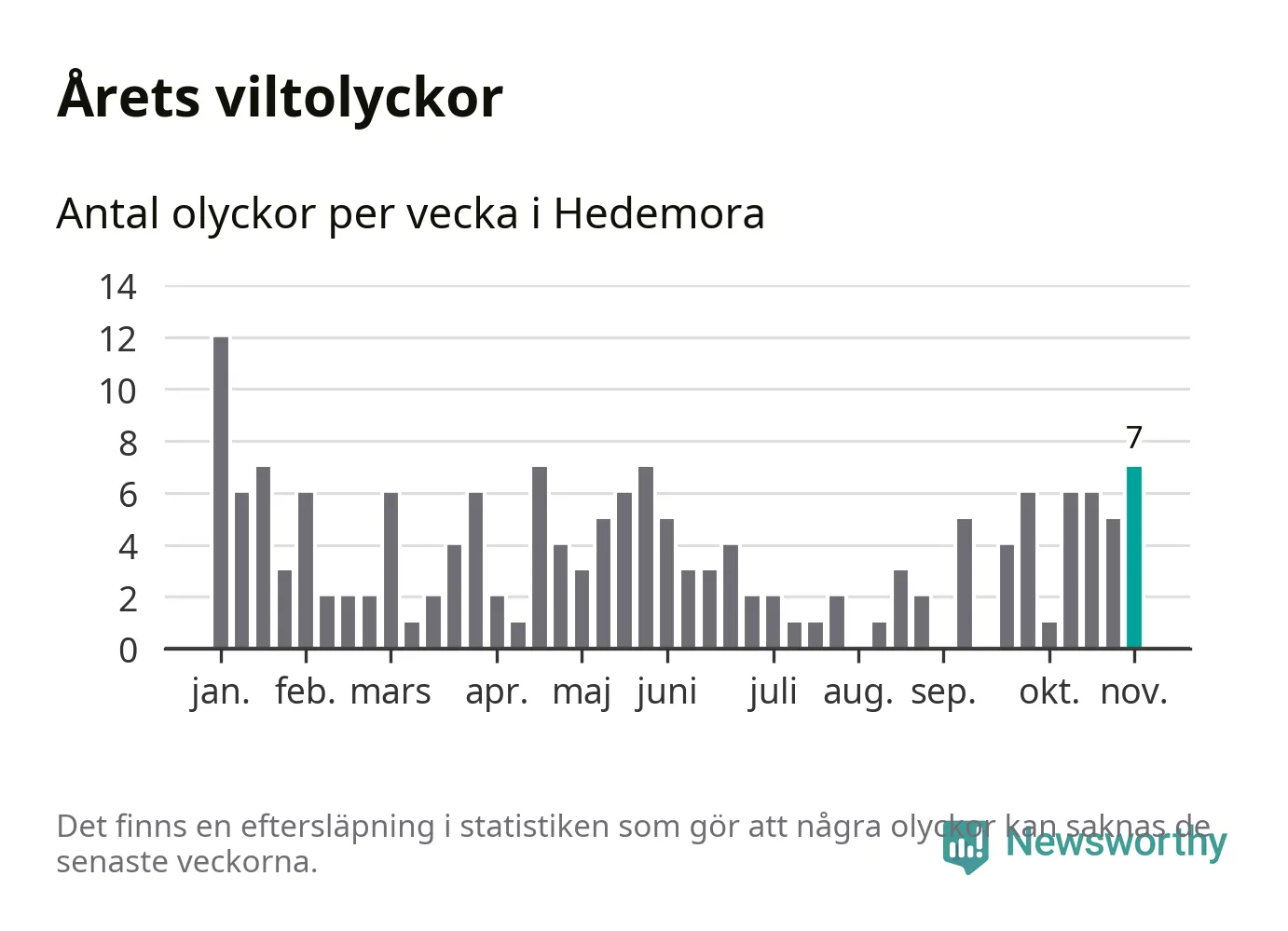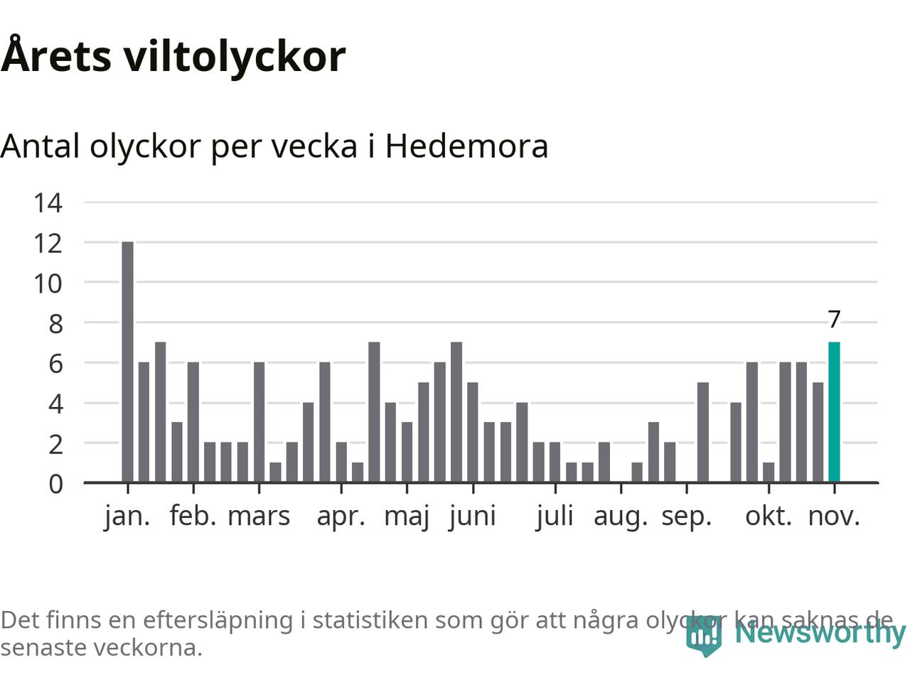 Hittills har sju viltolyckor rapporterats in i Hedemora kommun från vecka 45. Se listan här.