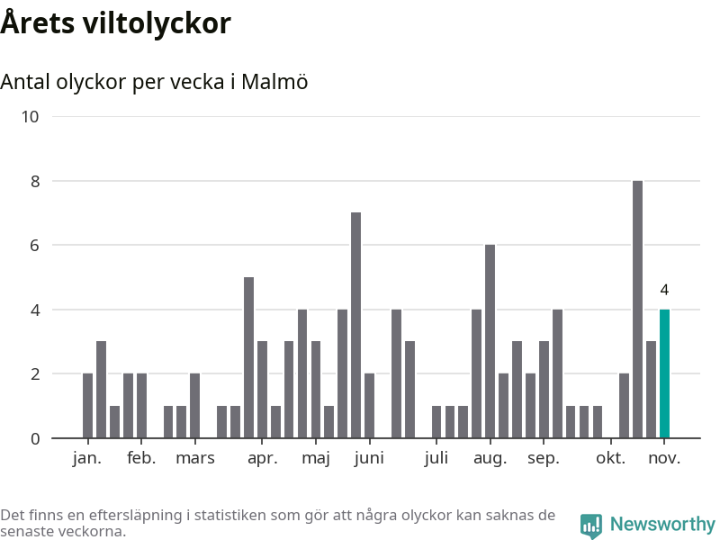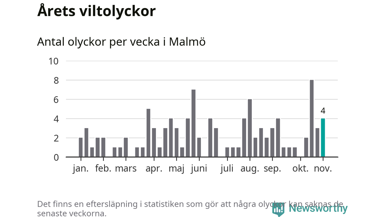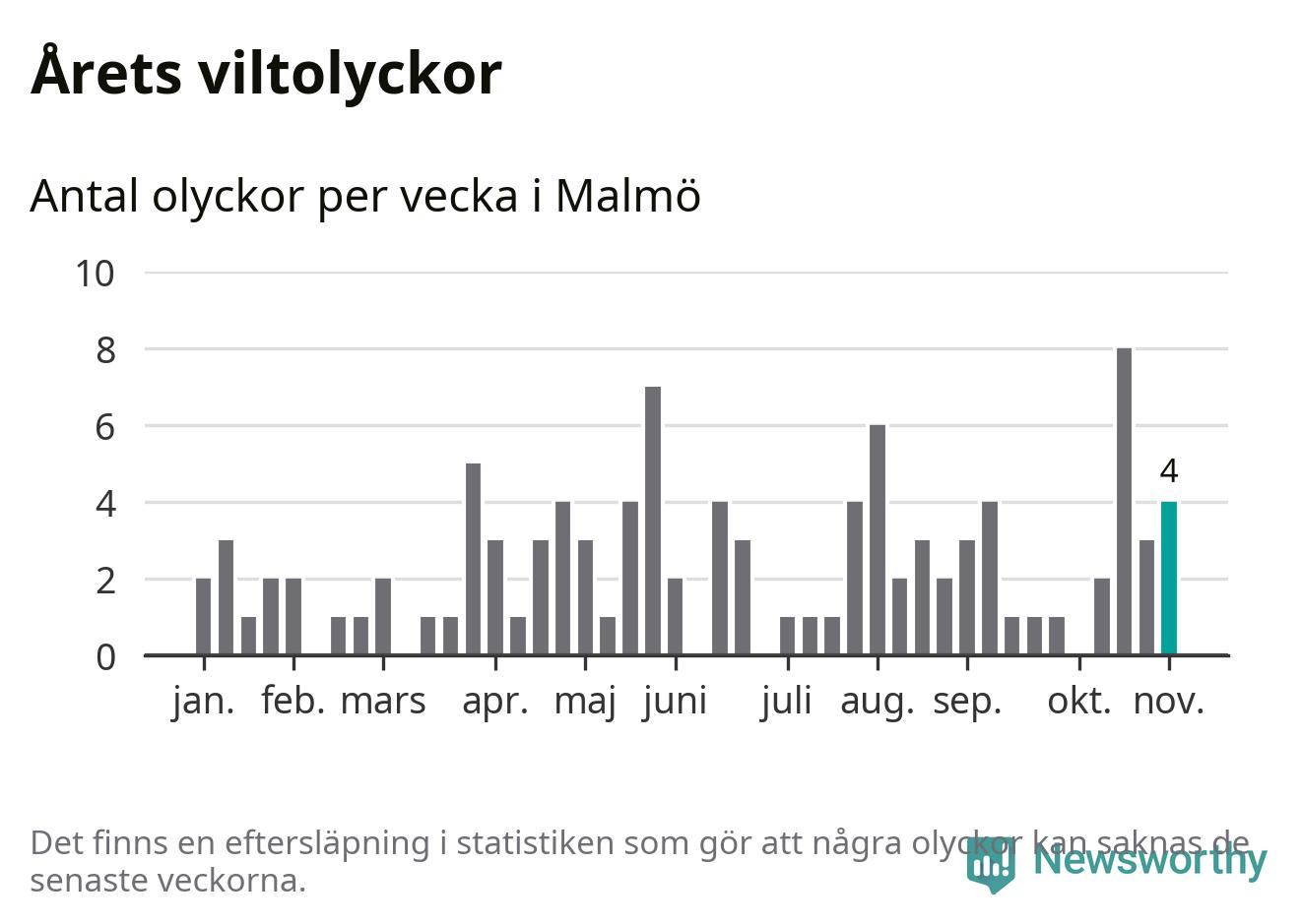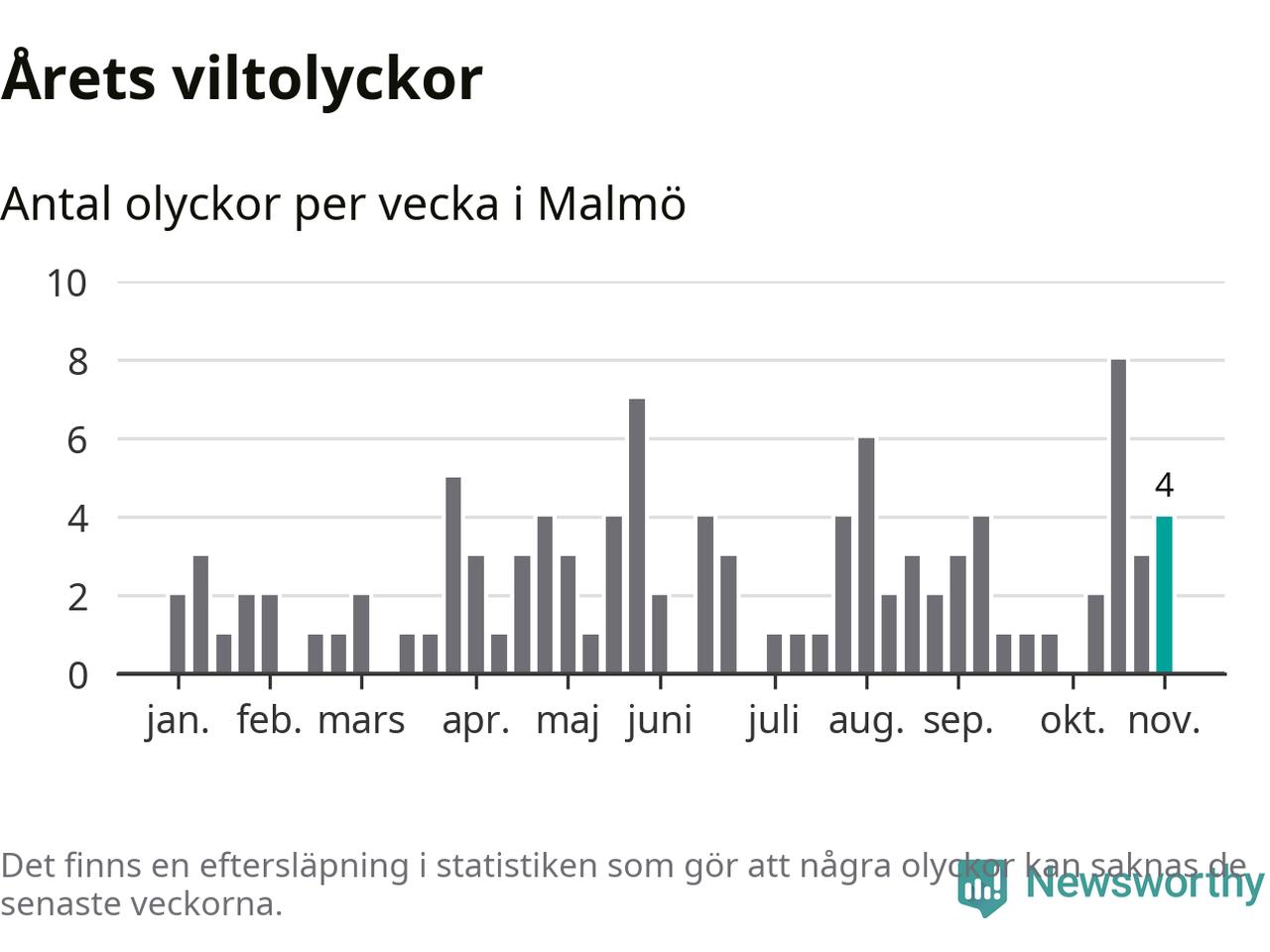 Hittills har fyra viltolyckor rapporterats in i Malmö kommun från vecka 45. Se listan här.