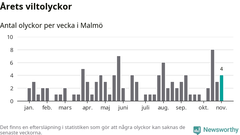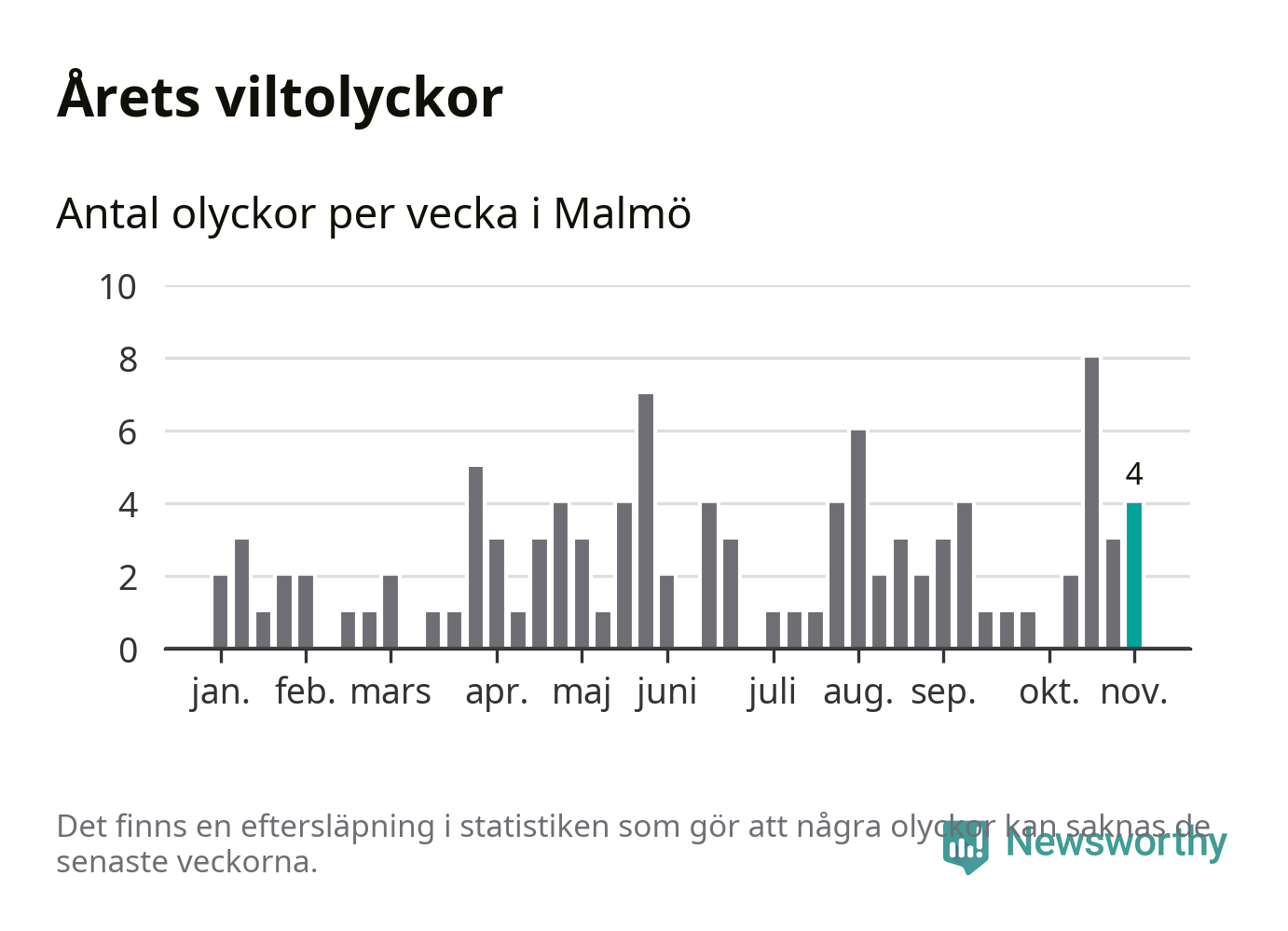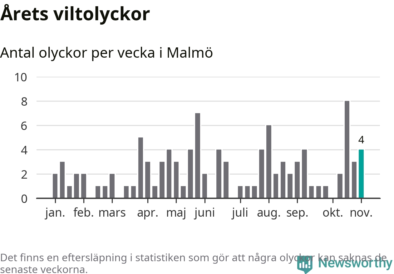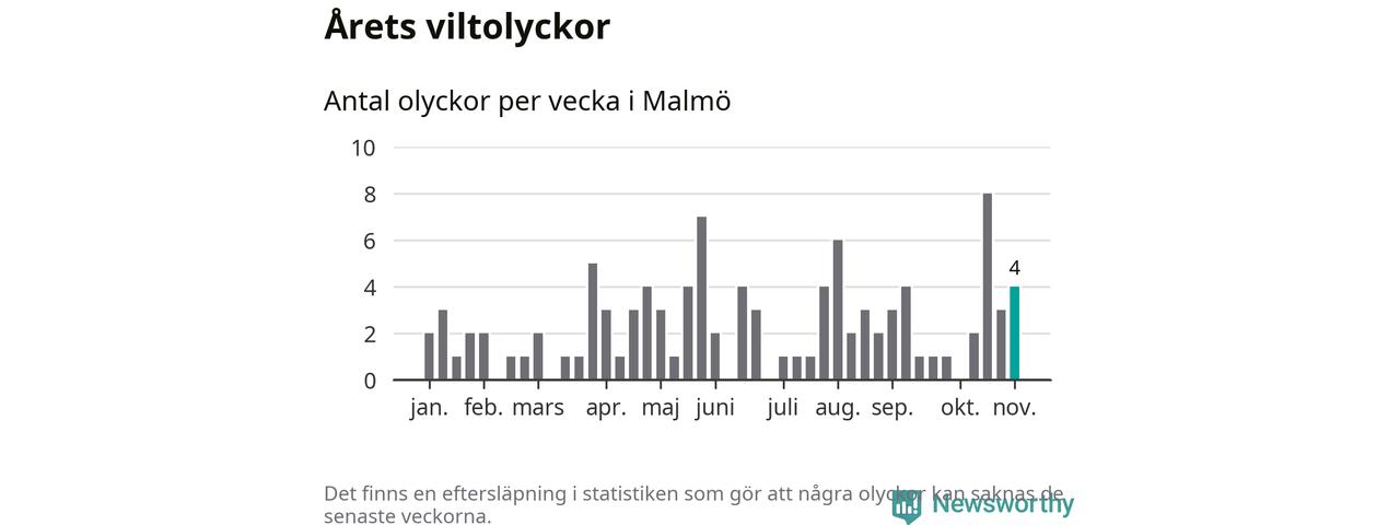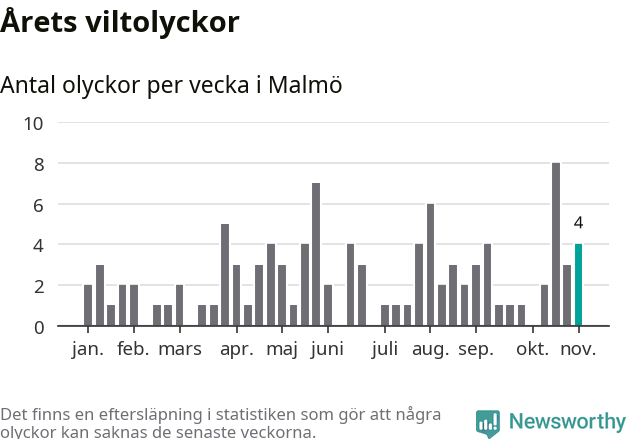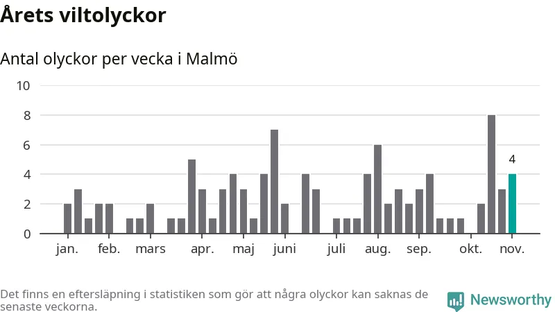 Hittills har fyra viltolyckor rapporterats in i Malmö kommun från vecka 45. Se listan här.