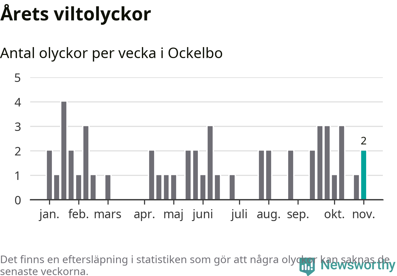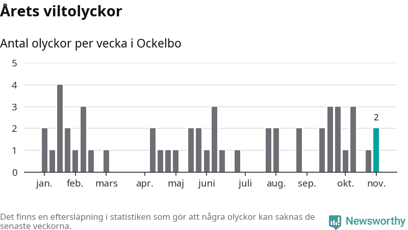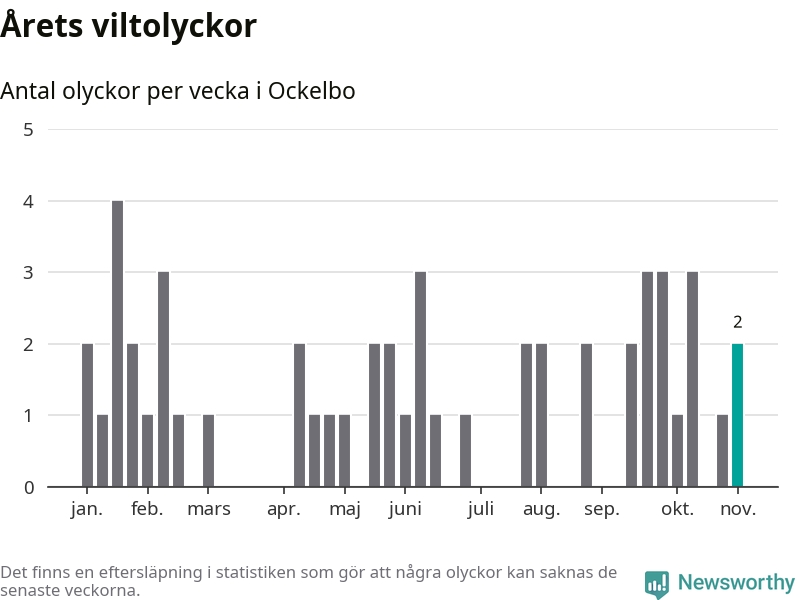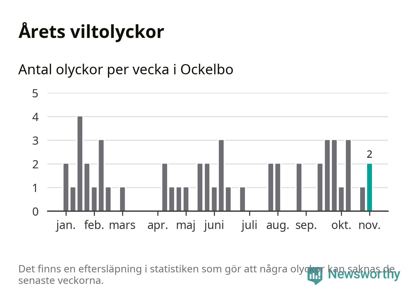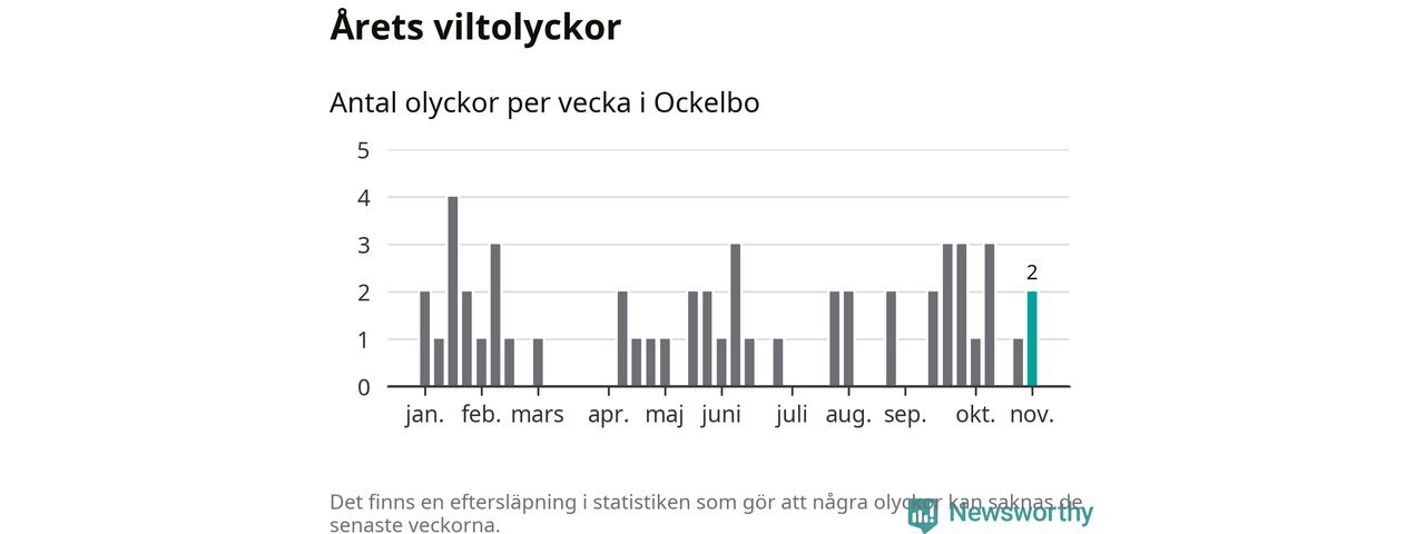 Hittills har två viltolyckor rapporterats in i Ockelbo kommun från vecka 45. Se listan här.