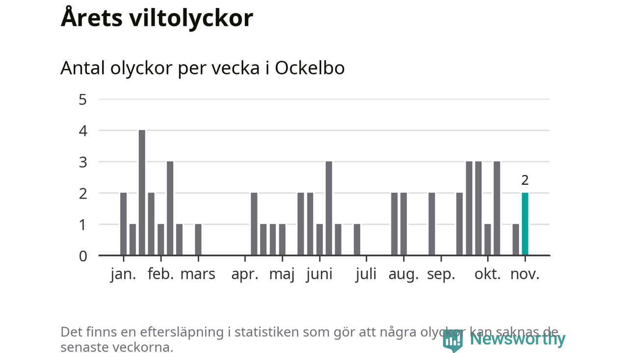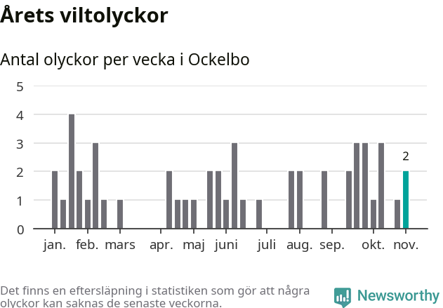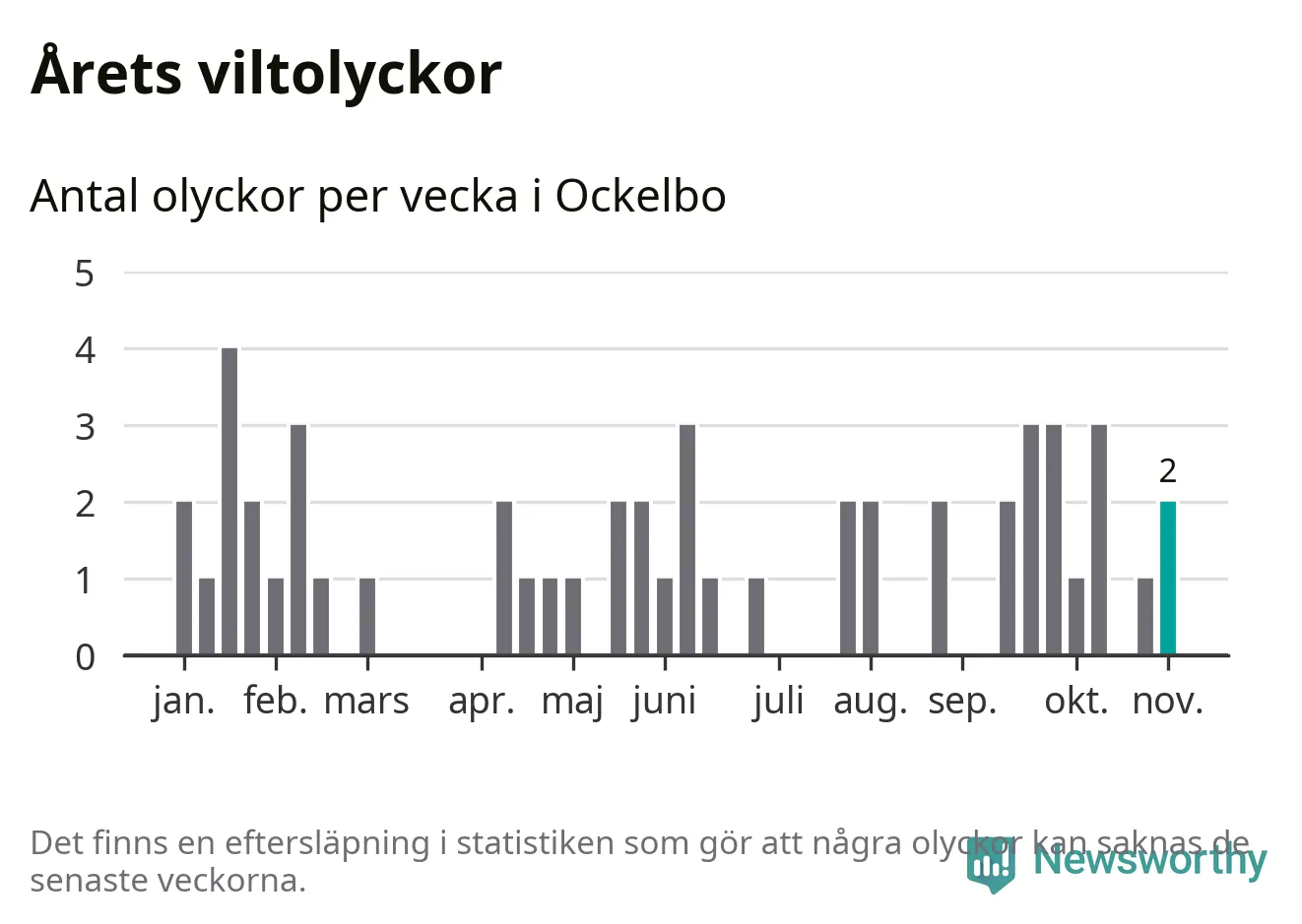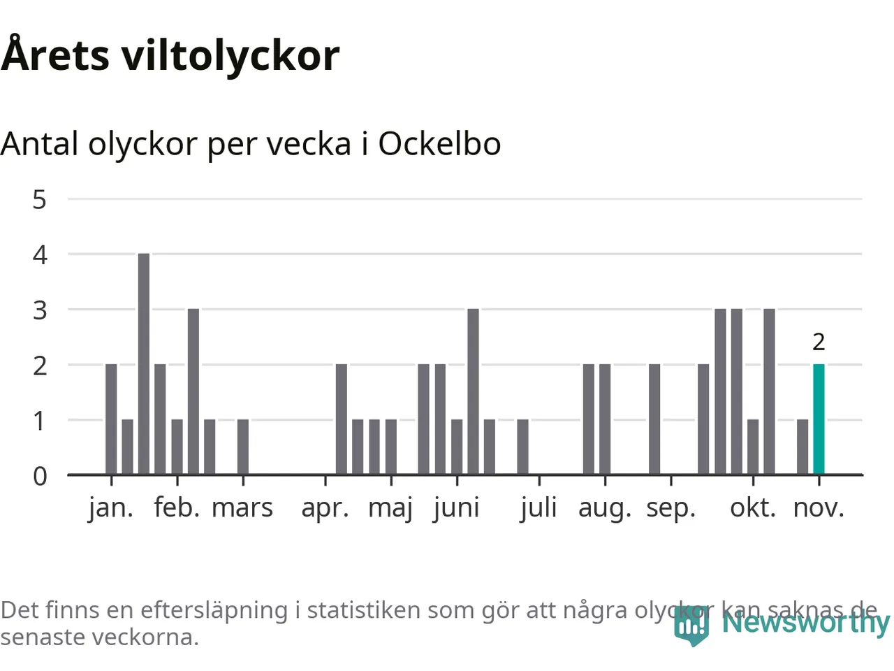 Hittills har två viltolyckor rapporterats in i Ockelbo kommun från vecka 45. Se listan här.