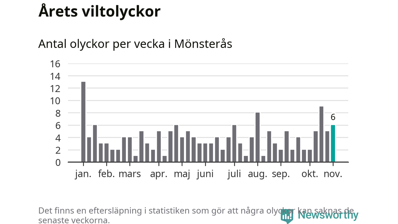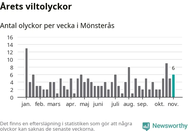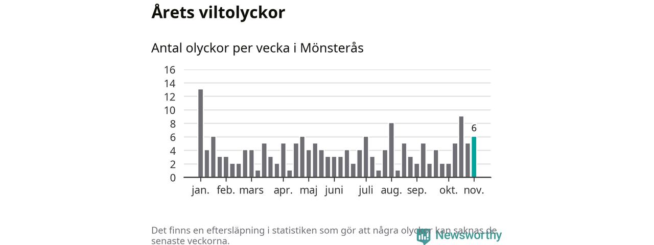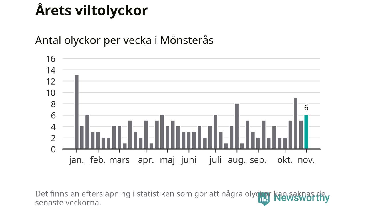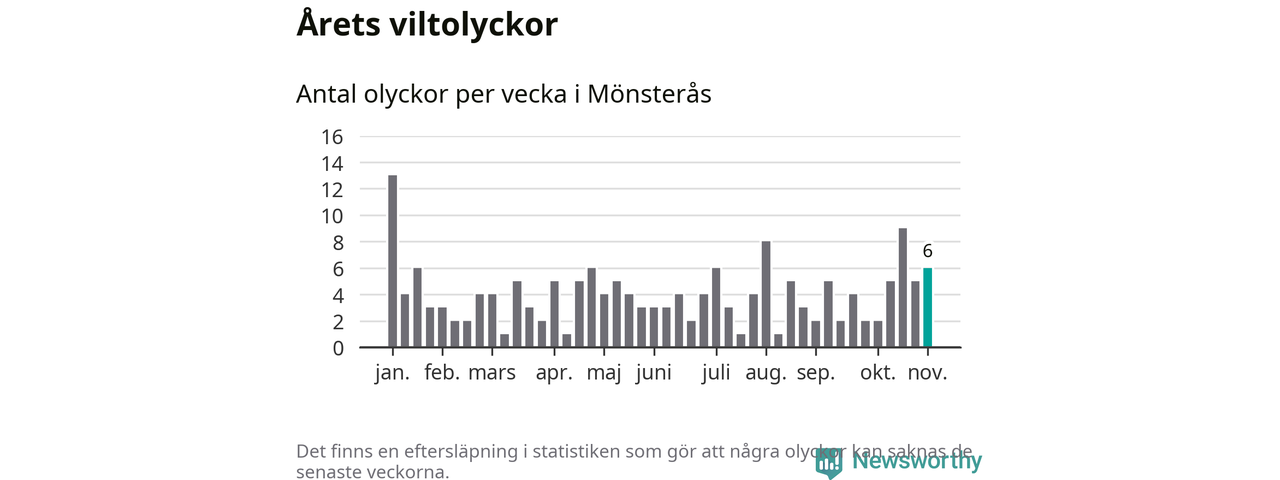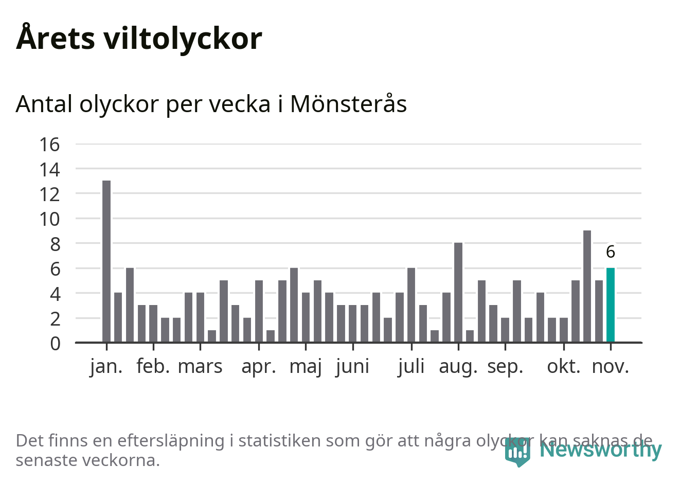Hittills har sex viltolyckor rapporterats in i Mönsterås kommun från vecka 45. Se listan här.