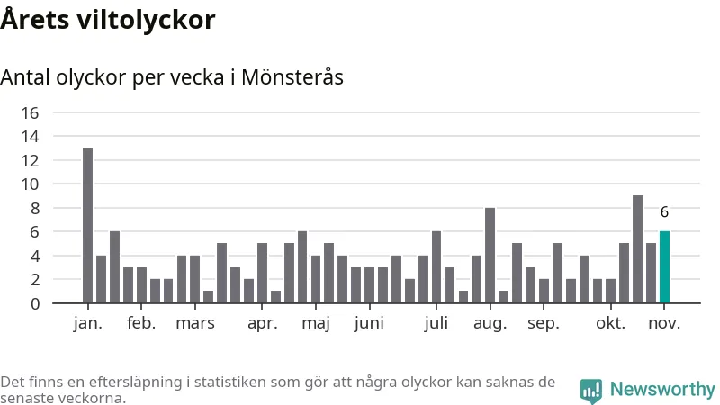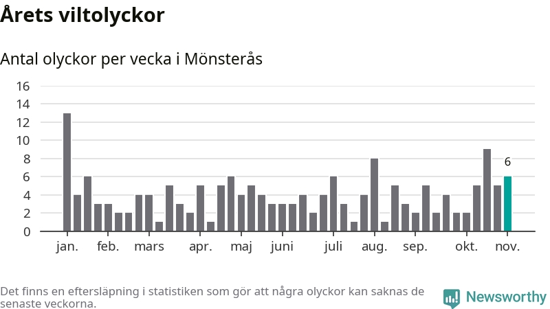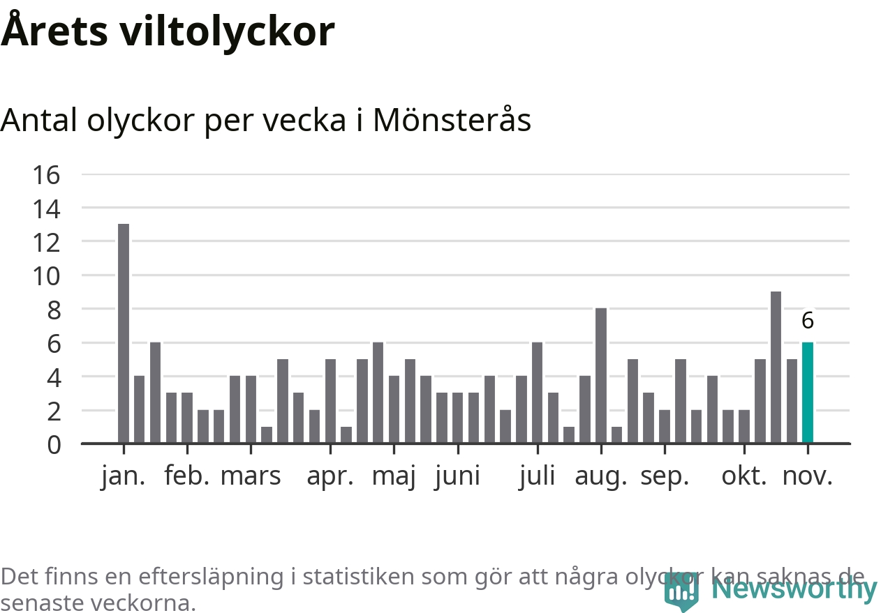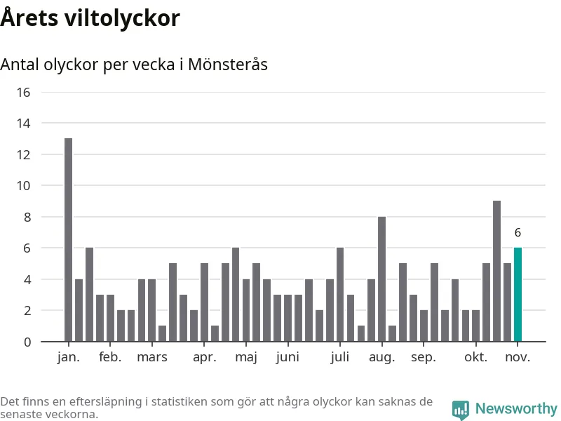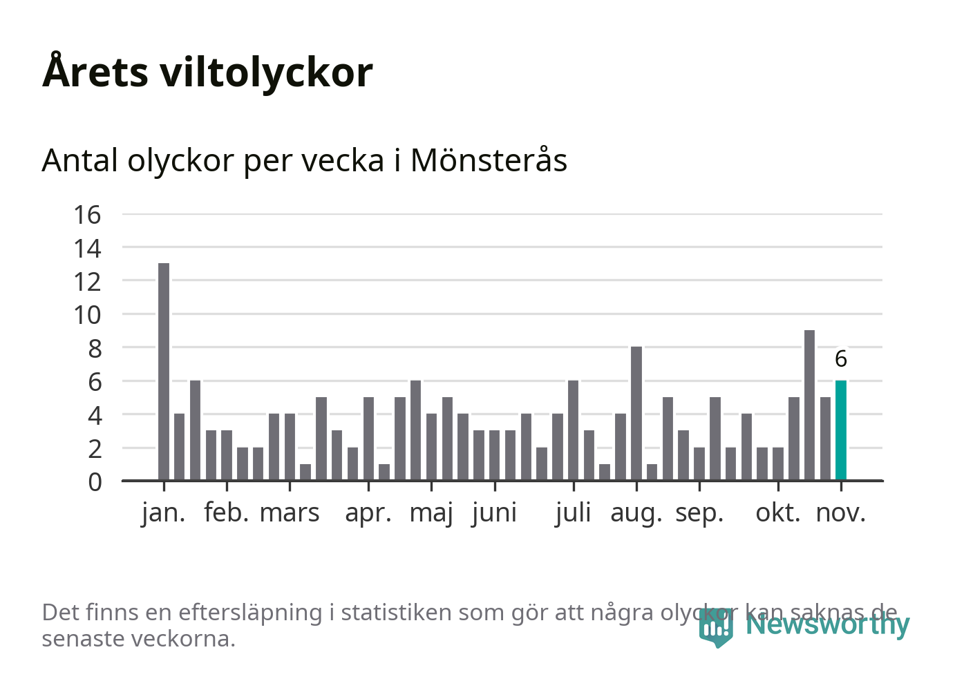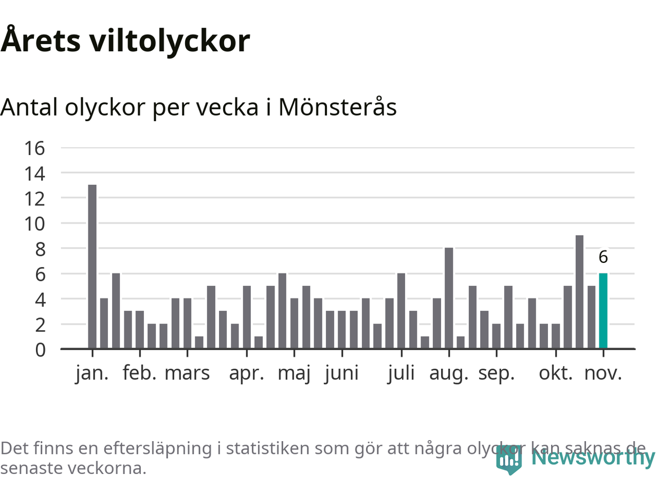 Hittills har sex viltolyckor rapporterats in i Mönsterås kommun från vecka 45. Se listan här.