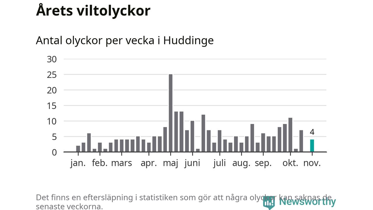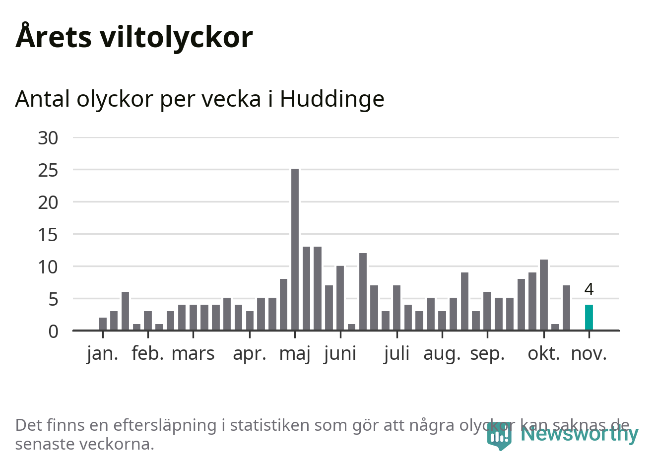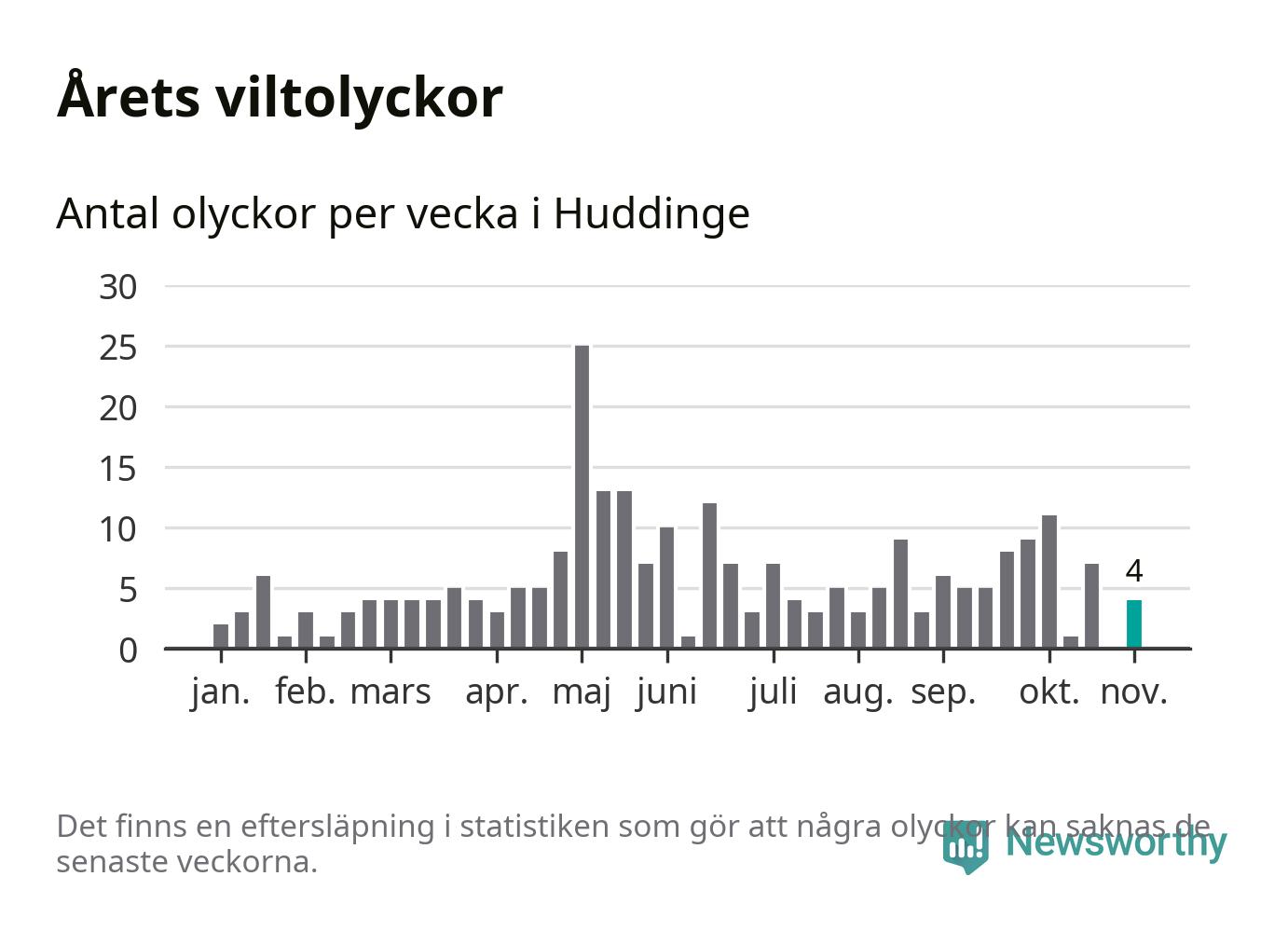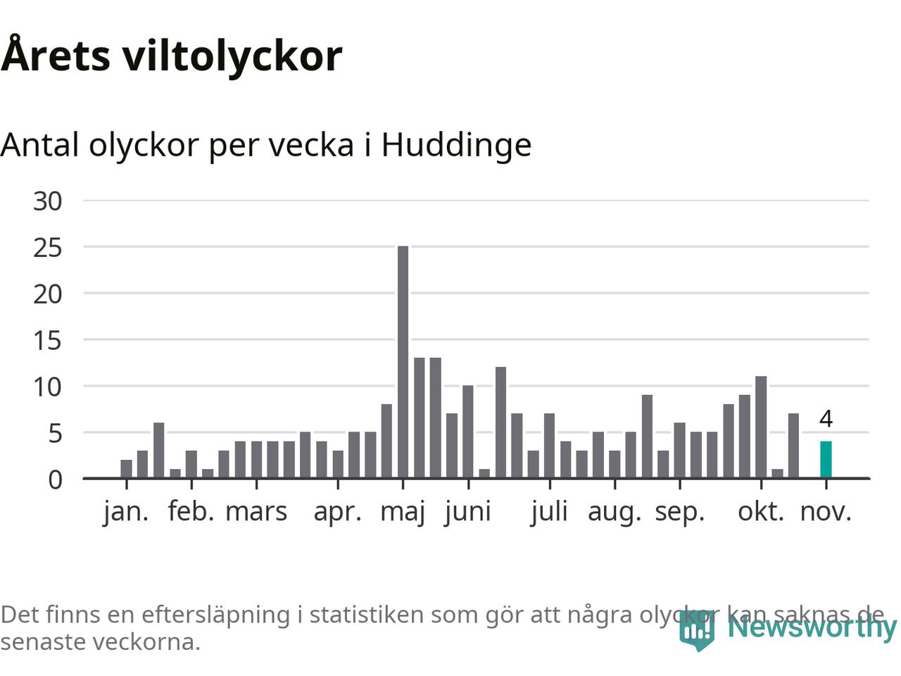 Hittills har fyra viltolyckor rapporterats in i Huddinge kommun från vecka 45. Se listan här.