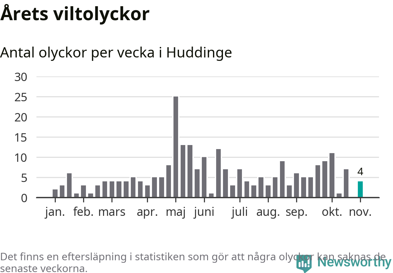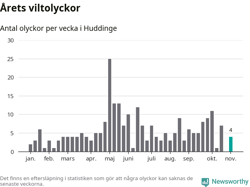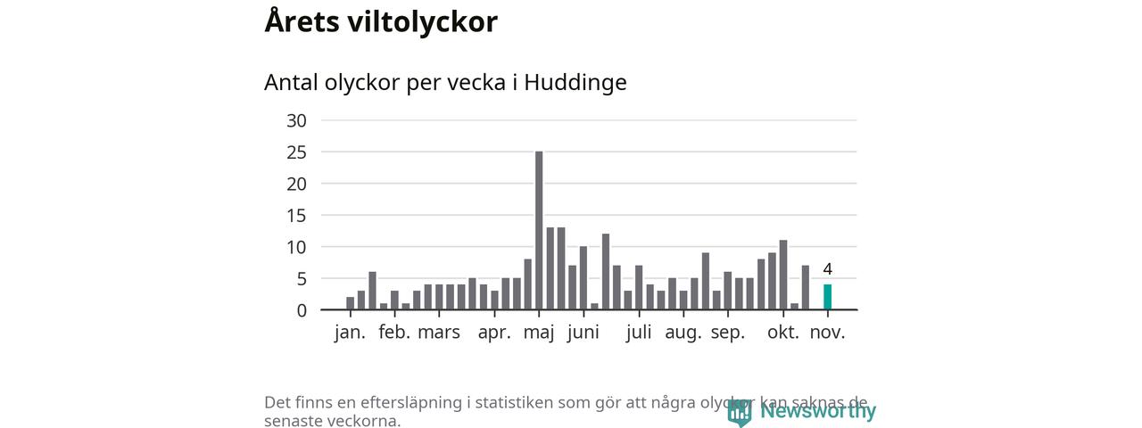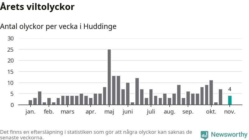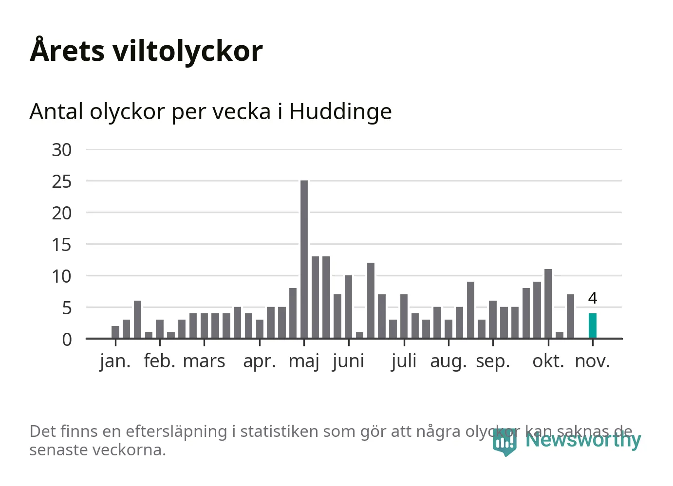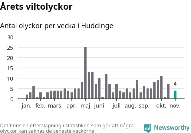 Hittills har fyra viltolyckor rapporterats in i Huddinge kommun från vecka 45. Se listan här.
