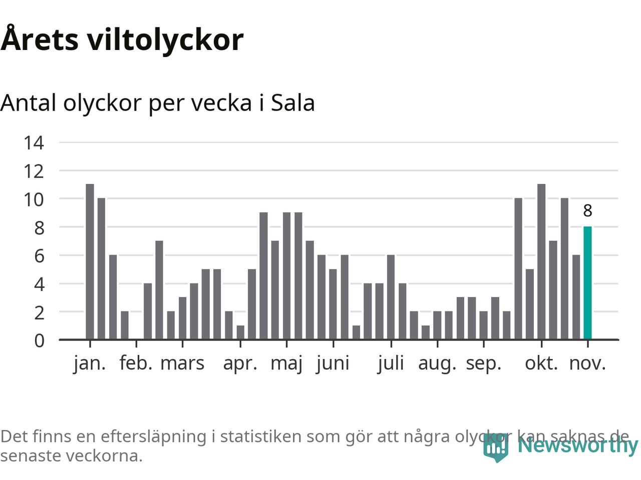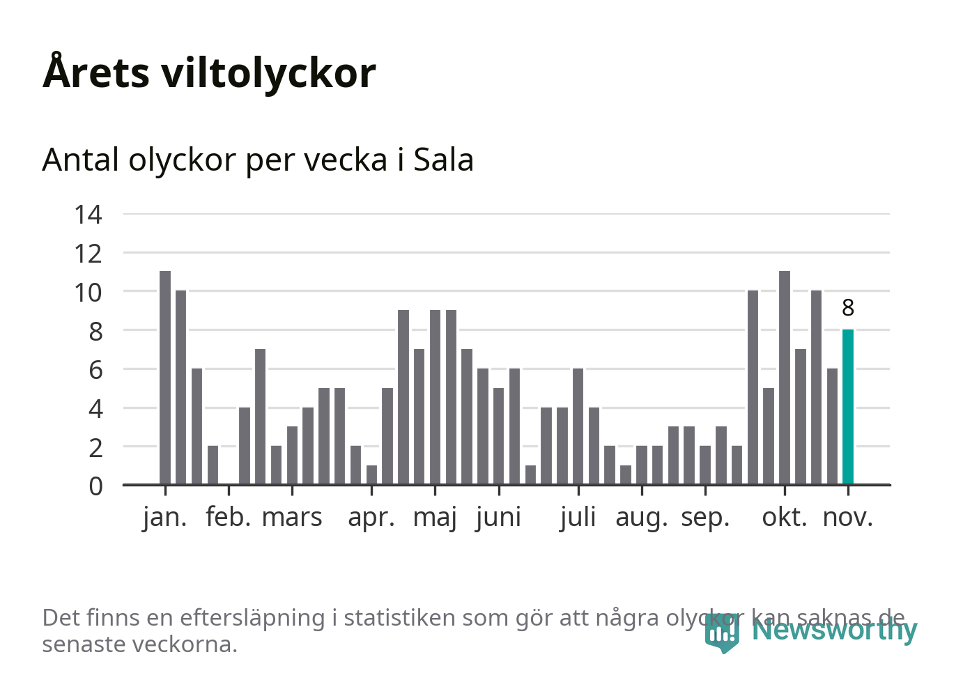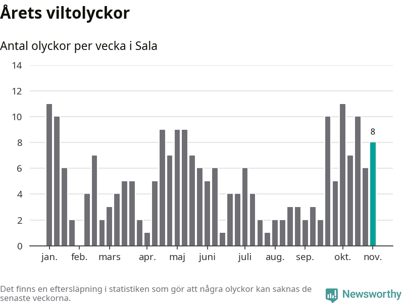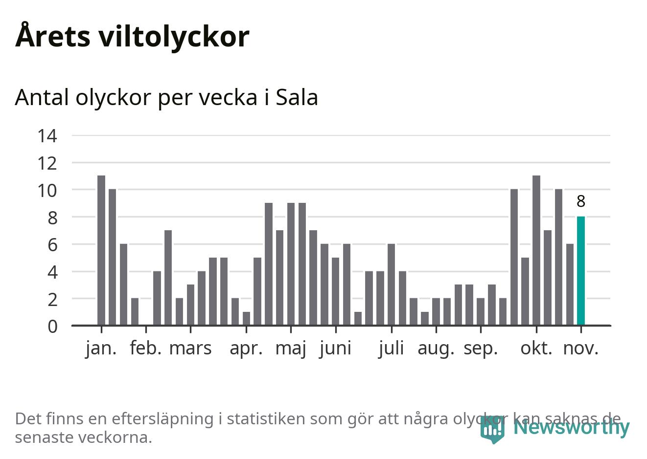 Hittills har åtta viltolyckor rapporterats in i Sala kommun från vecka 45. Se listan här.