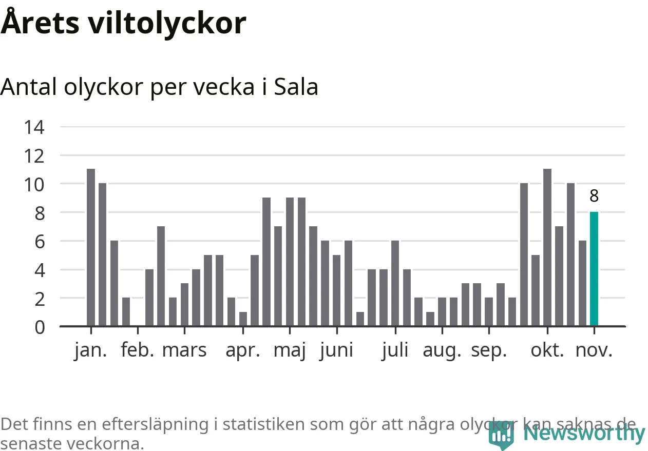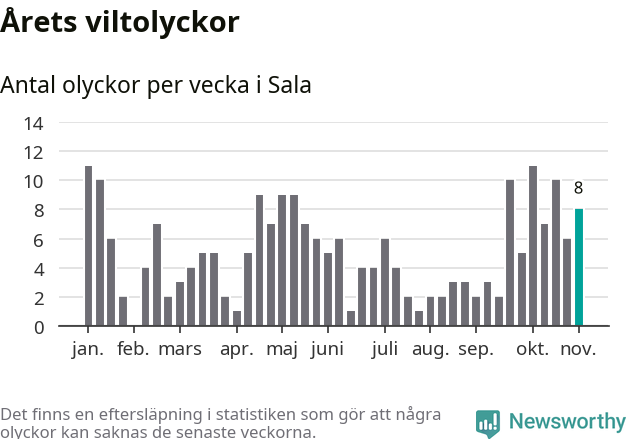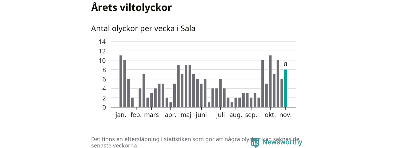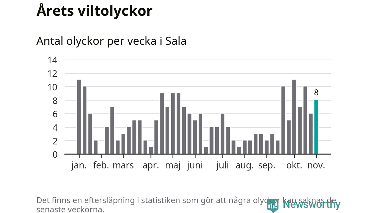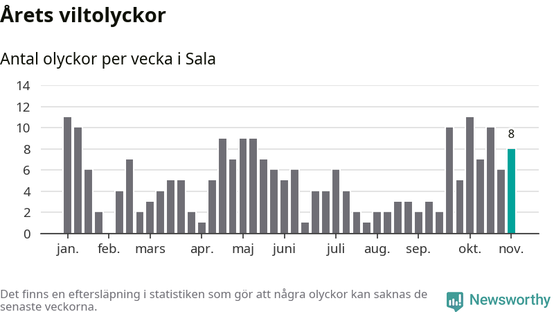 Hittills har åtta viltolyckor rapporterats in i Sala kommun från vecka 45. Se listan här.
