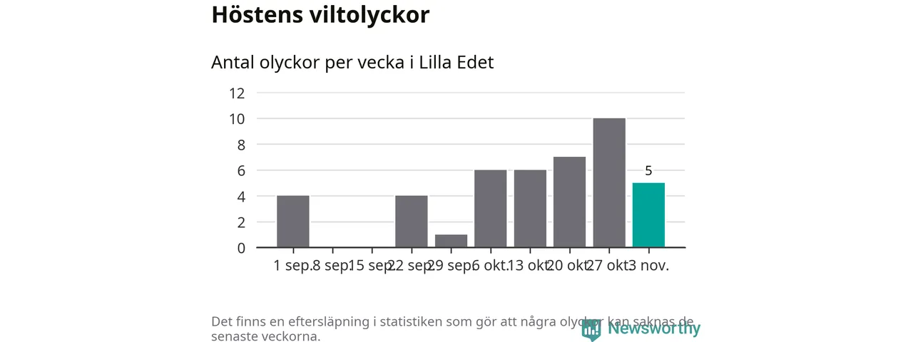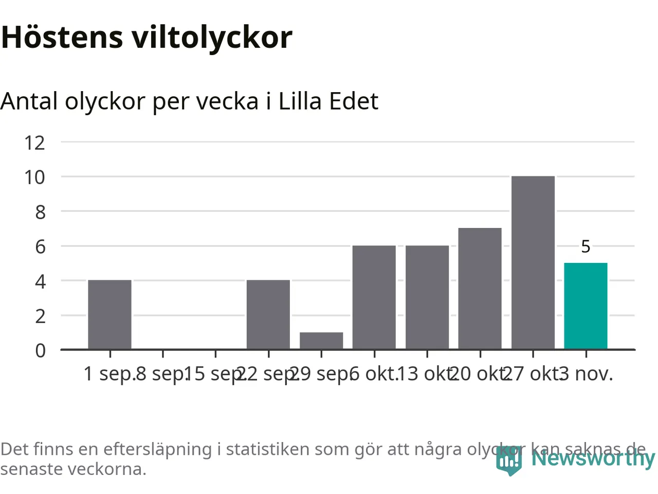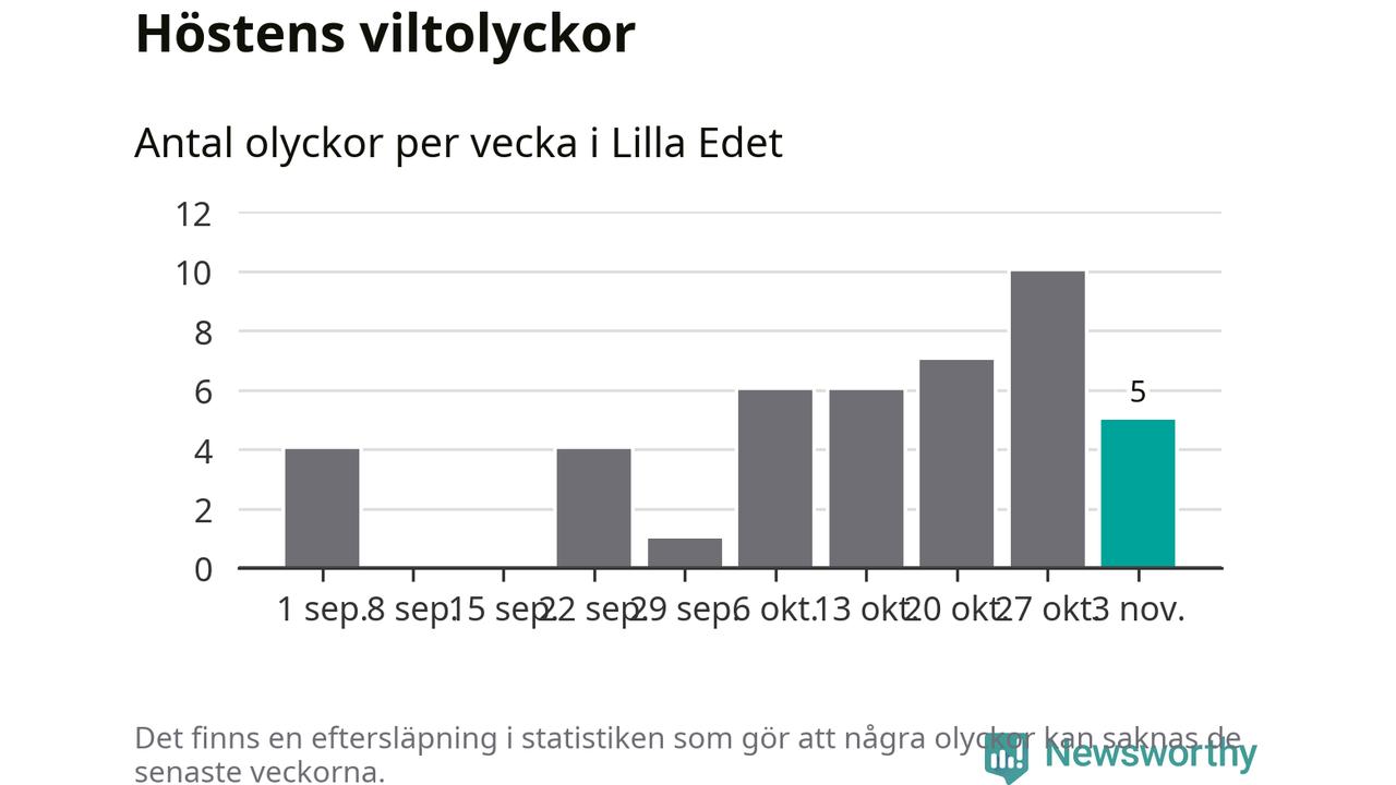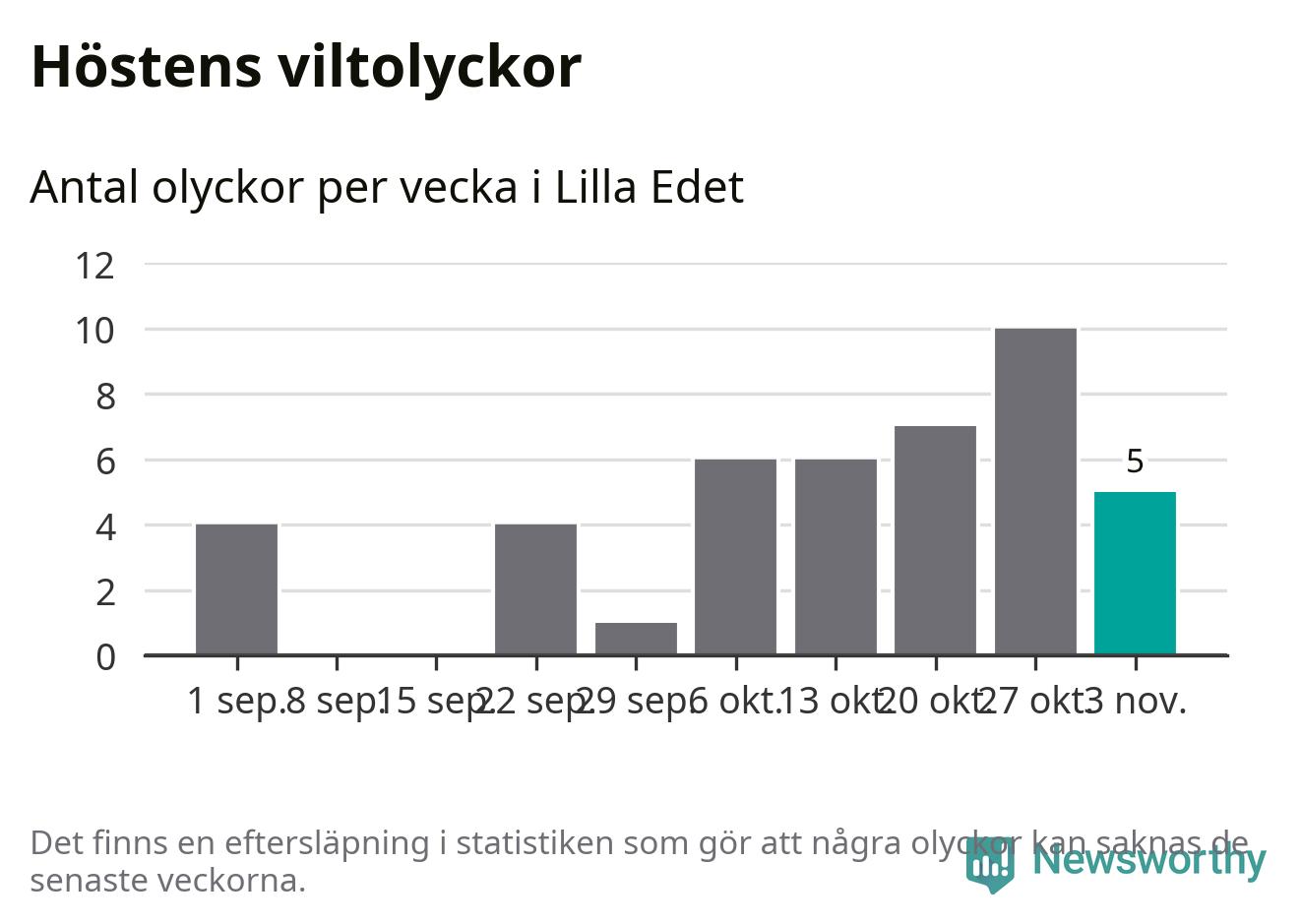 Under vecka 45 rapporterades fem viltolyckor in i Lilla Edets kommun. Därmed har det inträffat fler viltolyckor hittills den här hösten, än det brukar göra en hel genomsnittlig höst.