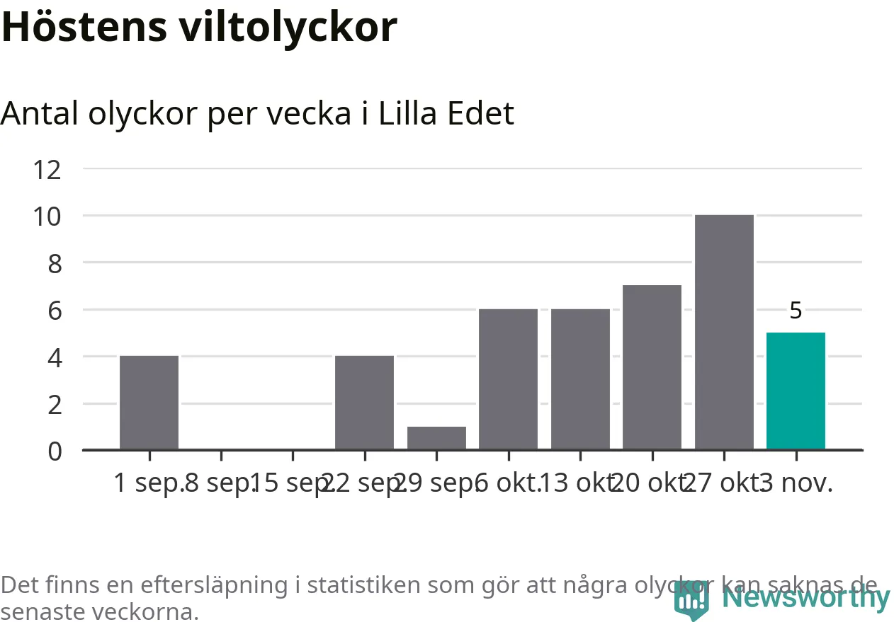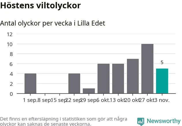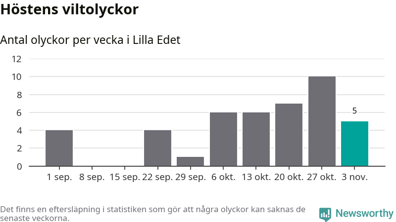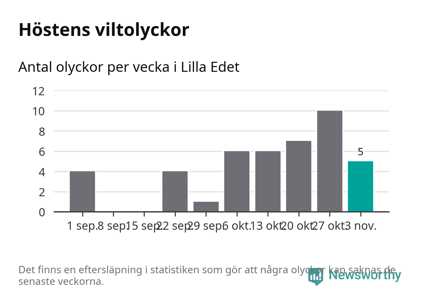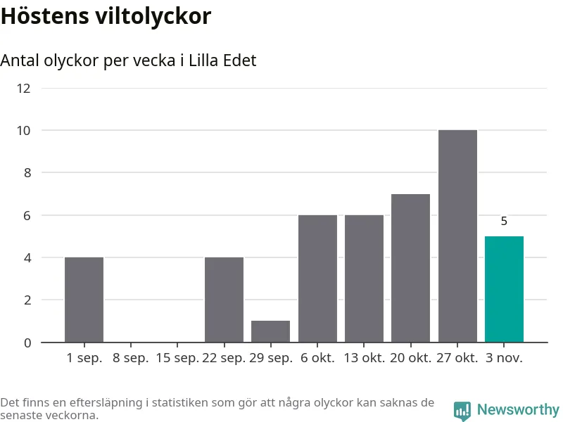 Under vecka 45 rapporterades fem viltolyckor in i Lilla Edets kommun. Därmed har det inträffat fler viltolyckor hittills den här hösten, än det brukar göra en hel genomsnittlig höst.