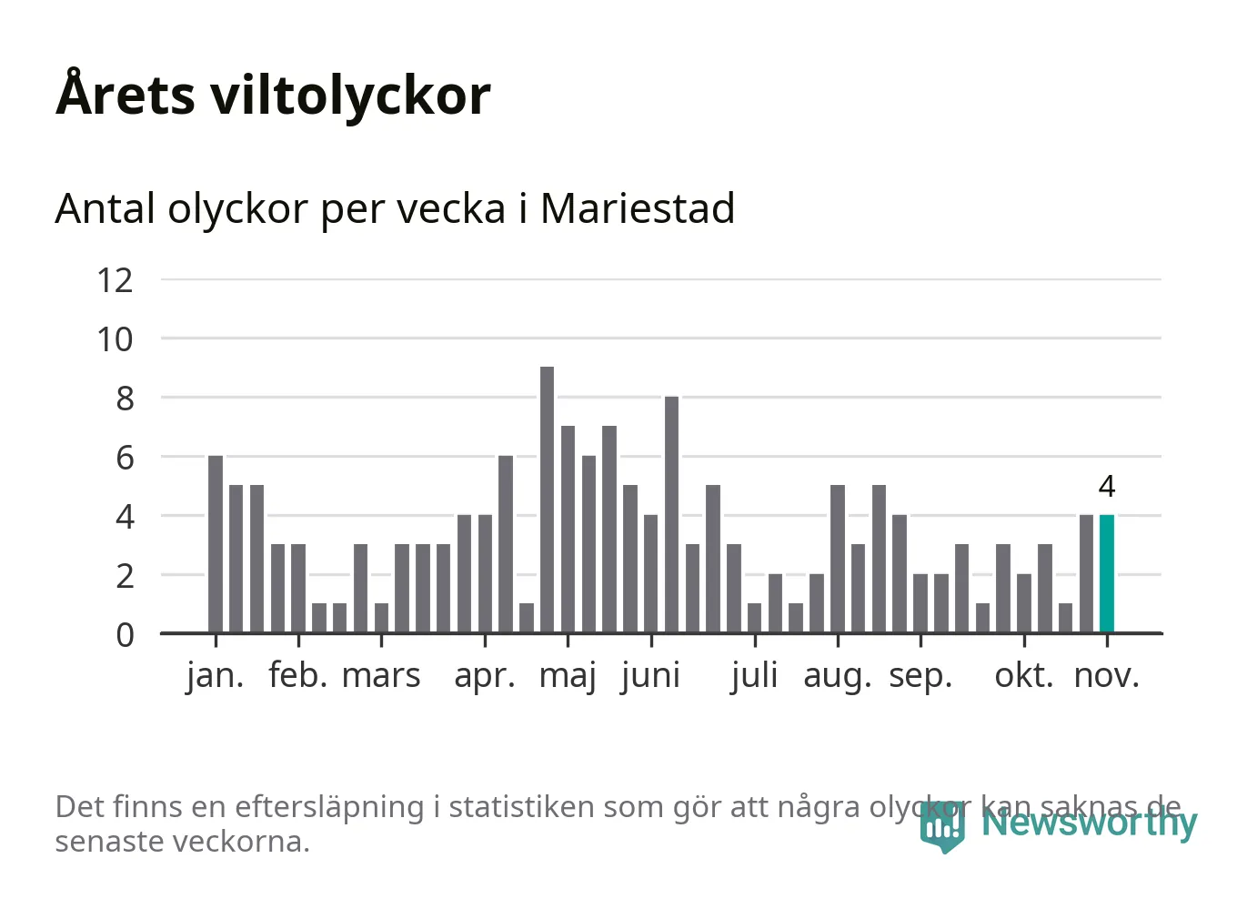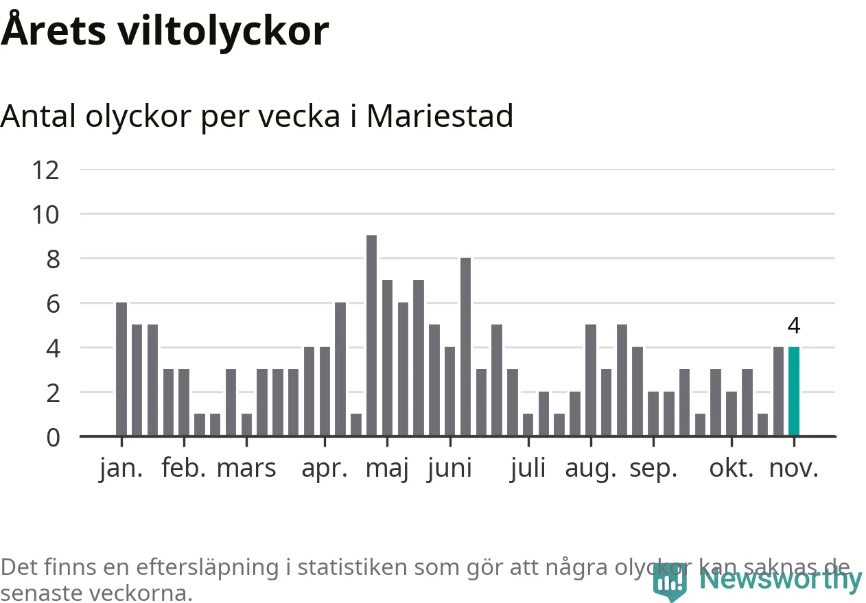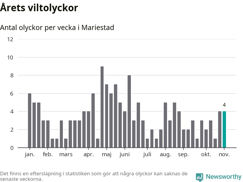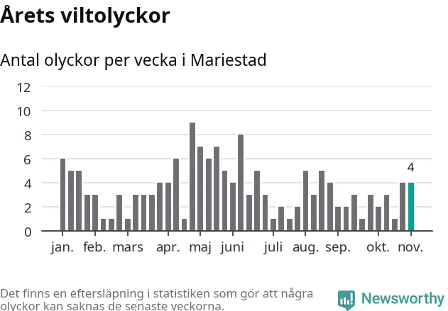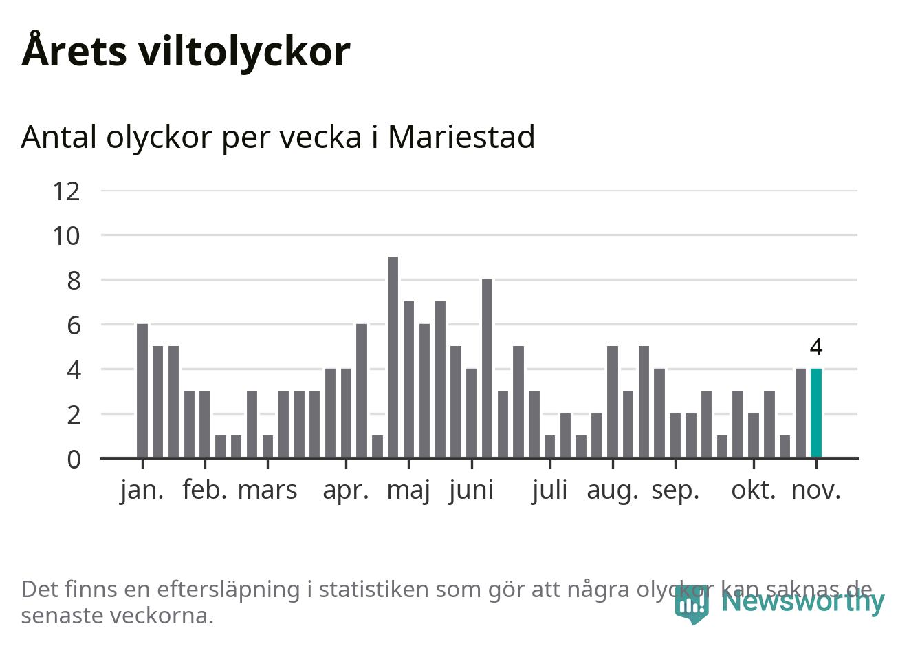 Hittills har fyra viltolyckor rapporterats in i Mariestads kommun från vecka 45. Se listan här.