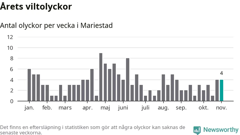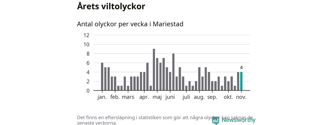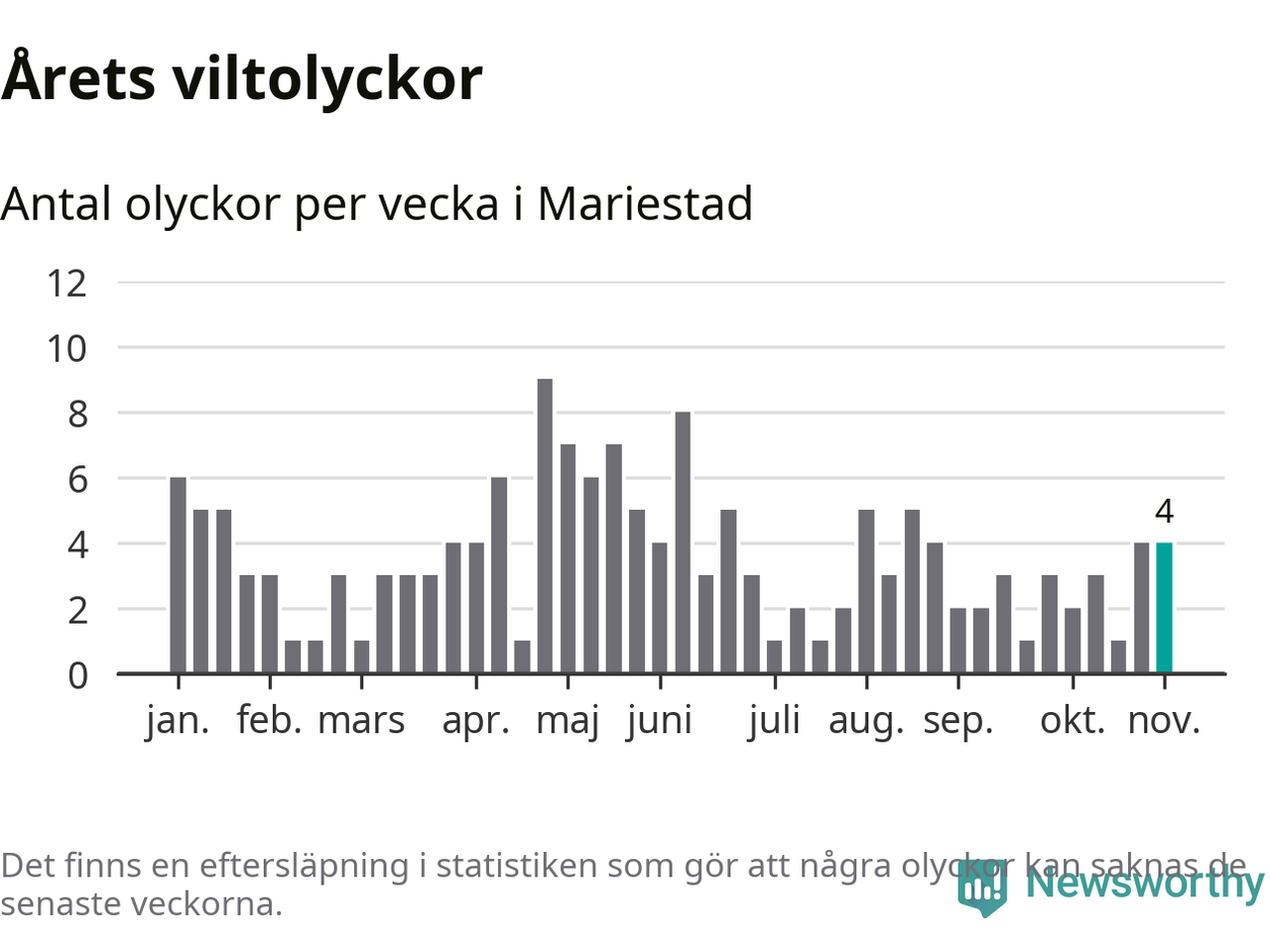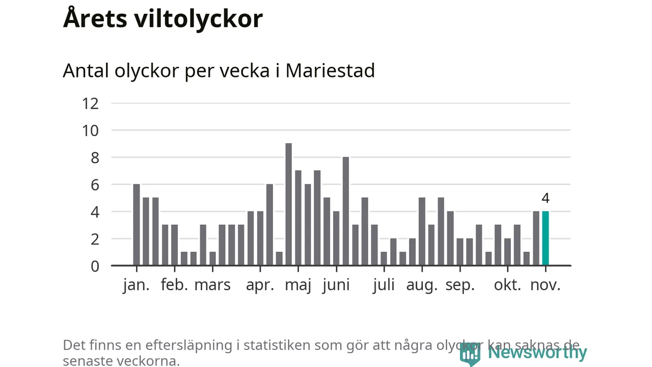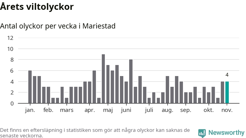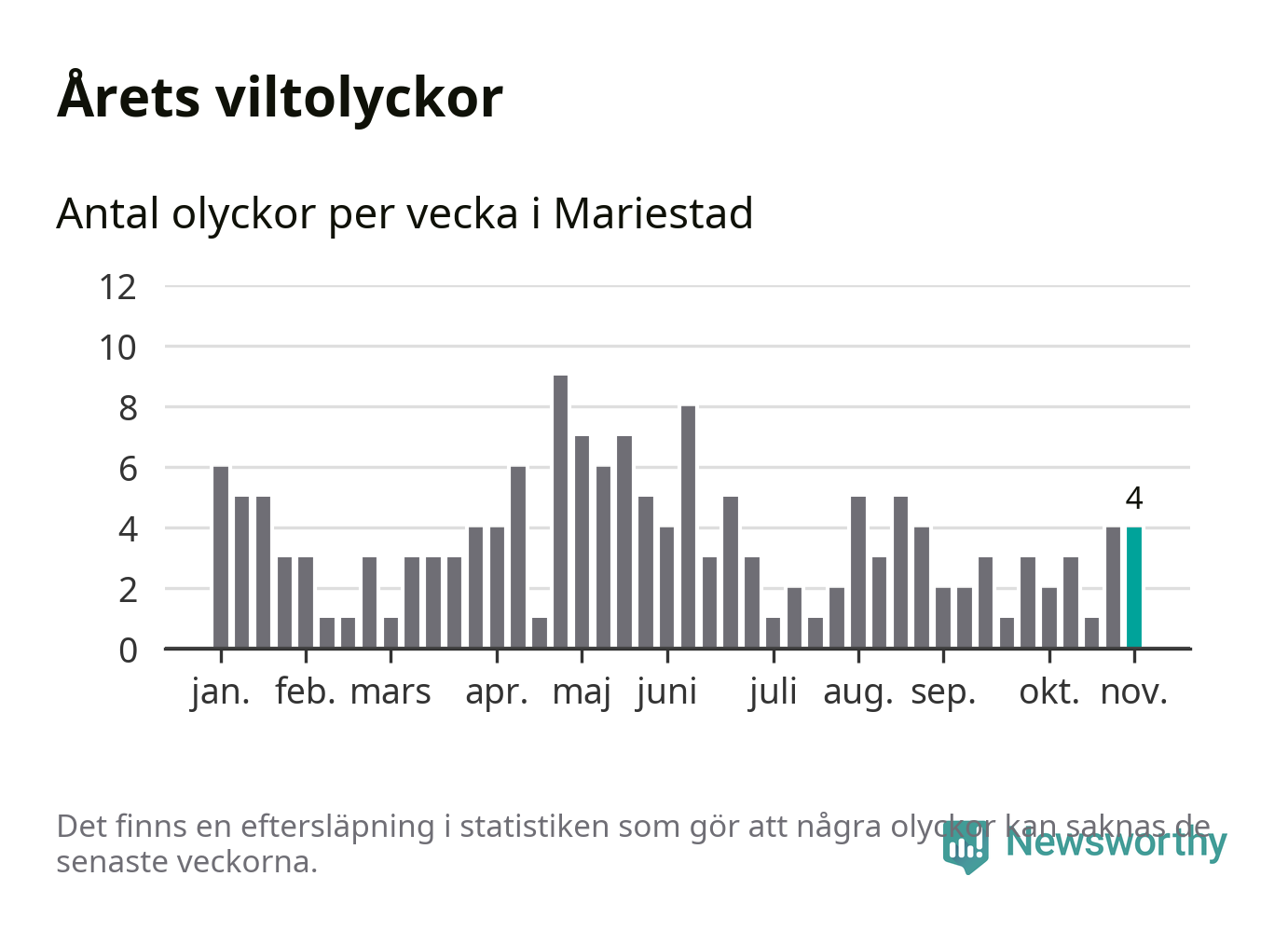 Hittills har fyra viltolyckor rapporterats in i Mariestads kommun från vecka 45. Se listan här.