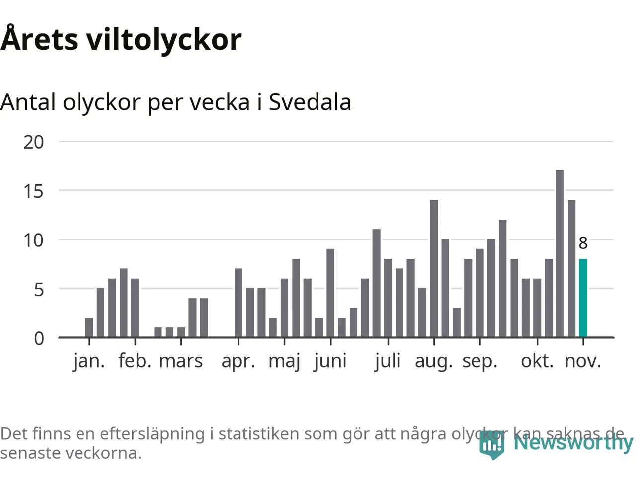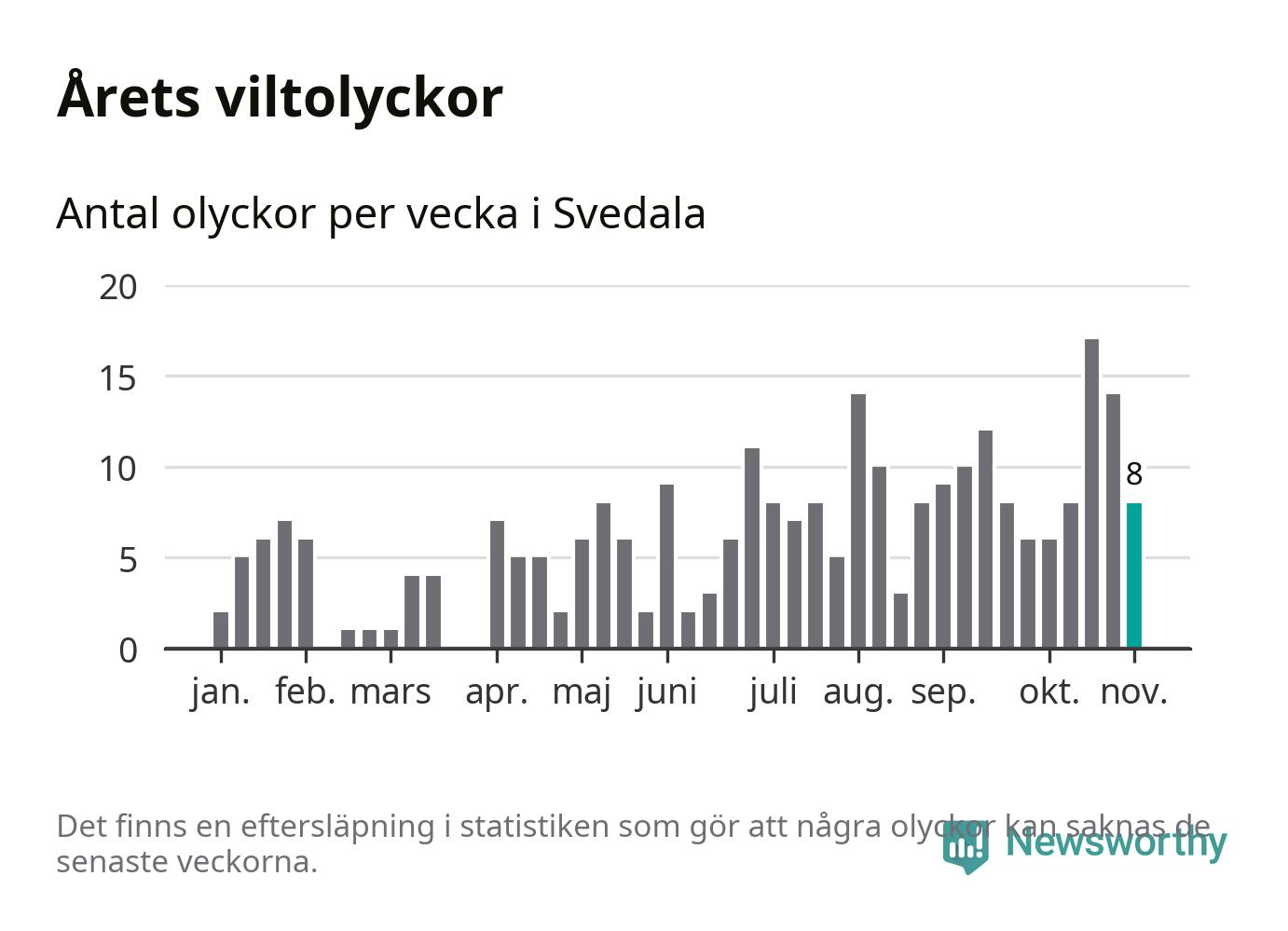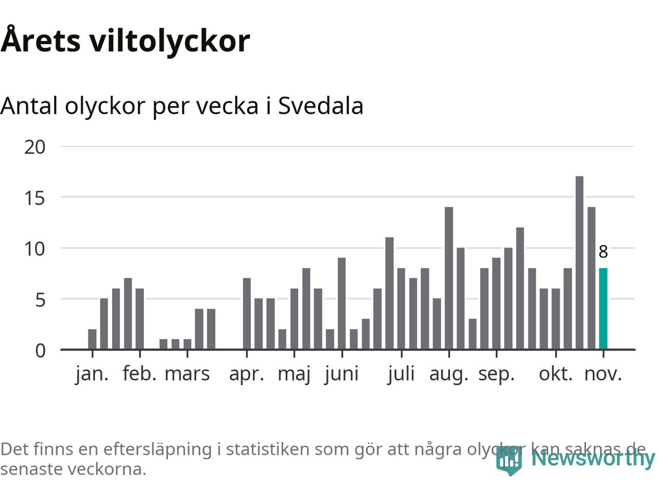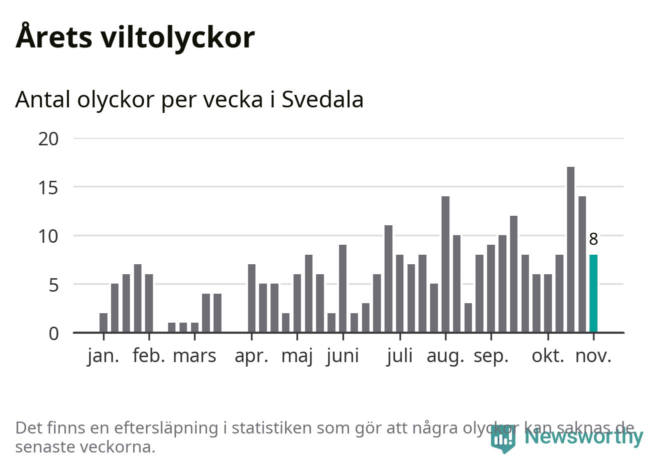 Hittills har åtta viltolyckor rapporterats in i Svedala kommun från vecka 45. Se listan här.