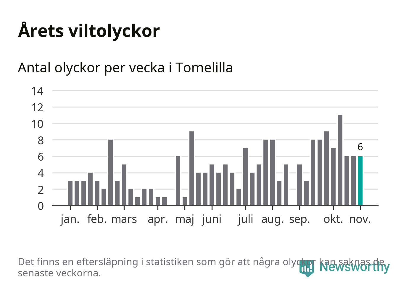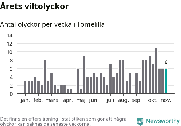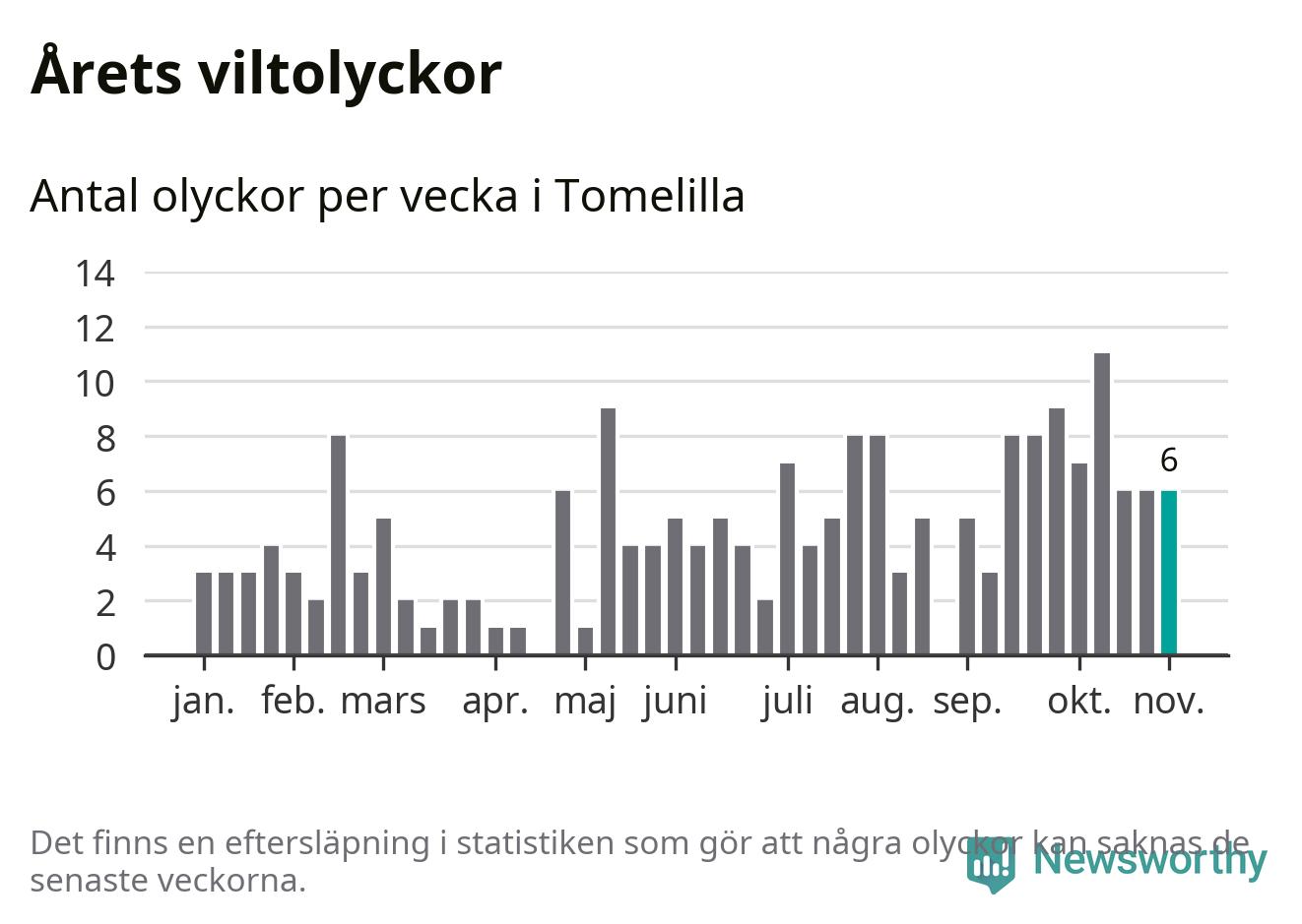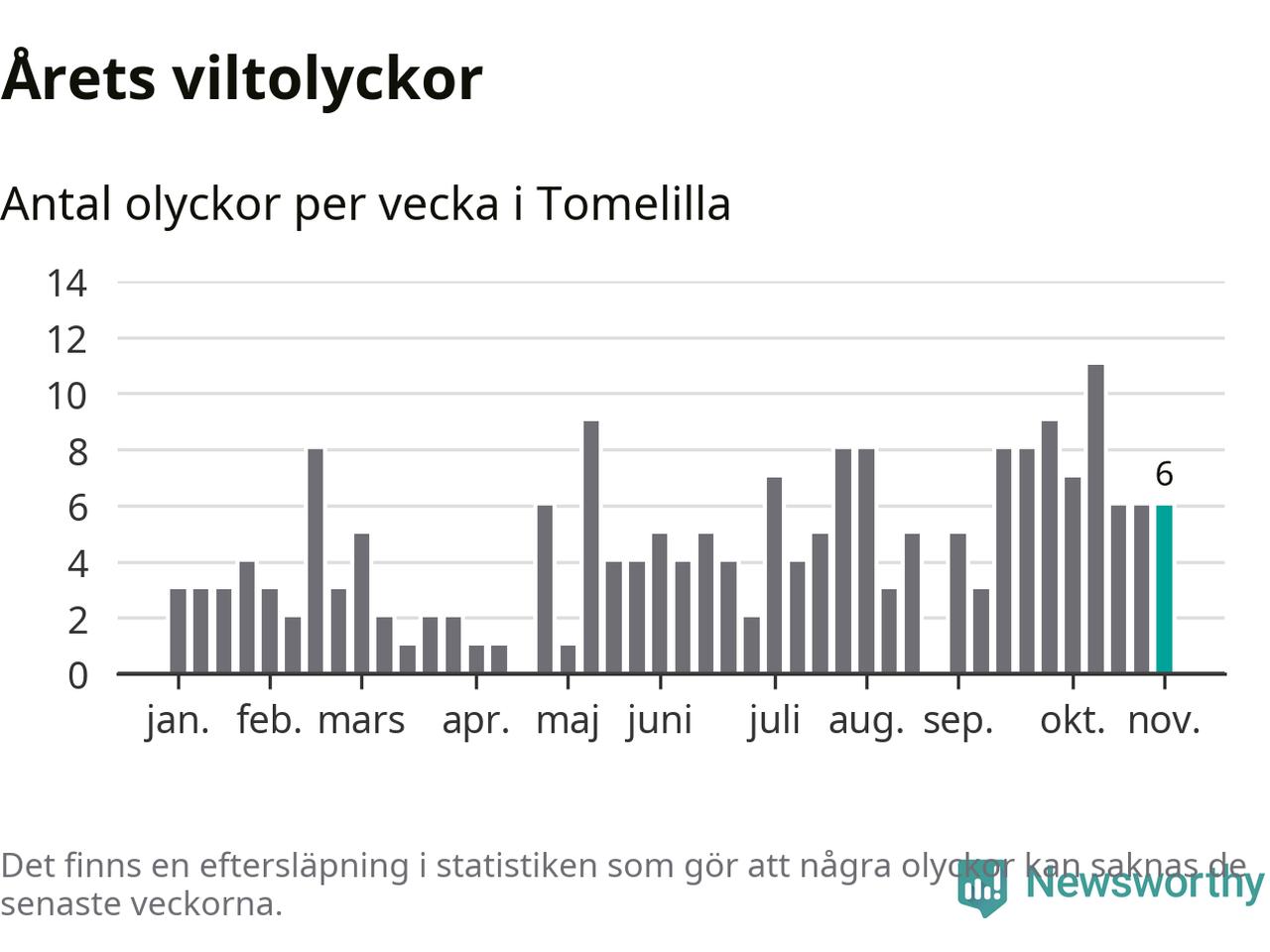Hittills har sex viltolyckor rapporterats in i Tomelilla kommun från vecka 45. Se listan här.