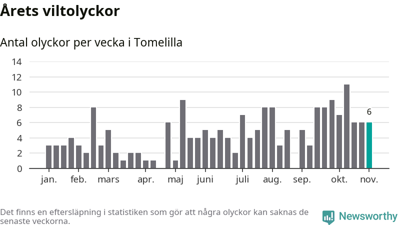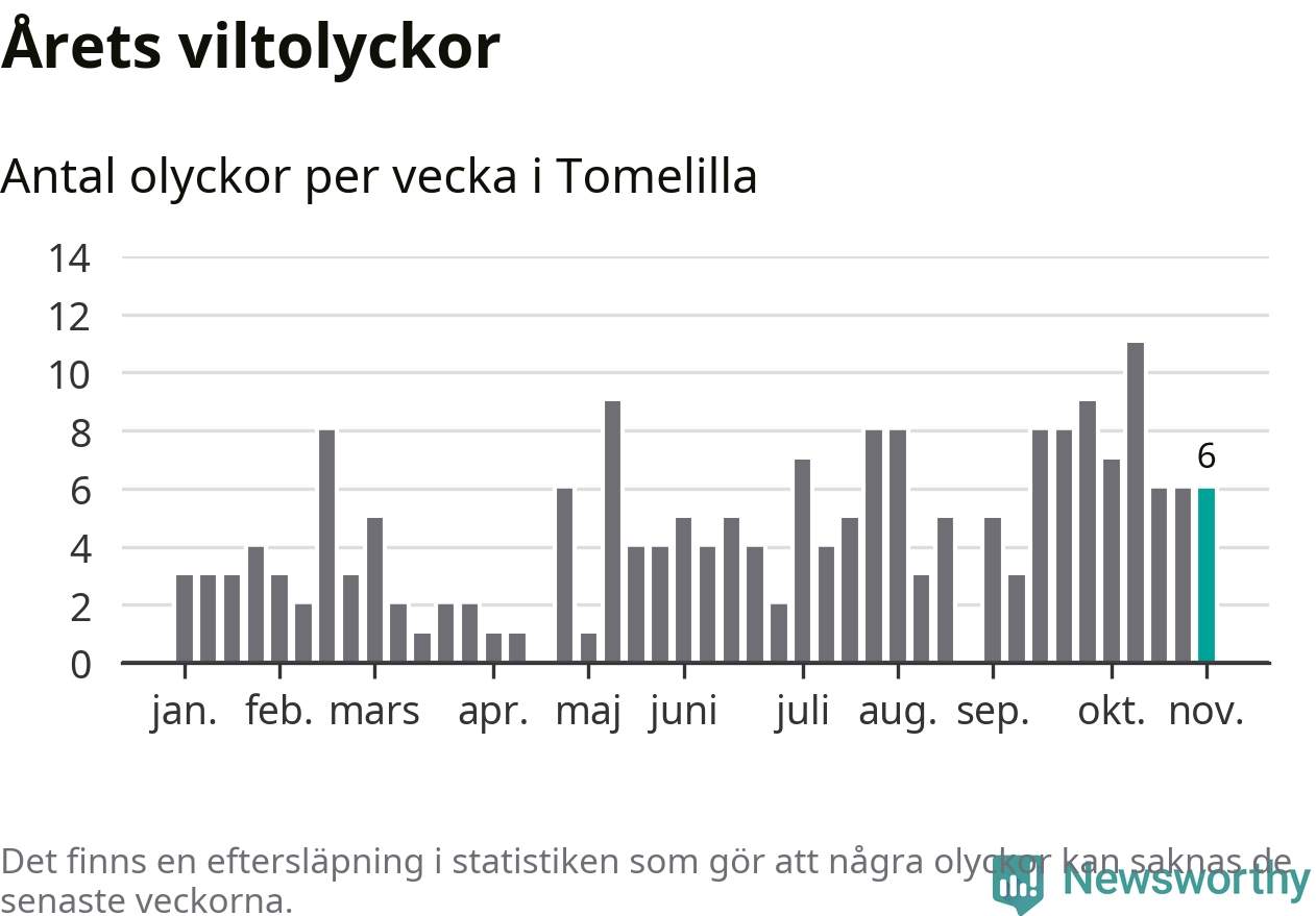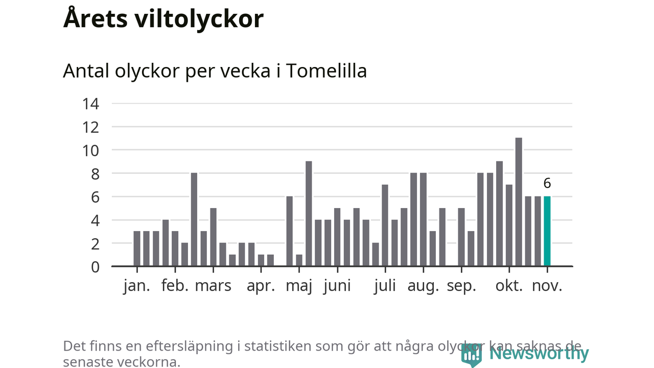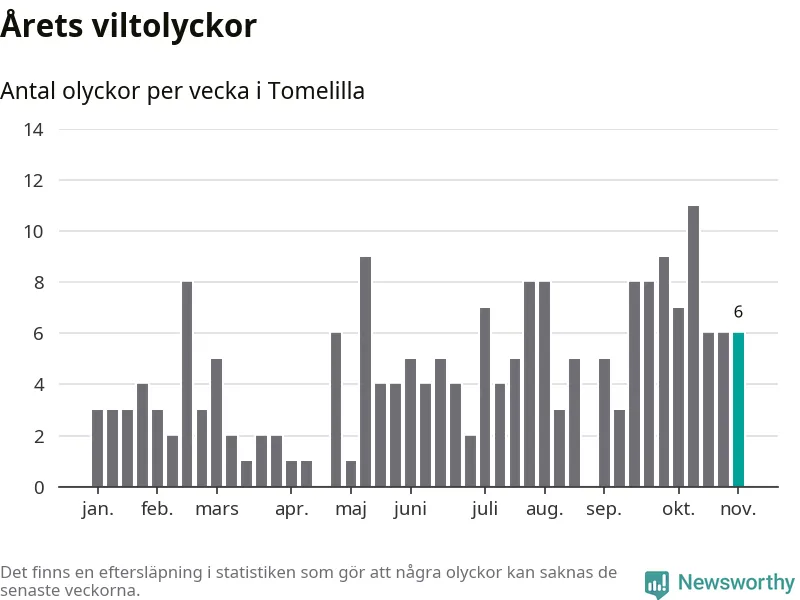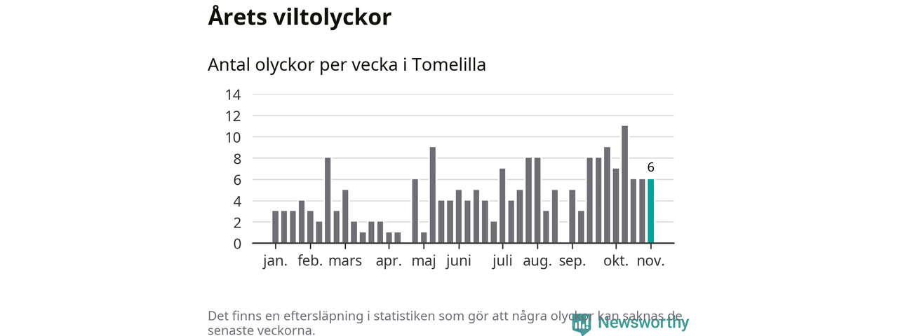 Hittills har sex viltolyckor rapporterats in i Tomelilla kommun från vecka 45. Se listan här.