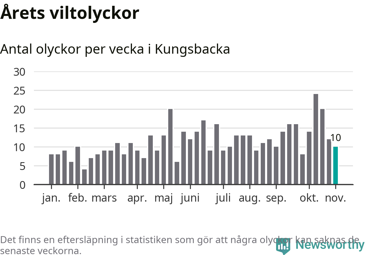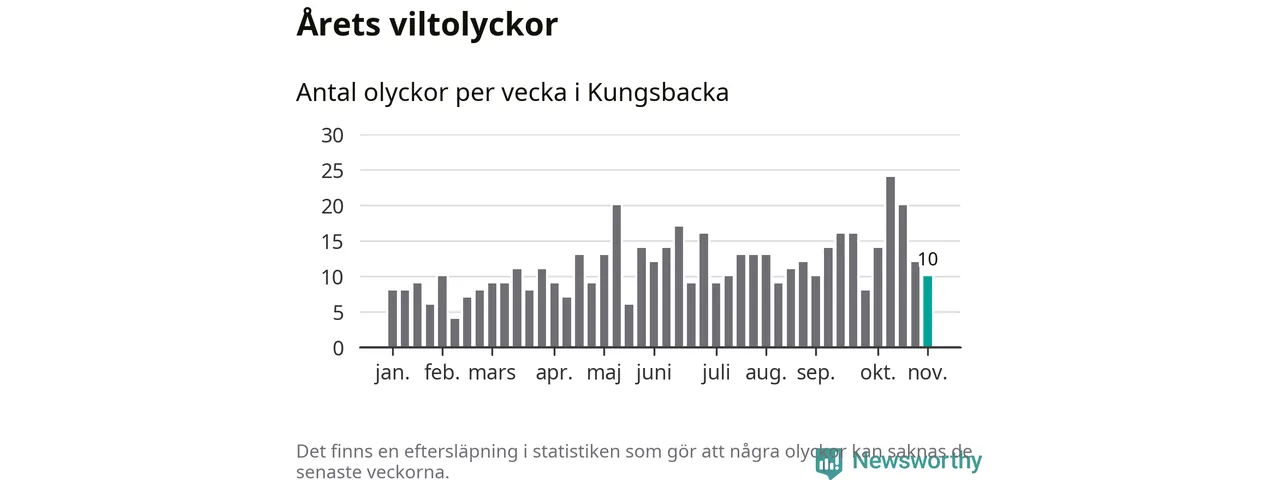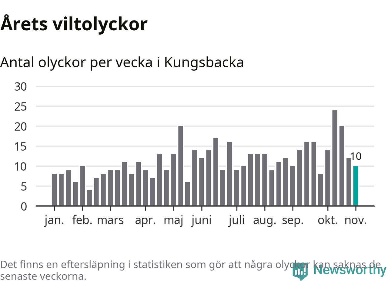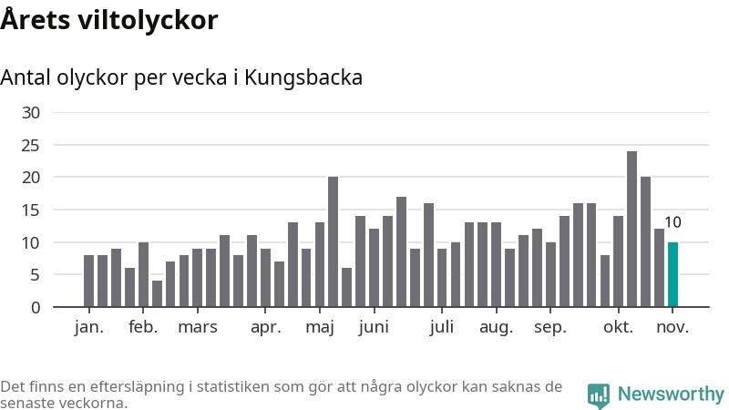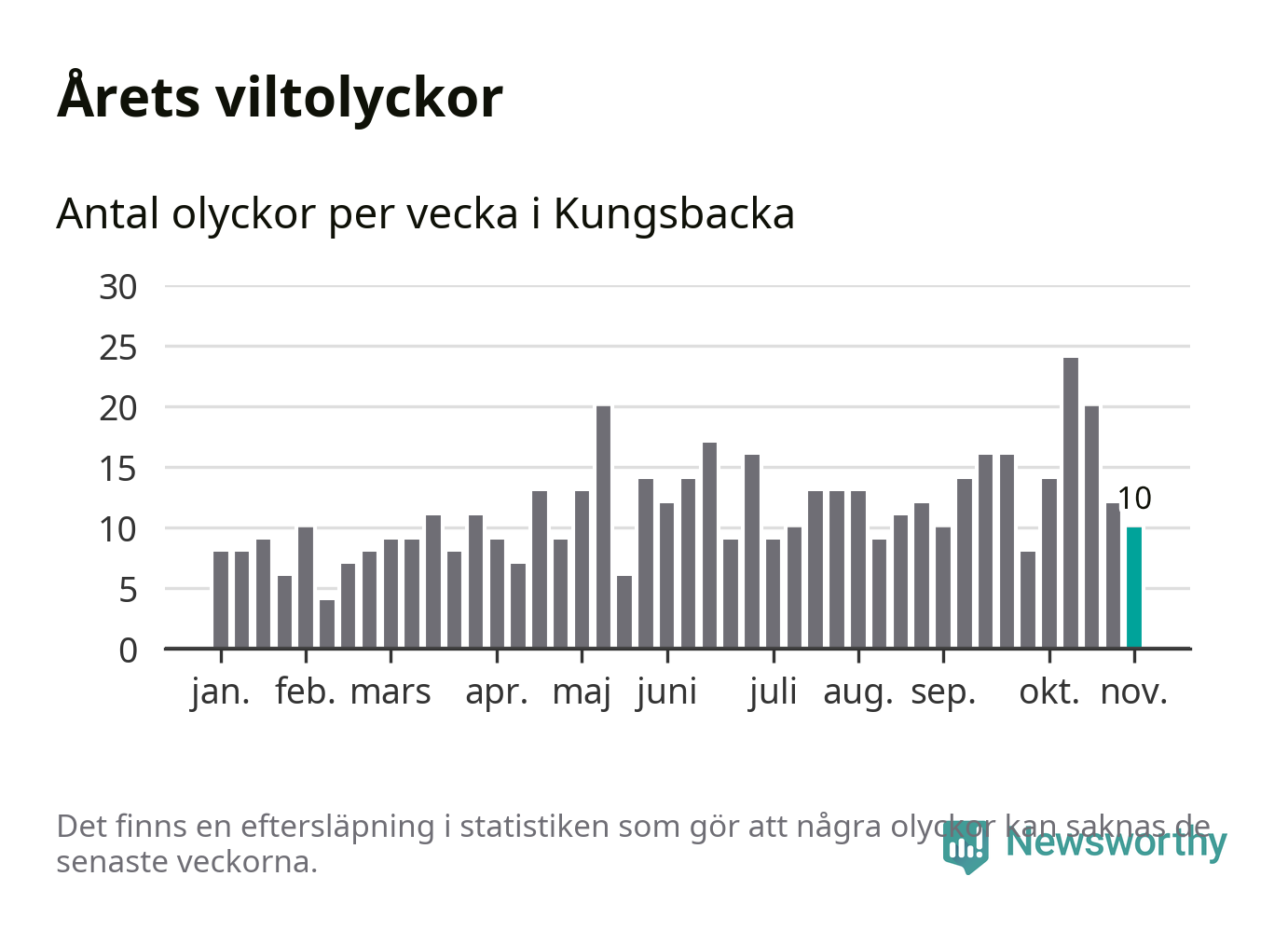 Hittills har tio viltolyckor rapporterats in i Kungsbacka kommun från vecka 45. Se listan här.