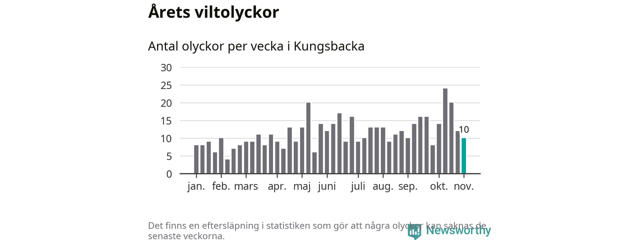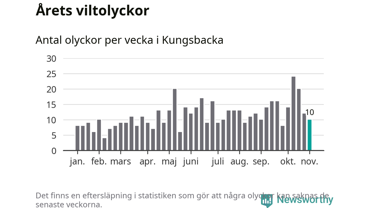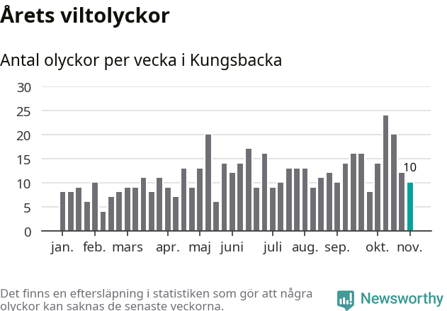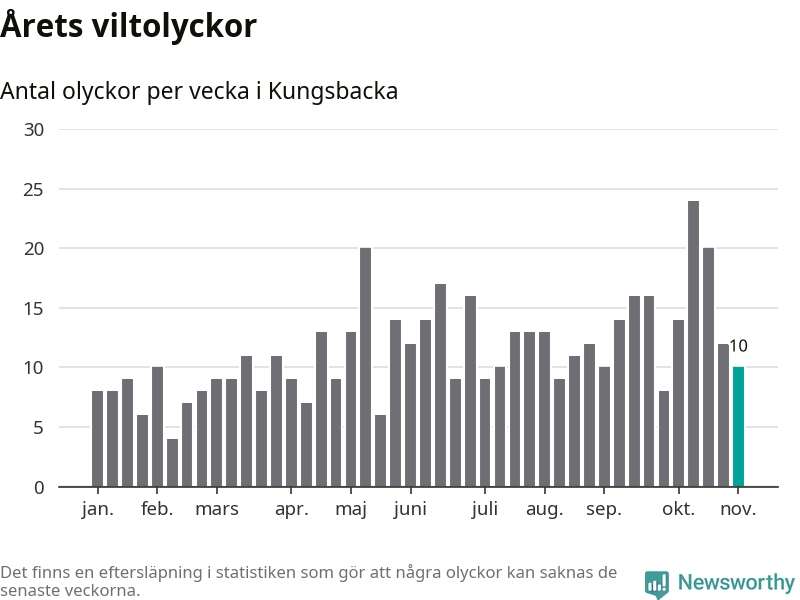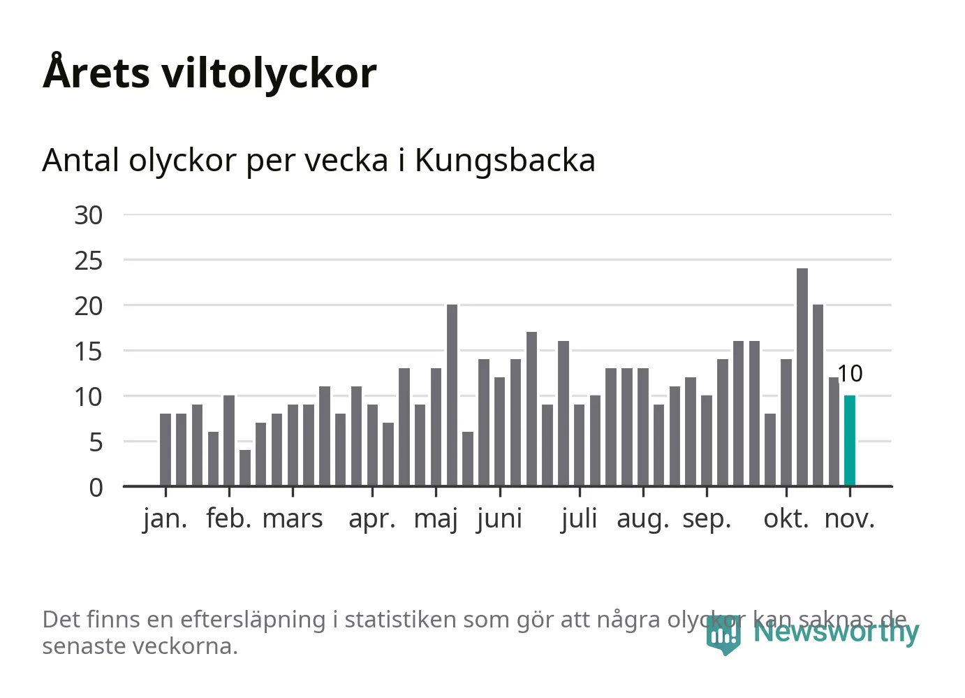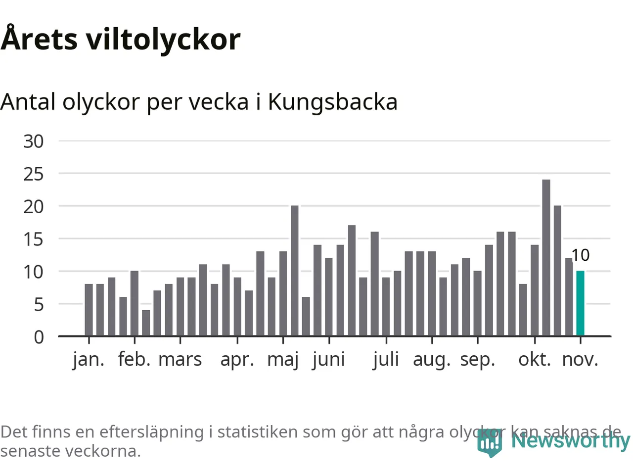 Totalt det här året har det inträffat 508 viltolyckor i kommunen. Det är mer än genomsnittet för motsvarande period (omkring 423) de senaste tio åren.