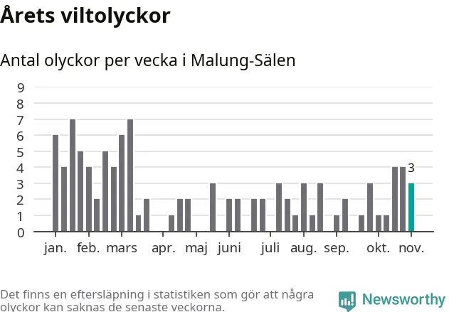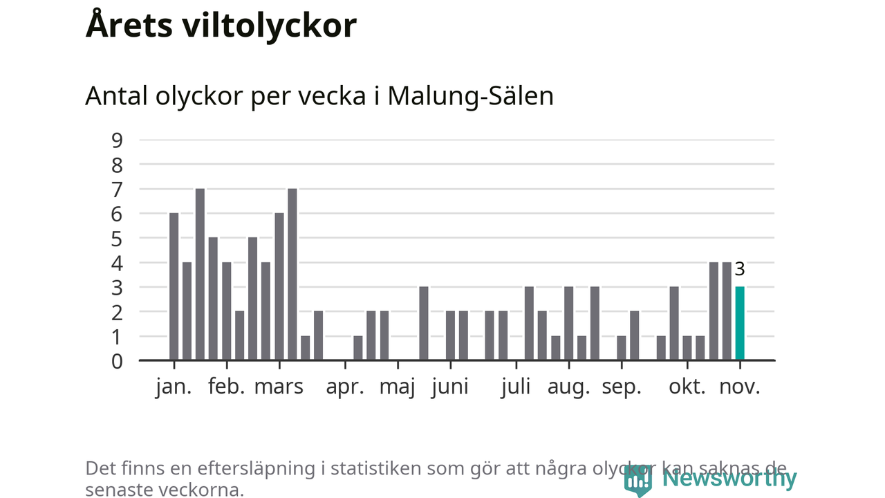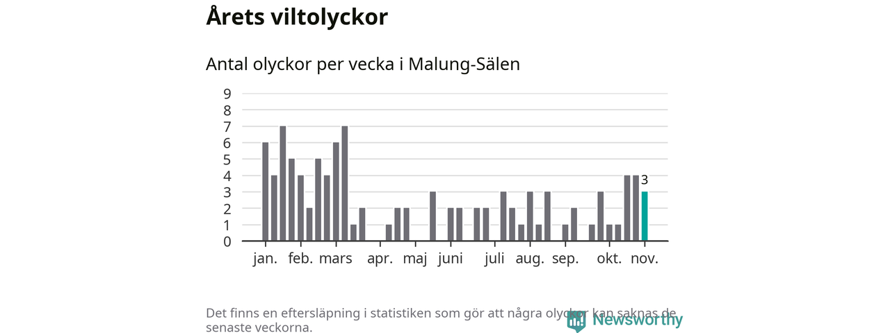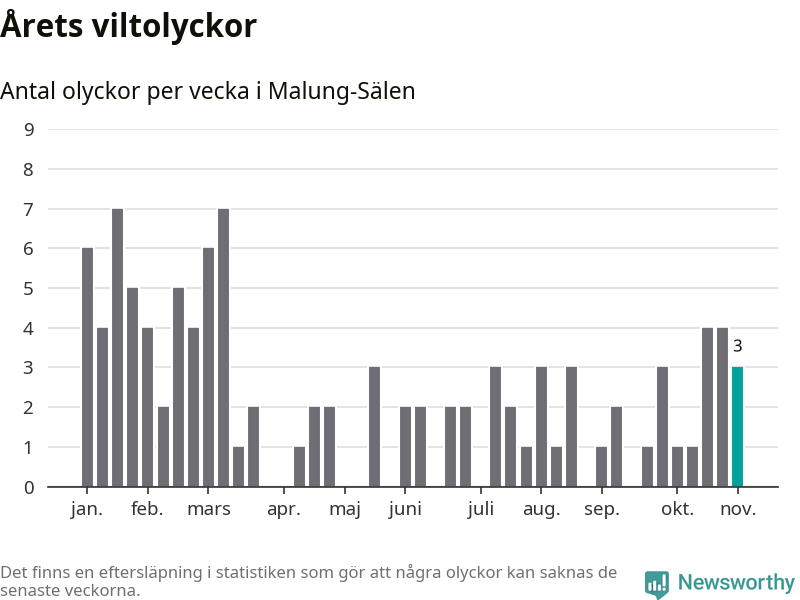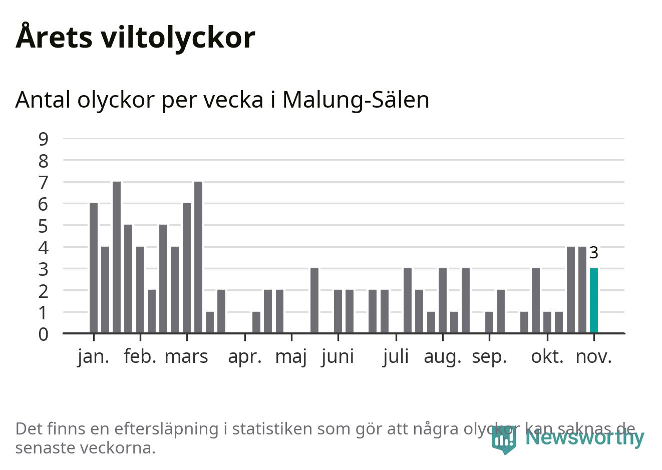 Hittills har tre viltolyckor rapporterats in i Malung-Sälens kommun från vecka 45. Se listan här.