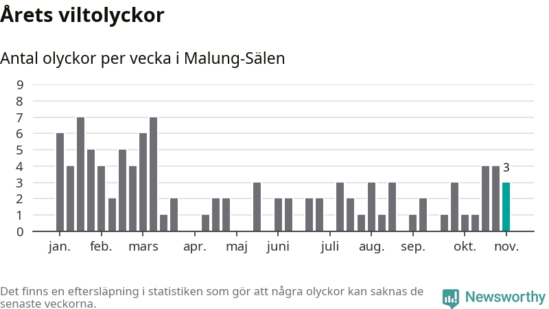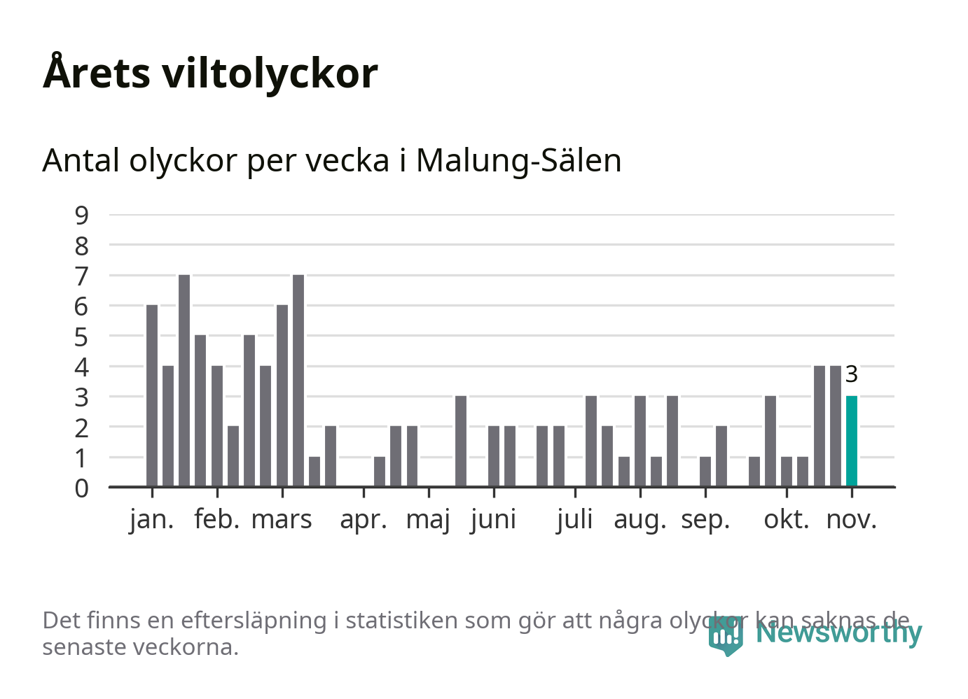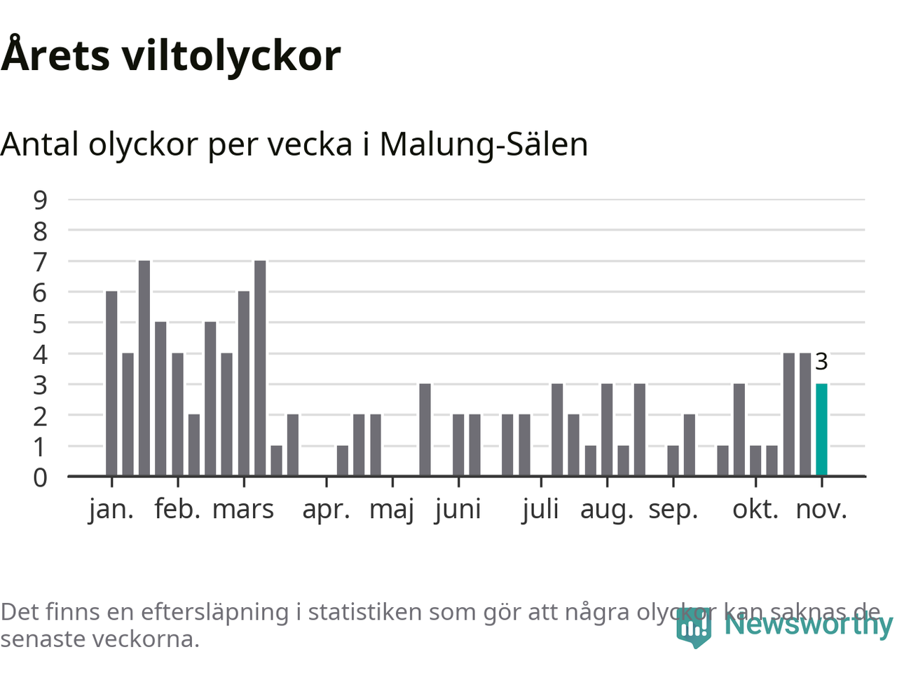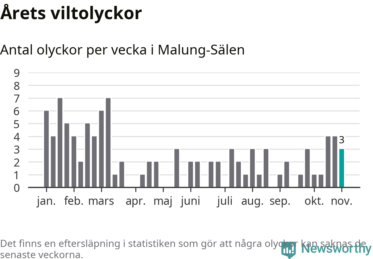 Hittills har tre viltolyckor rapporterats in i Malung-Sälens kommun från vecka 45. Se listan här.