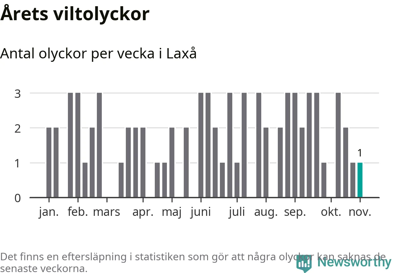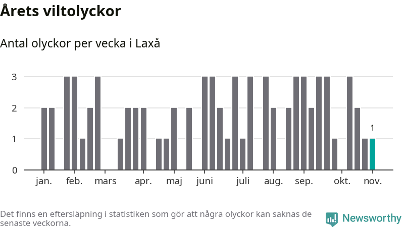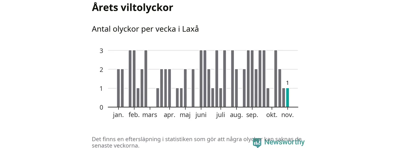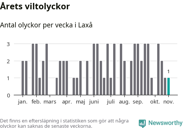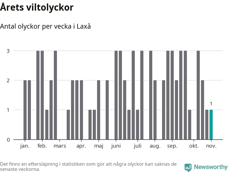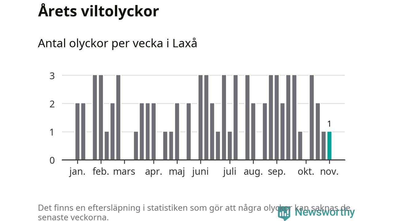 Från förra veckan (vecka 45) har hittills en viltolycka rapporterats in i Laxå kommun.