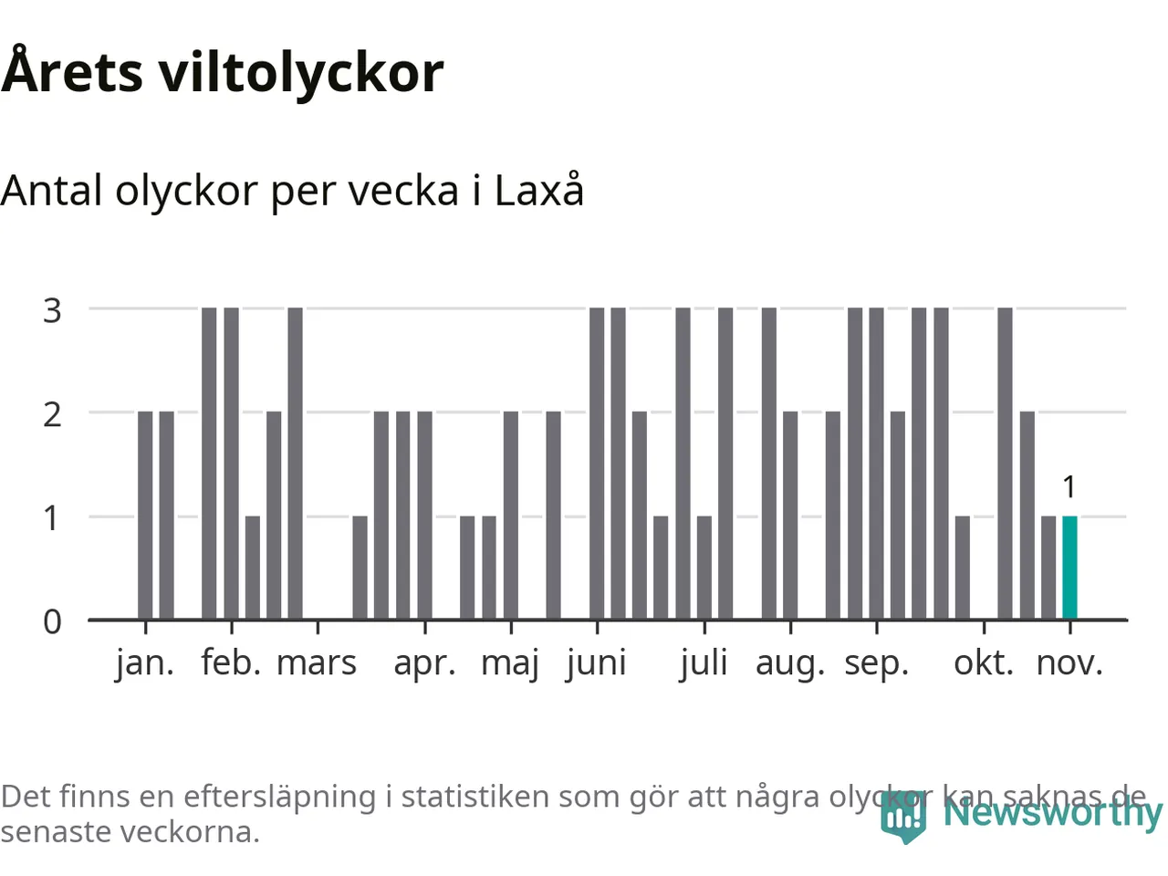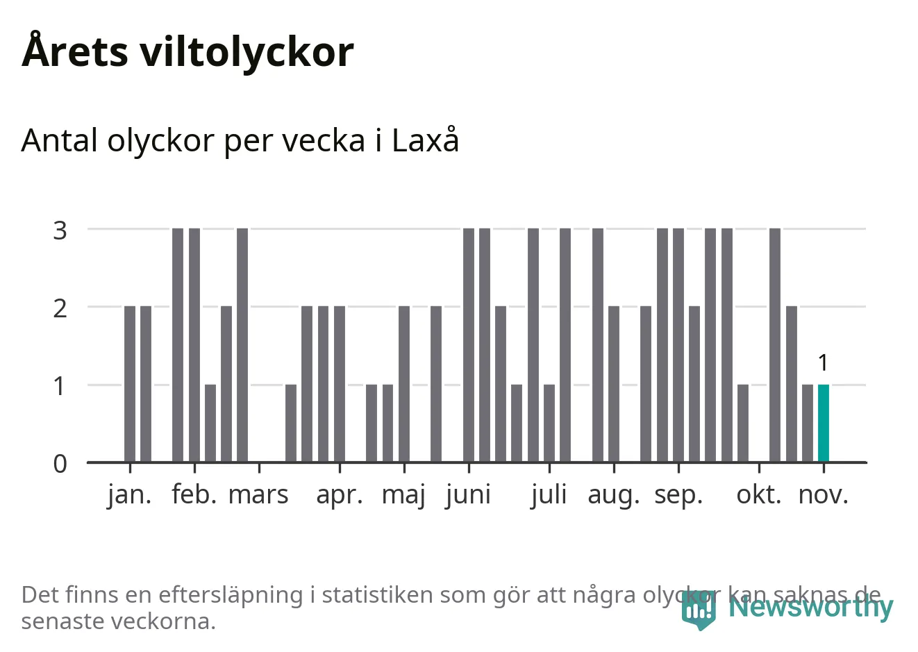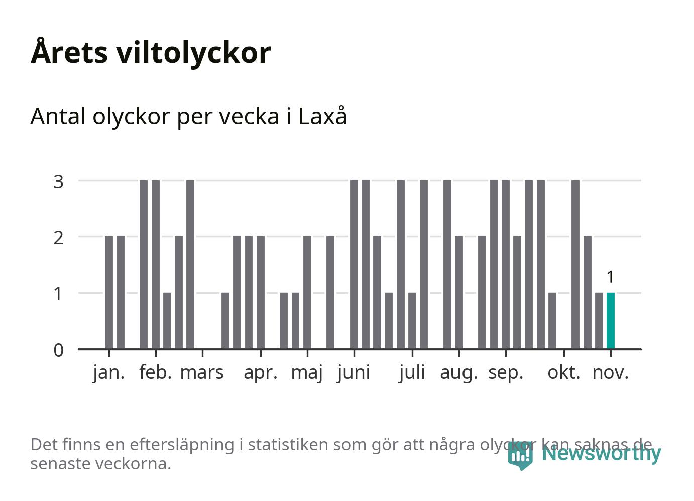 Från förra veckan (vecka 45) har hittills en viltolycka rapporterats in i Laxå kommun.