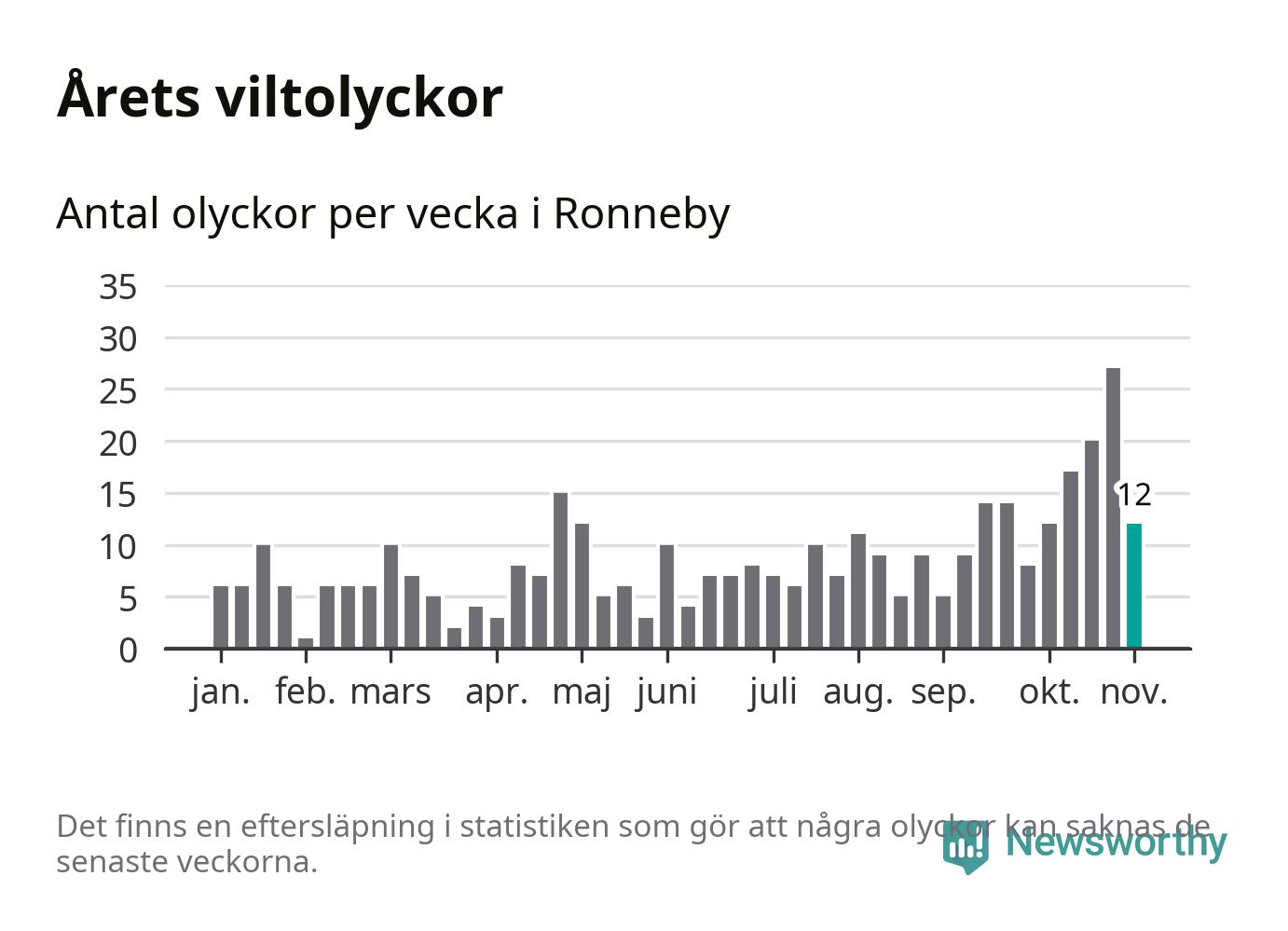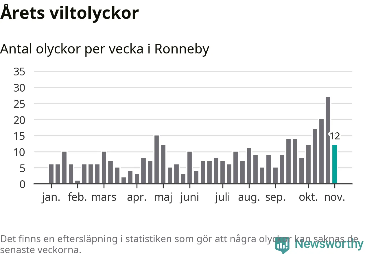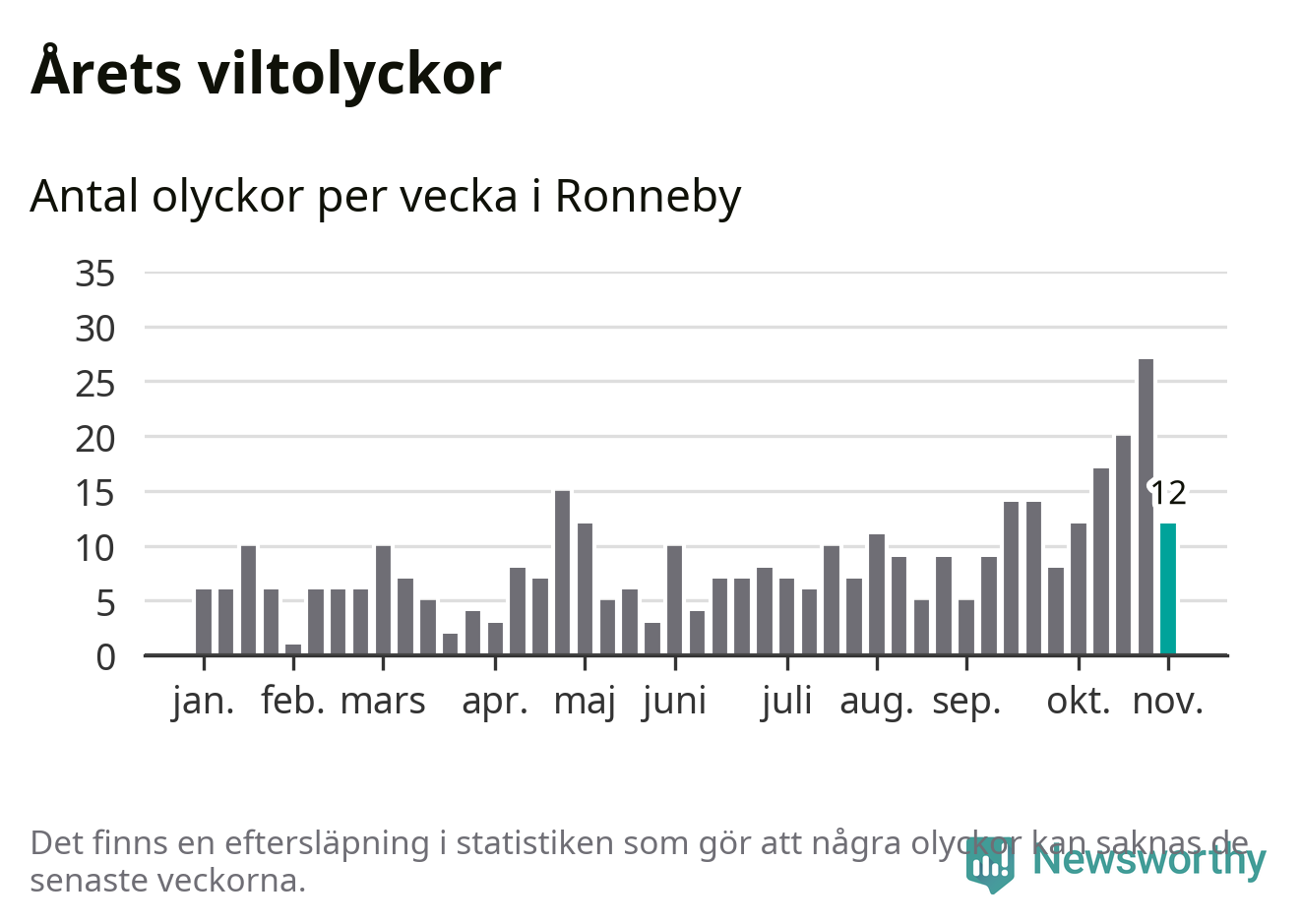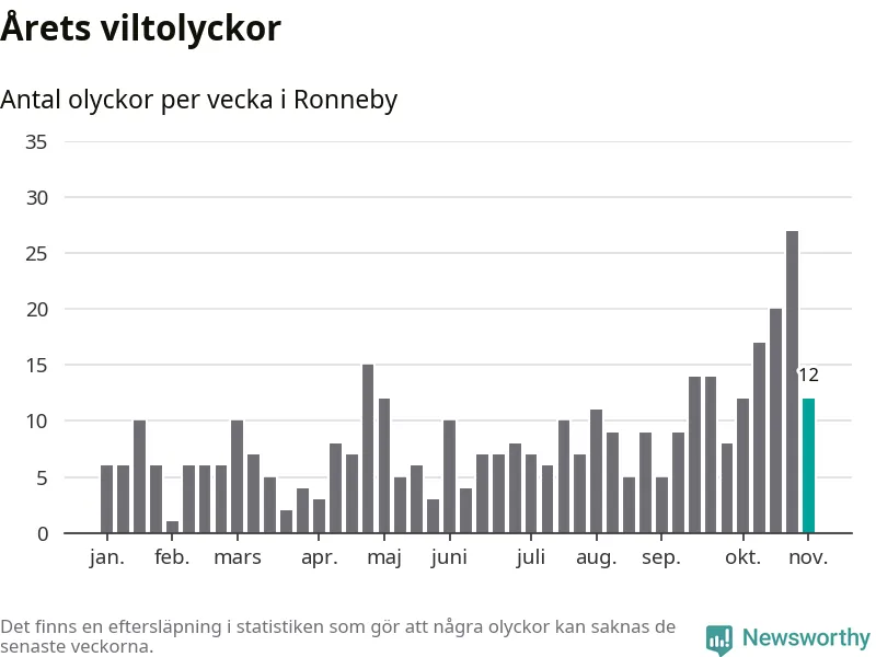 Hittills har tolv viltolyckor rapporterats in i Ronneby kommun från vecka 45. Se listan här.