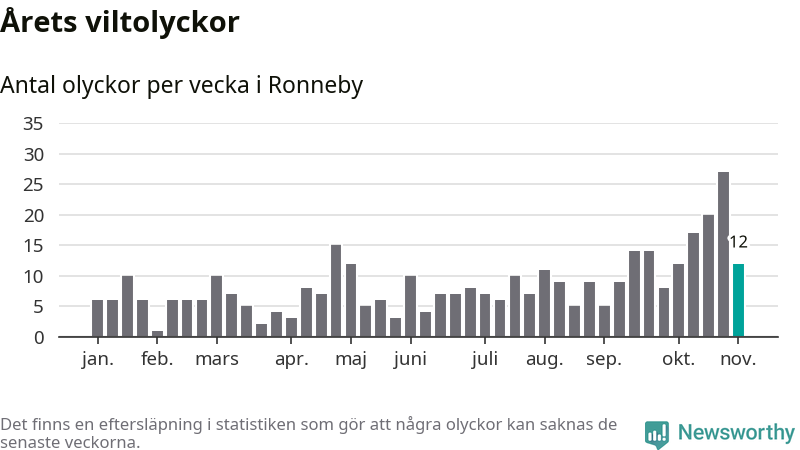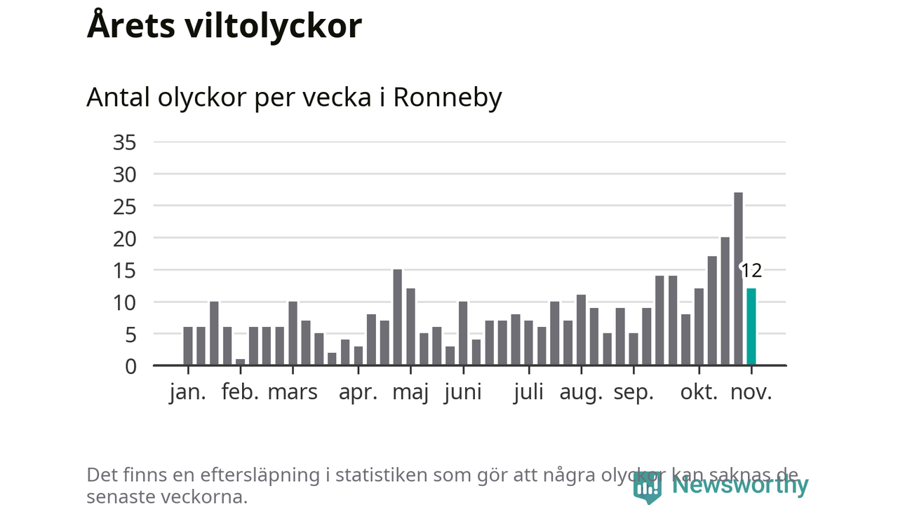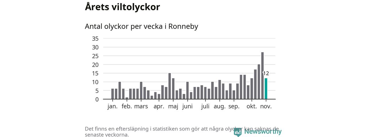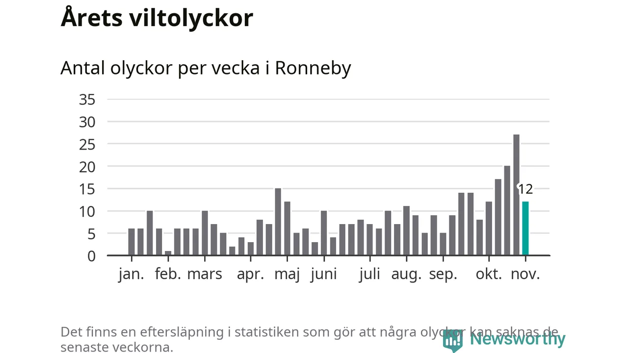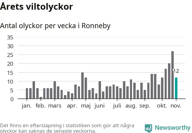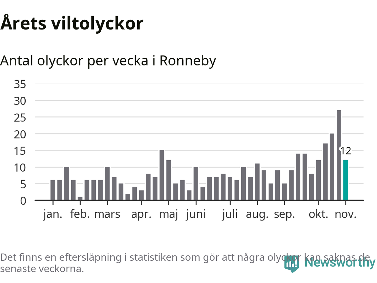 Hittills har tolv viltolyckor rapporterats in i Ronneby kommun från vecka 45. Se listan här.