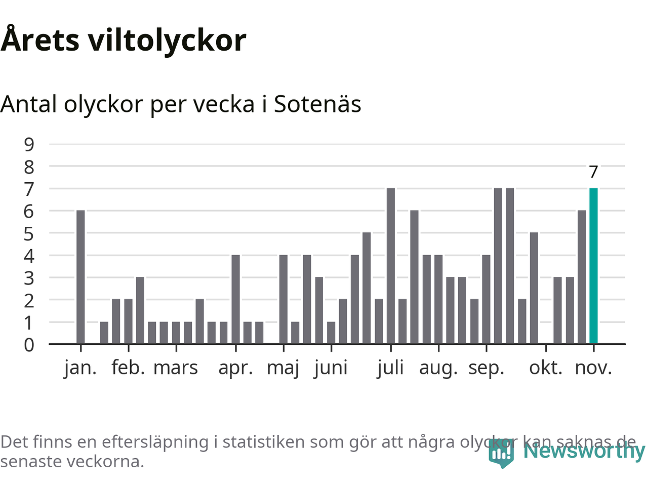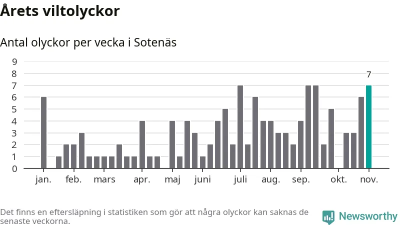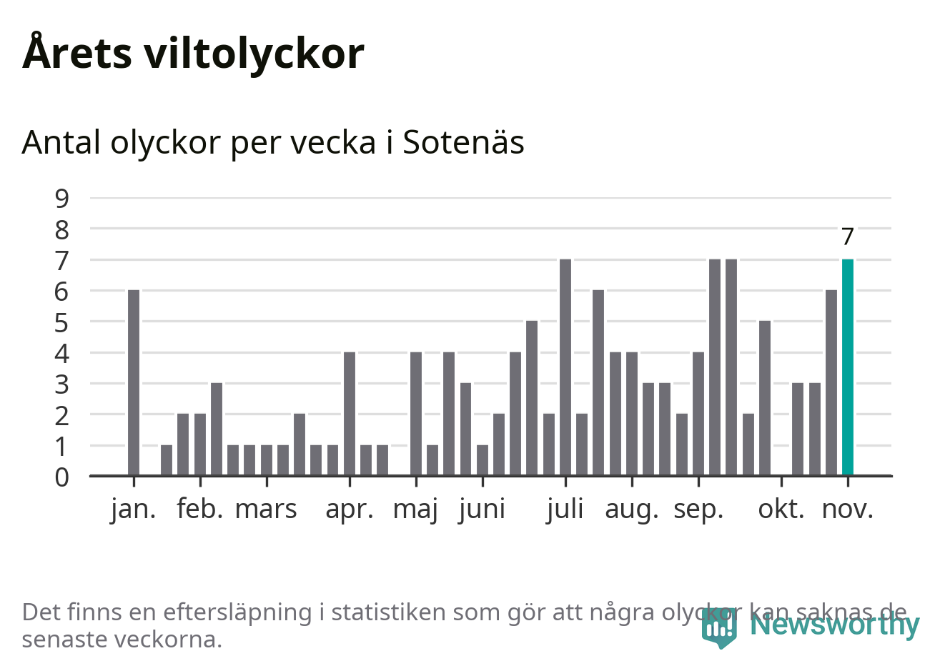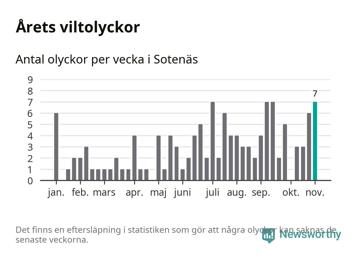 Sju olyckor på en enda vecka är däremot ovanligt många. Bara sex gånger tidigare sedan 2015 har det skett så många viltolyckor på en vecka i Sotenäs kommun.