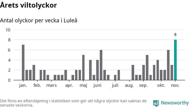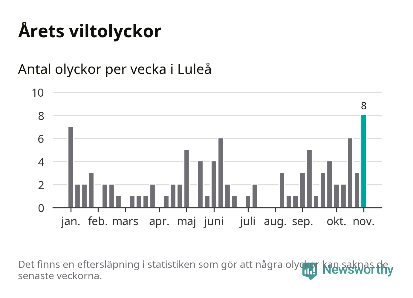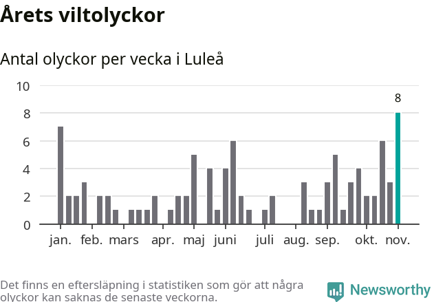 sett till de senaste tio årens statistik. I statistiken ingår inte olyckor med ren, som här räknas som tamdjur.