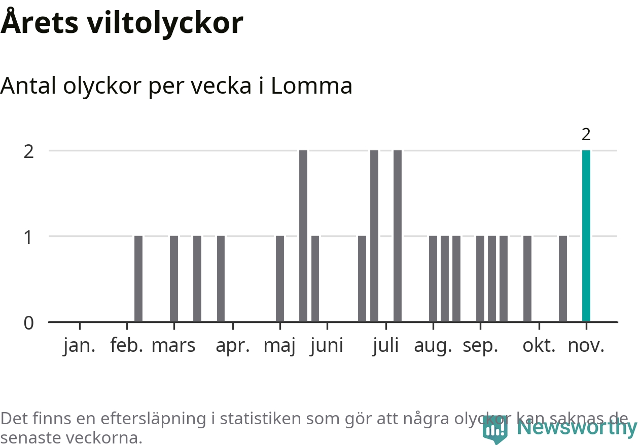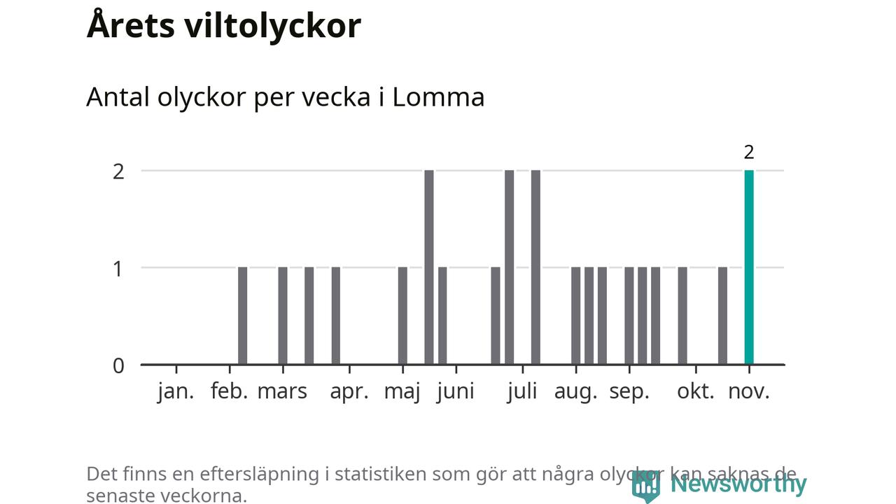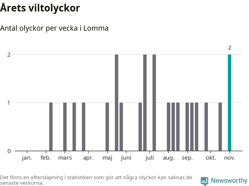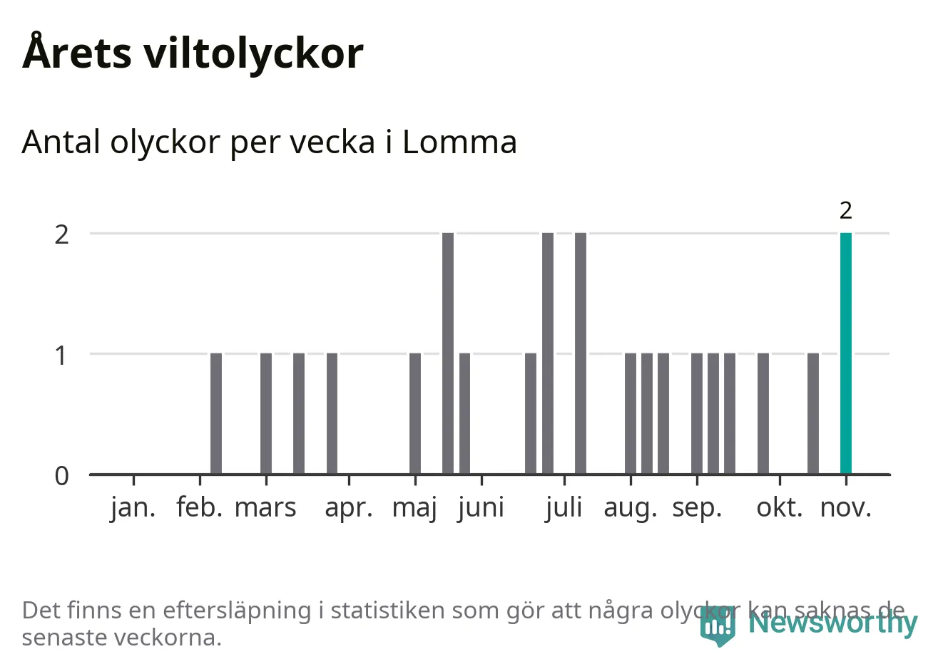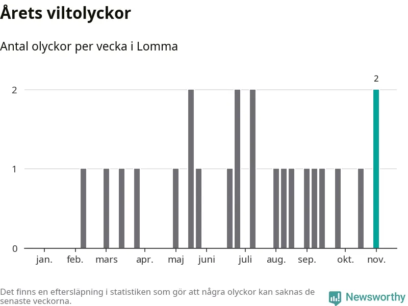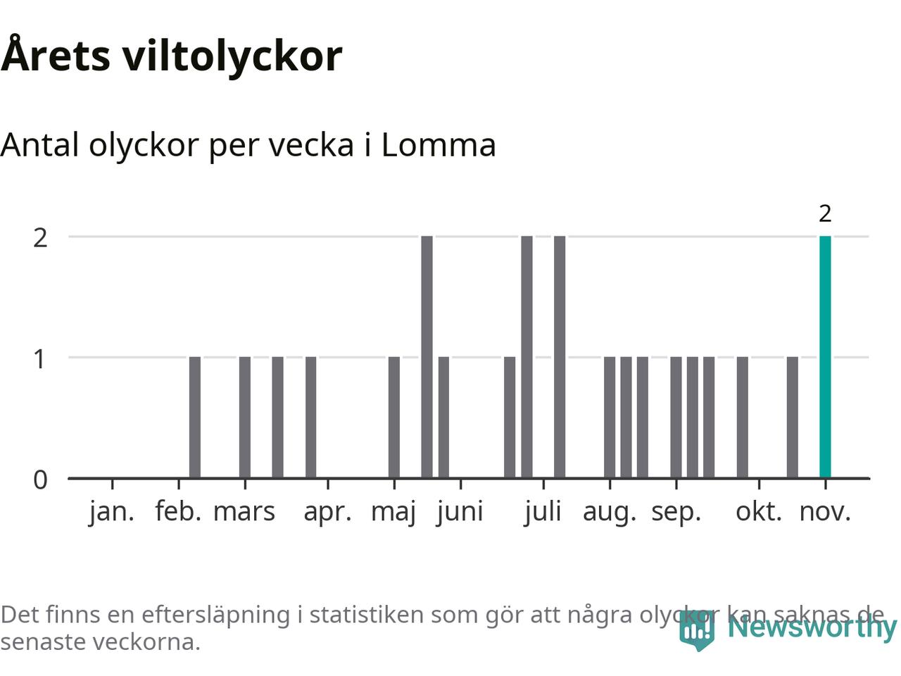 Hittills har två viltolyckor rapporterats in i Lomma kommun från vecka 45. Se listan här.