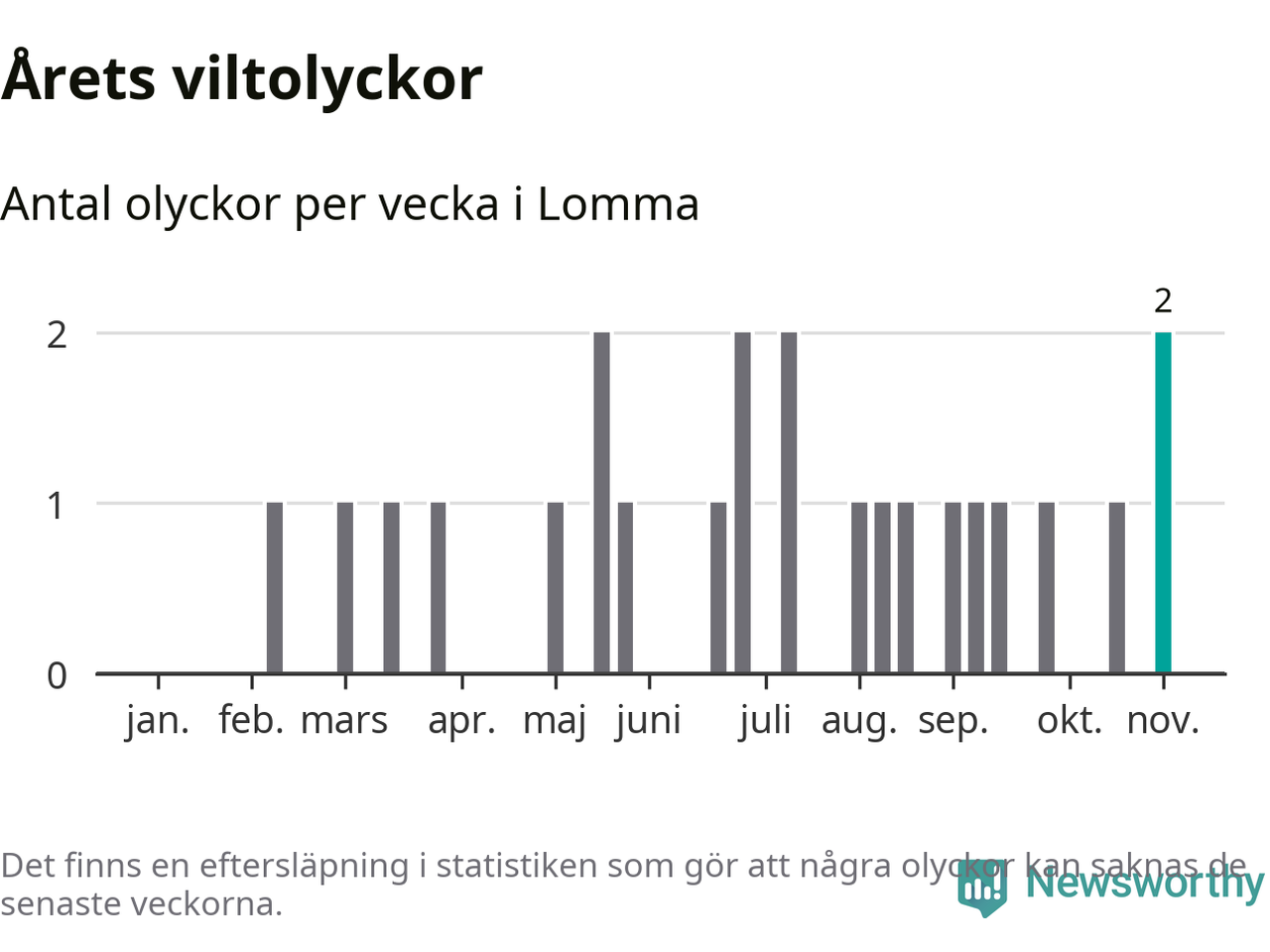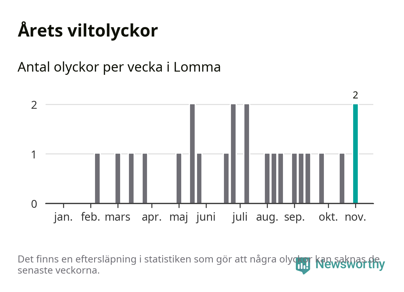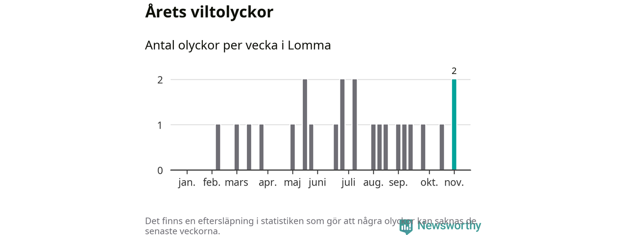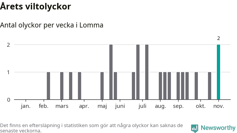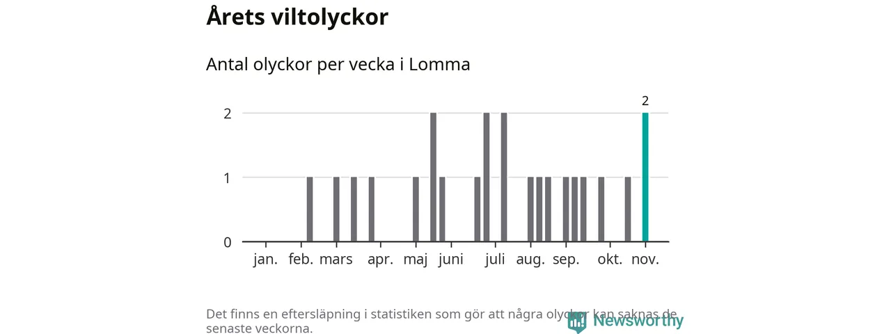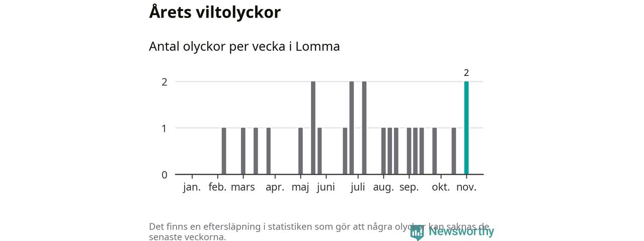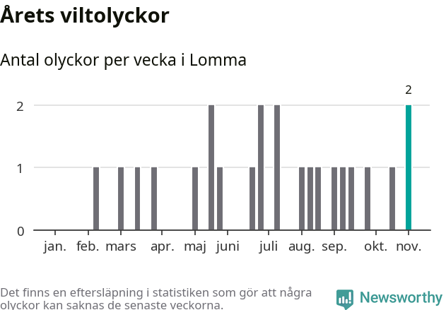 Hittills har två viltolyckor rapporterats in i Lomma kommun från vecka 45. Se listan här.