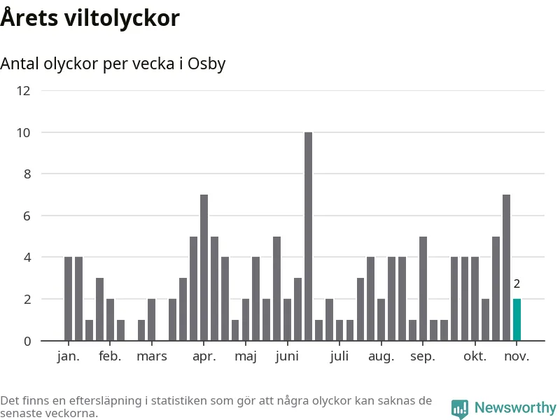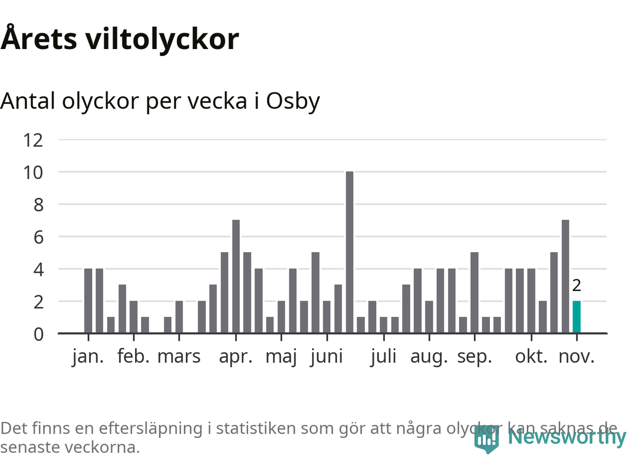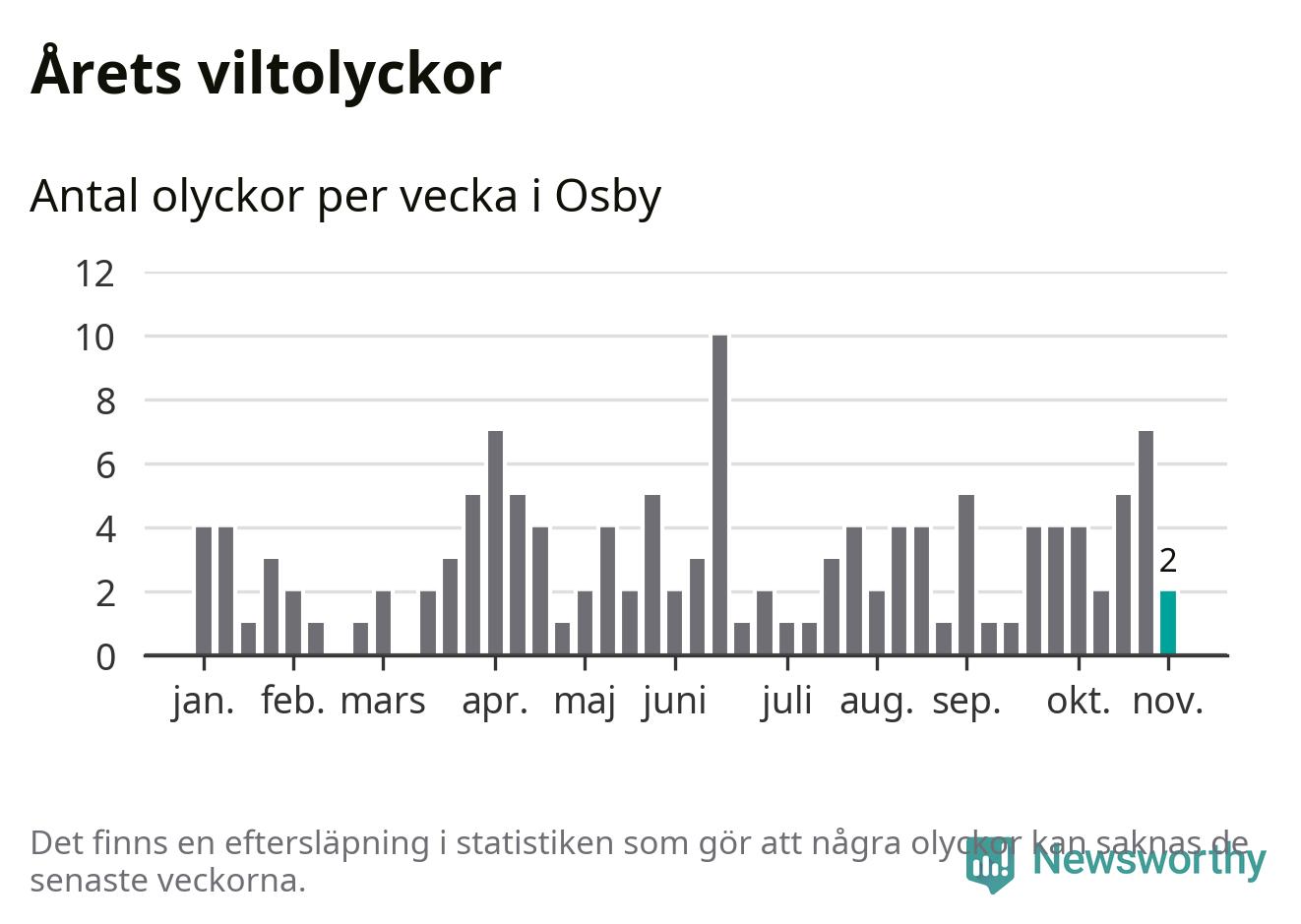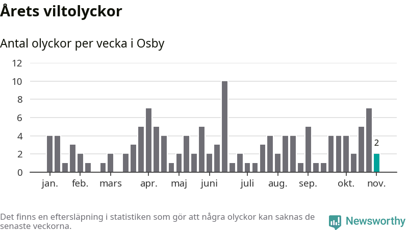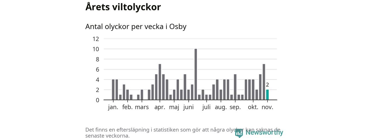 Hittills har två viltolyckor rapporterats in i Osby kommun från vecka 45. Se listan här.