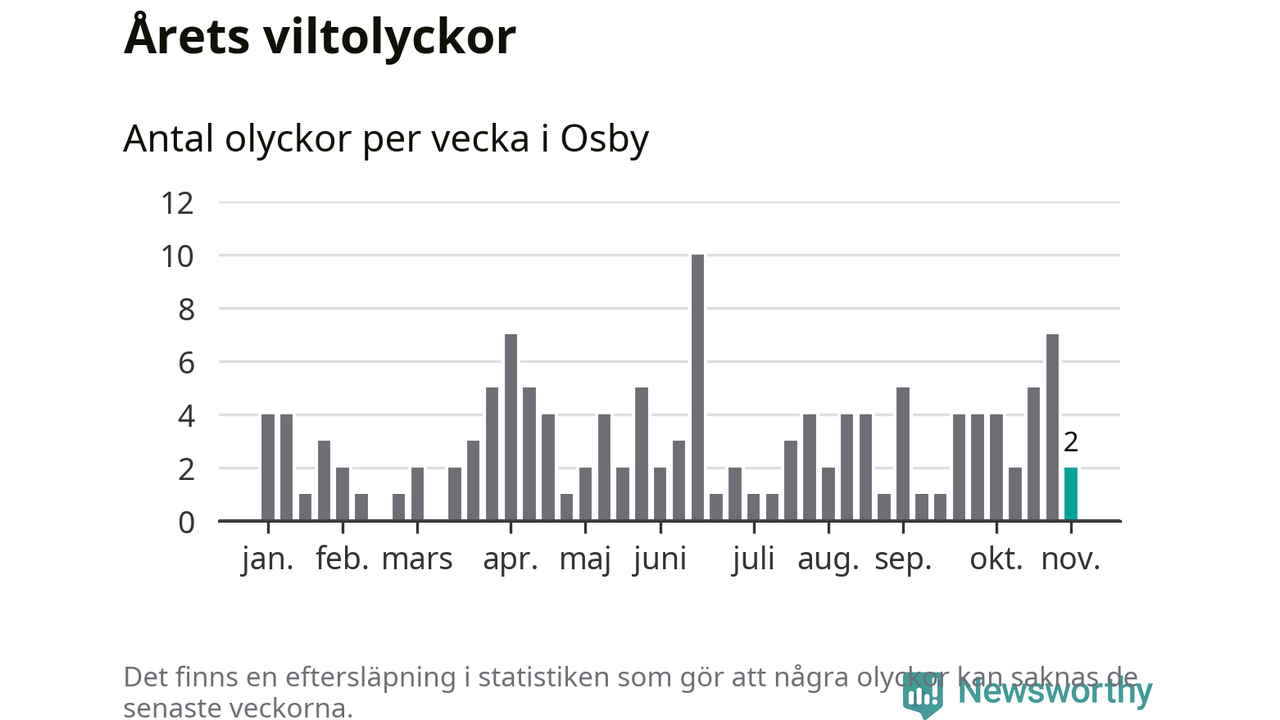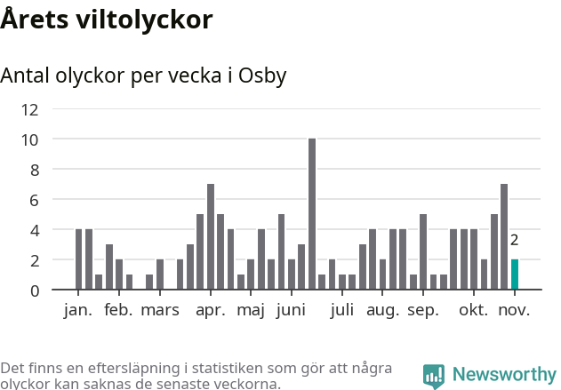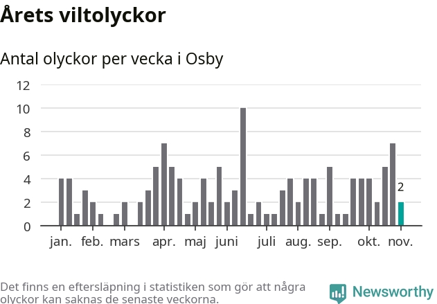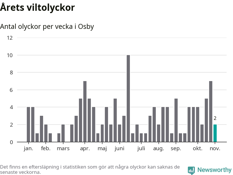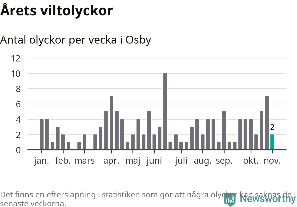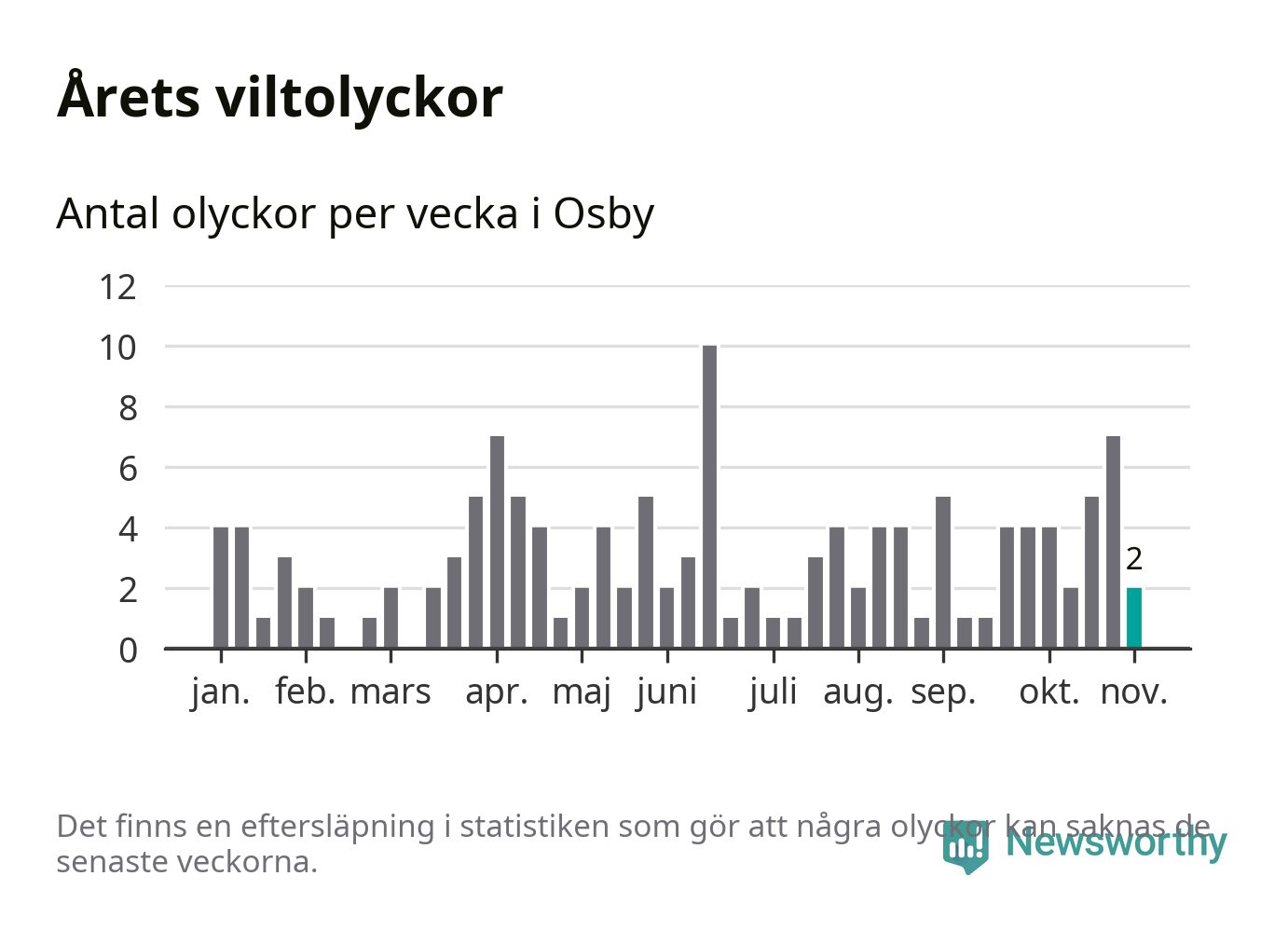 Hittills har två viltolyckor rapporterats in i Osby kommun från vecka 45. Se listan här.