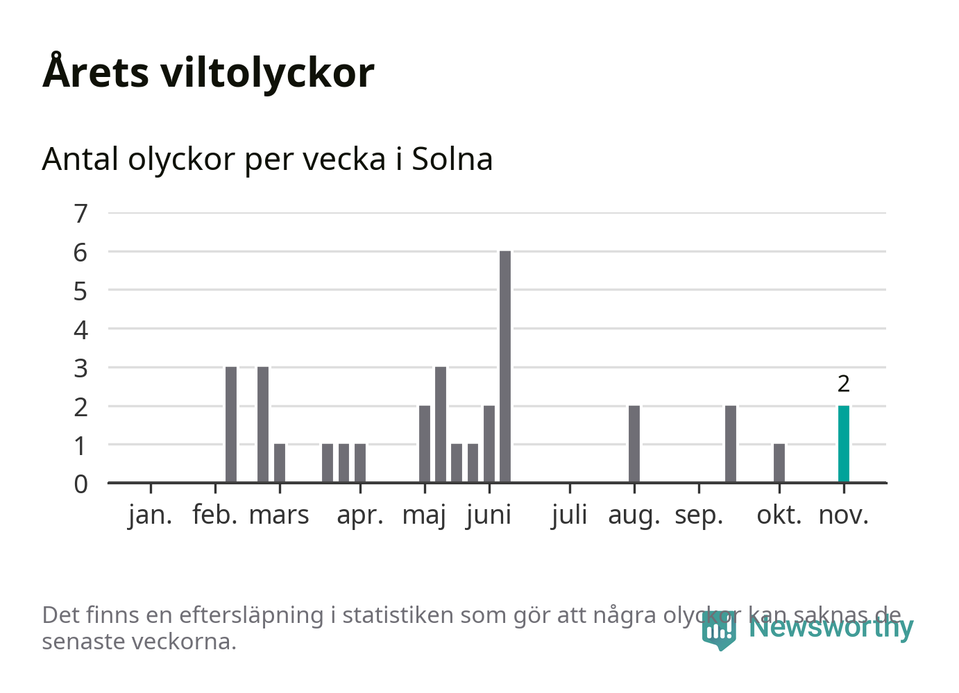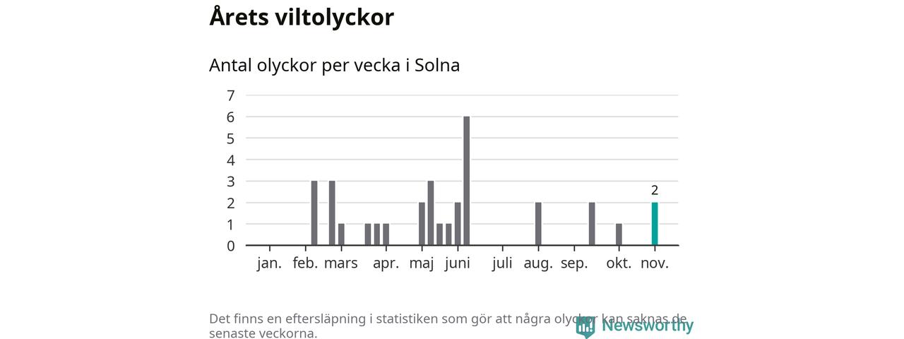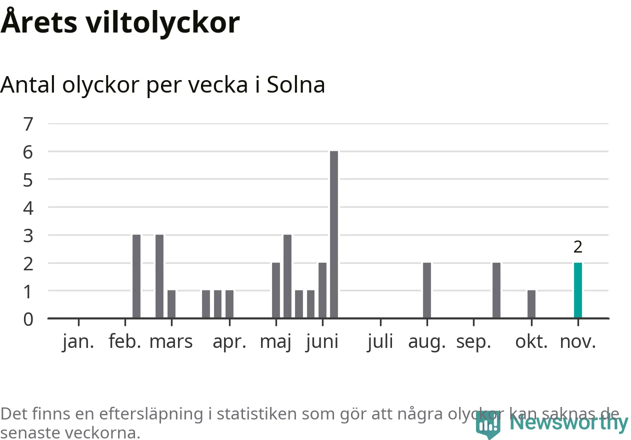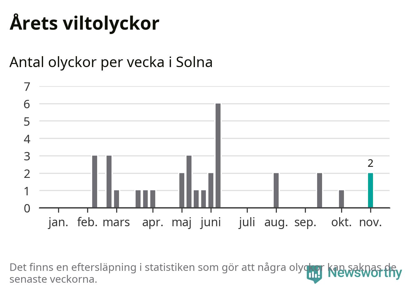 Hittills har två viltolyckor rapporterats in i Solna kommun från vecka 45. Se listan här.