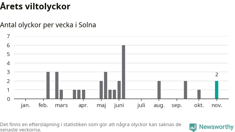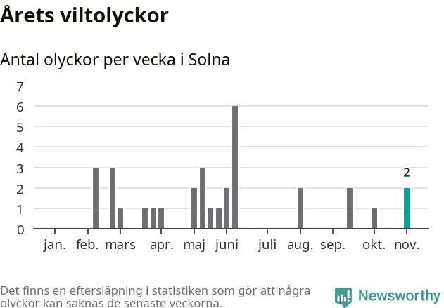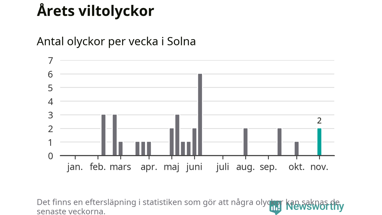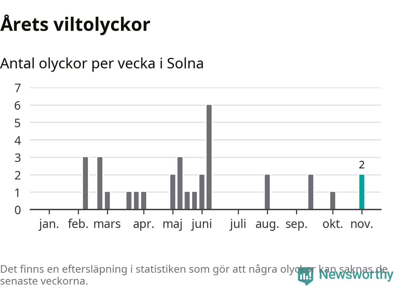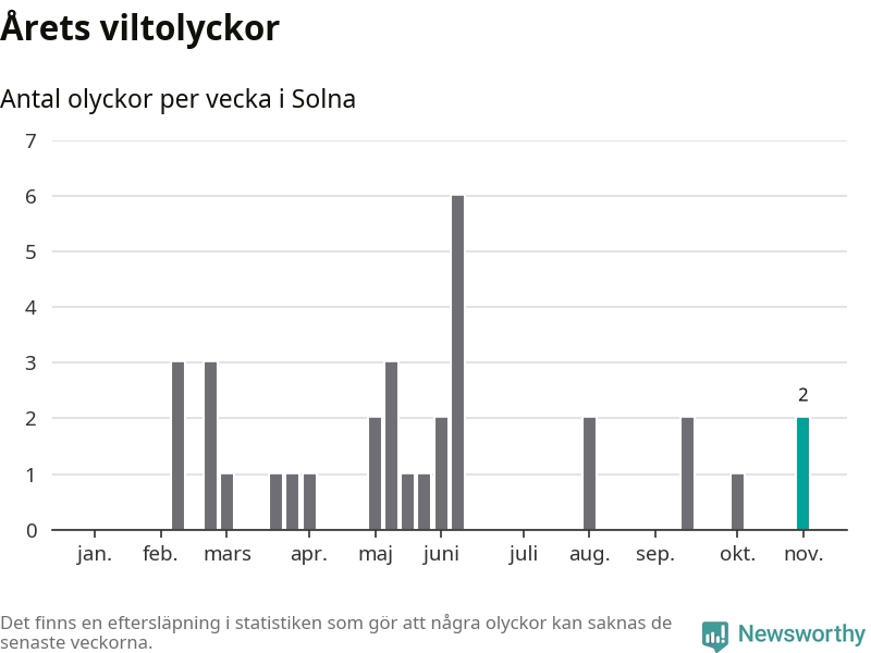 Hittills har två viltolyckor rapporterats in i Solna kommun från vecka 45. Se listan här.