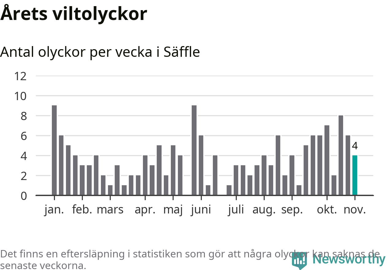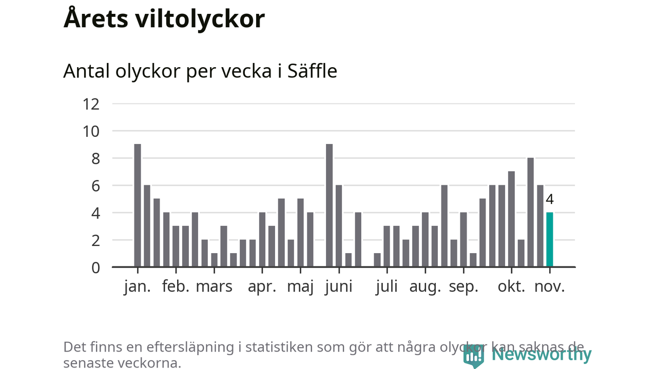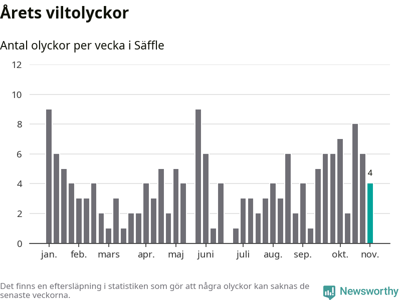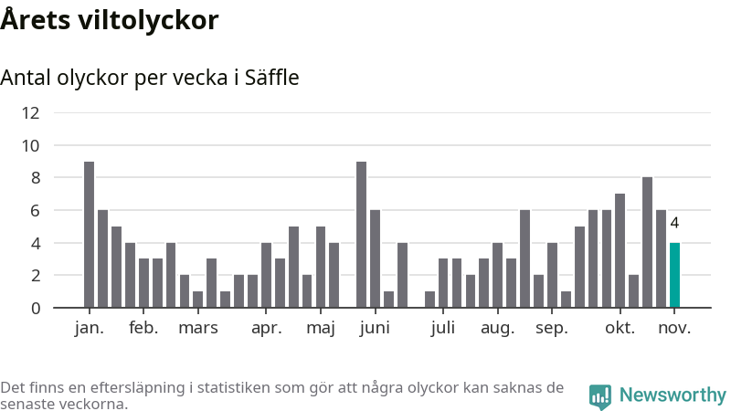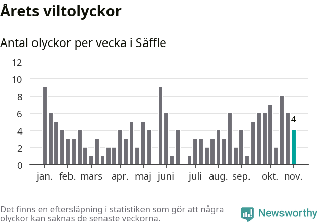Hittills har fyra viltolyckor rapporterats in i Säffle kommun från vecka 45. Se listan här.