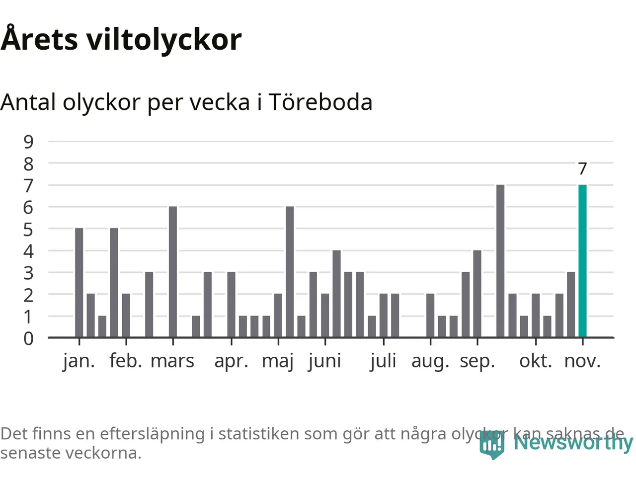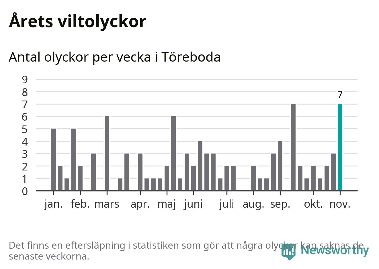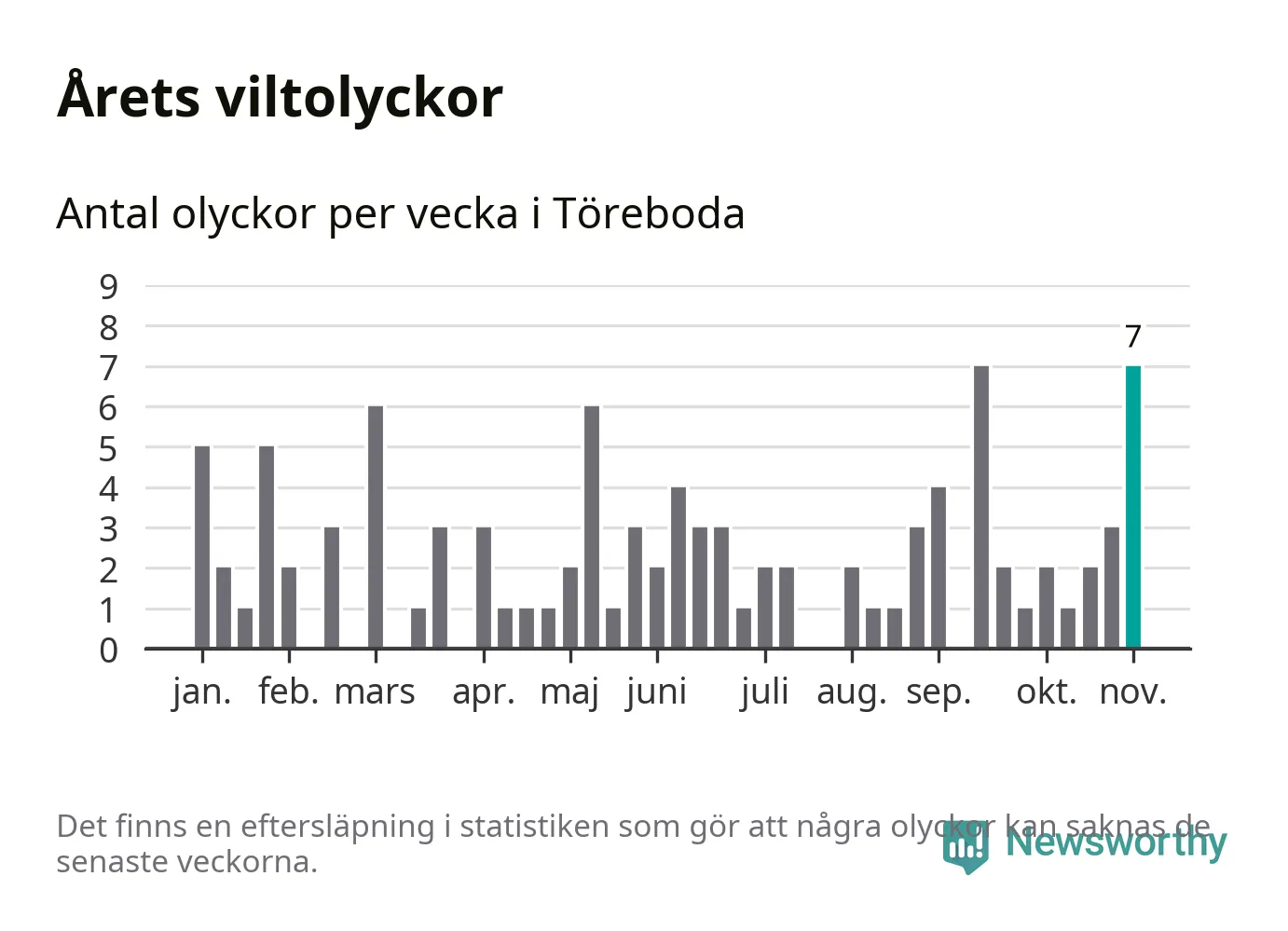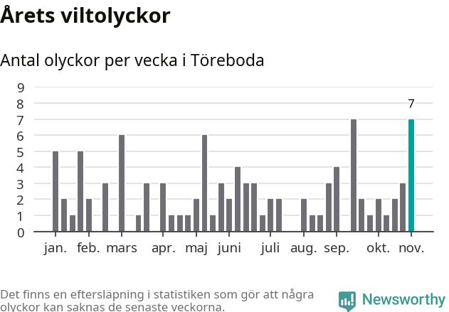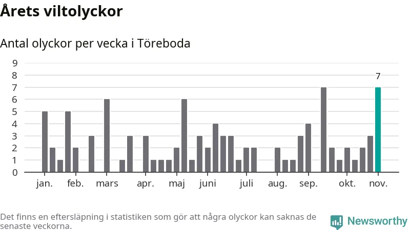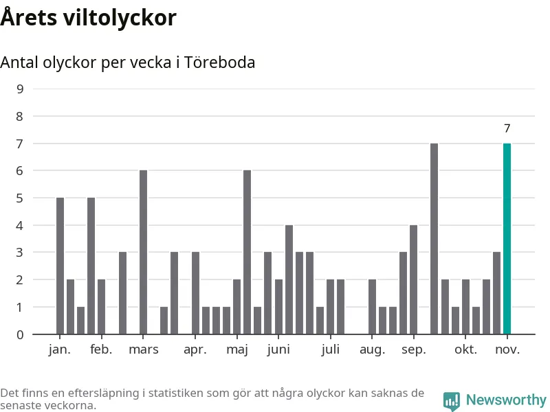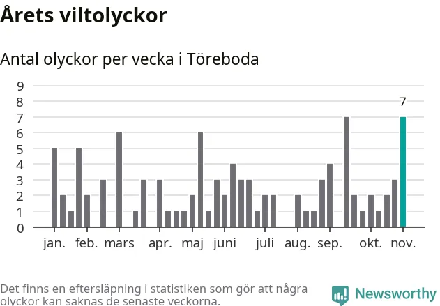 Sju olyckor på en enda vecka är däremot ovanligt många. Bara fyra gånger tidigare sedan 2015 har det skett