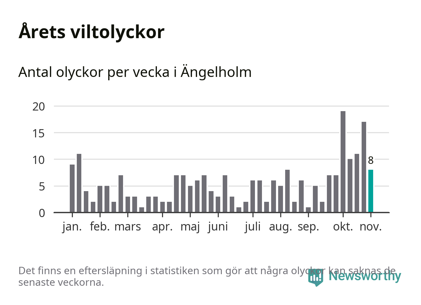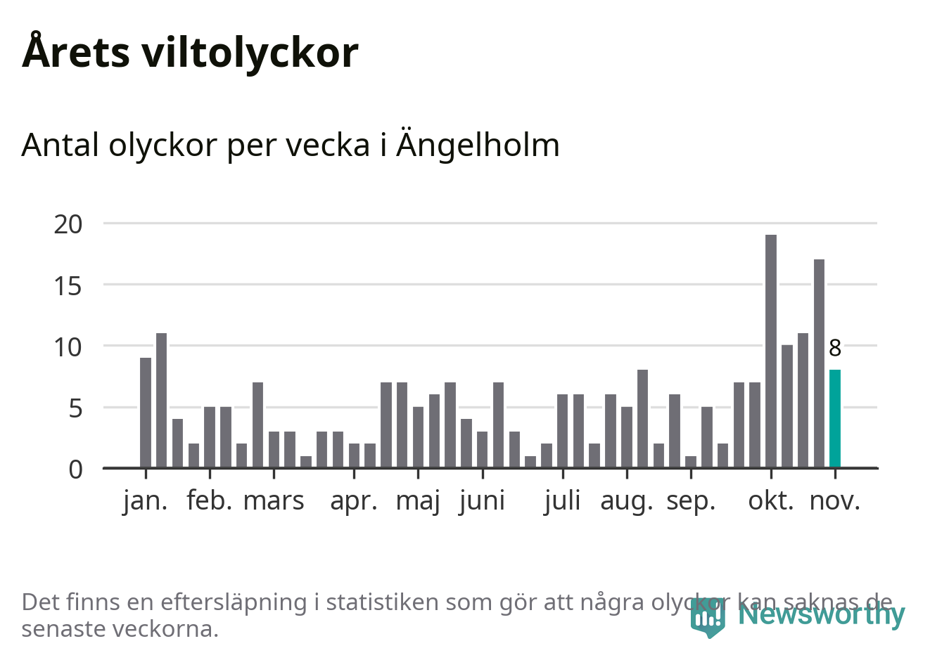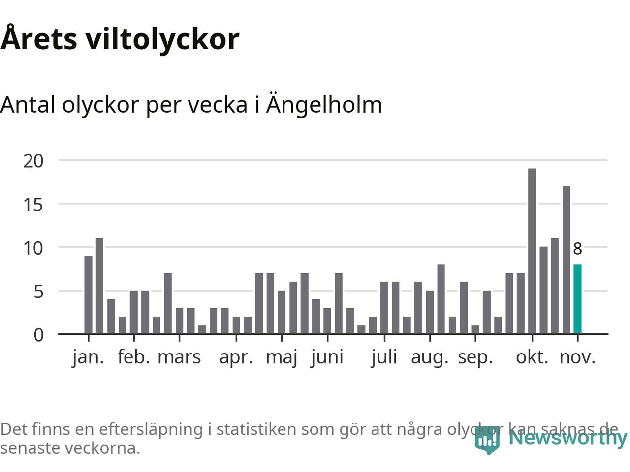 Hittills har åtta viltolyckor rapporterats in i Ängelholms kommun från vecka 45. Se listan här.