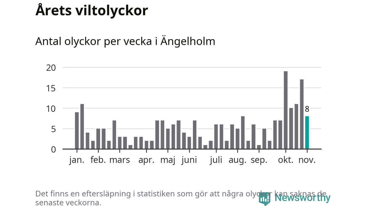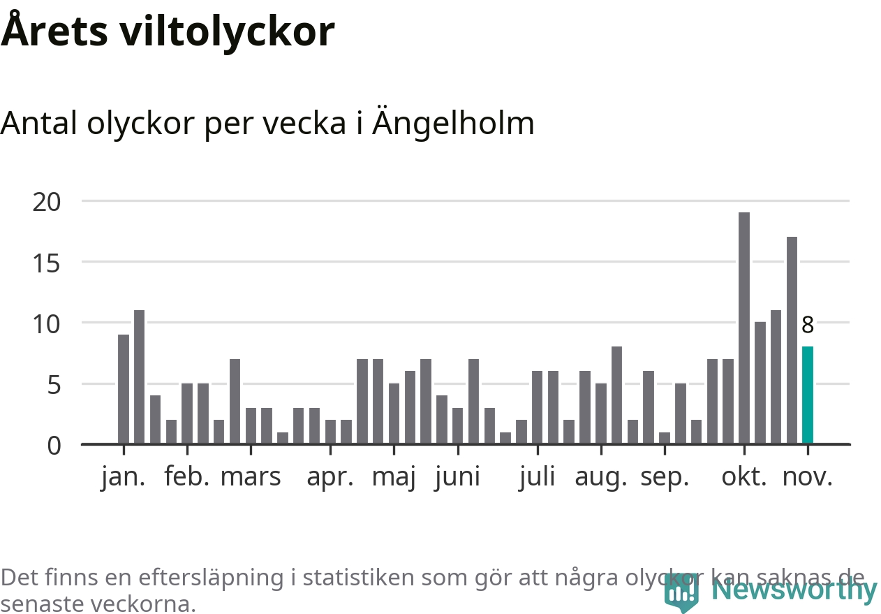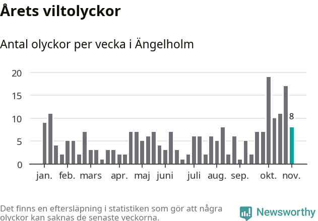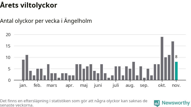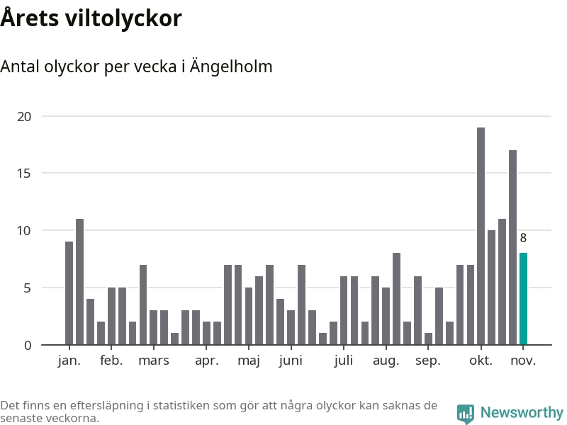 Hittills har åtta viltolyckor rapporterats in i Ängelholms kommun från vecka 45. Se listan här.