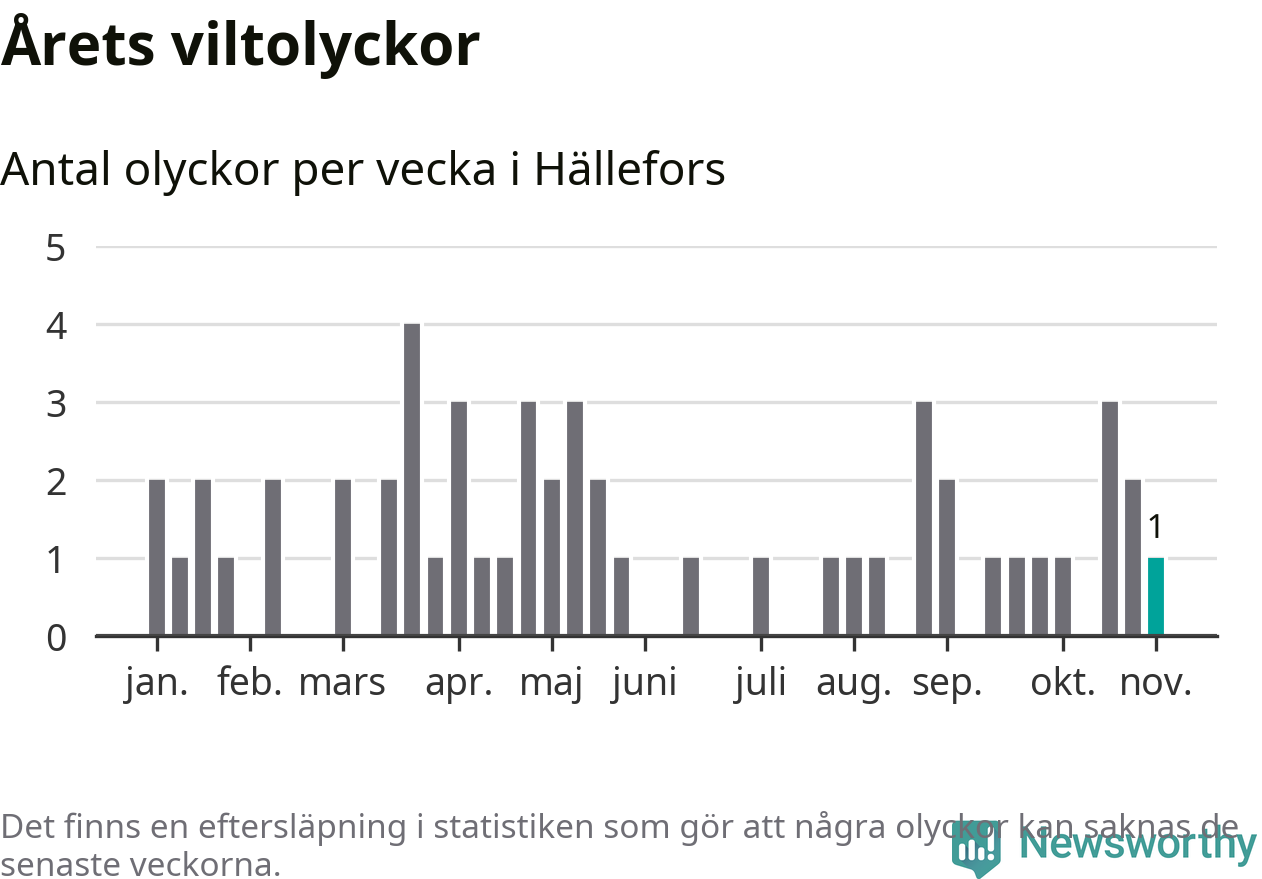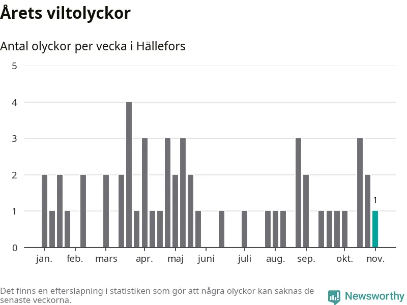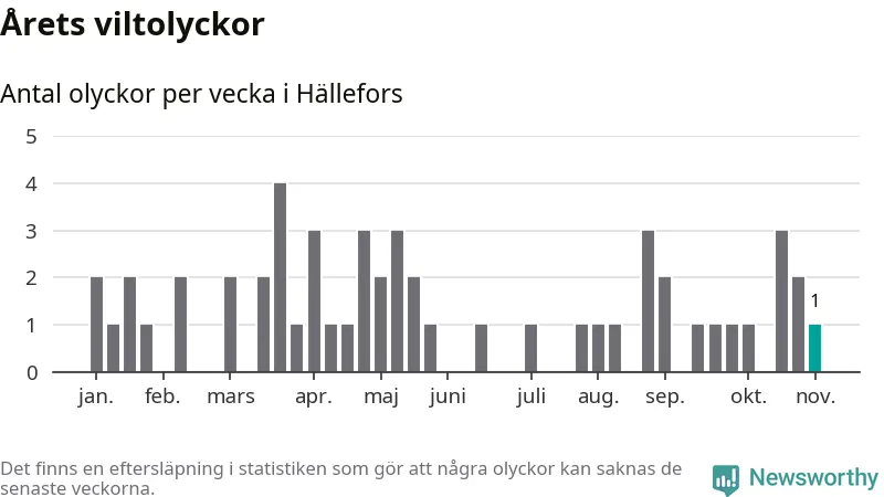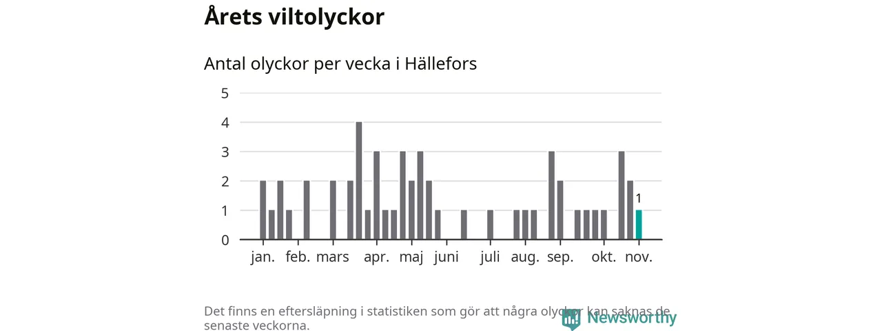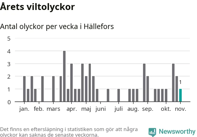 Från förra veckan (vecka 45) har hittills en viltolycka rapporterats in i Hällefors kommun.