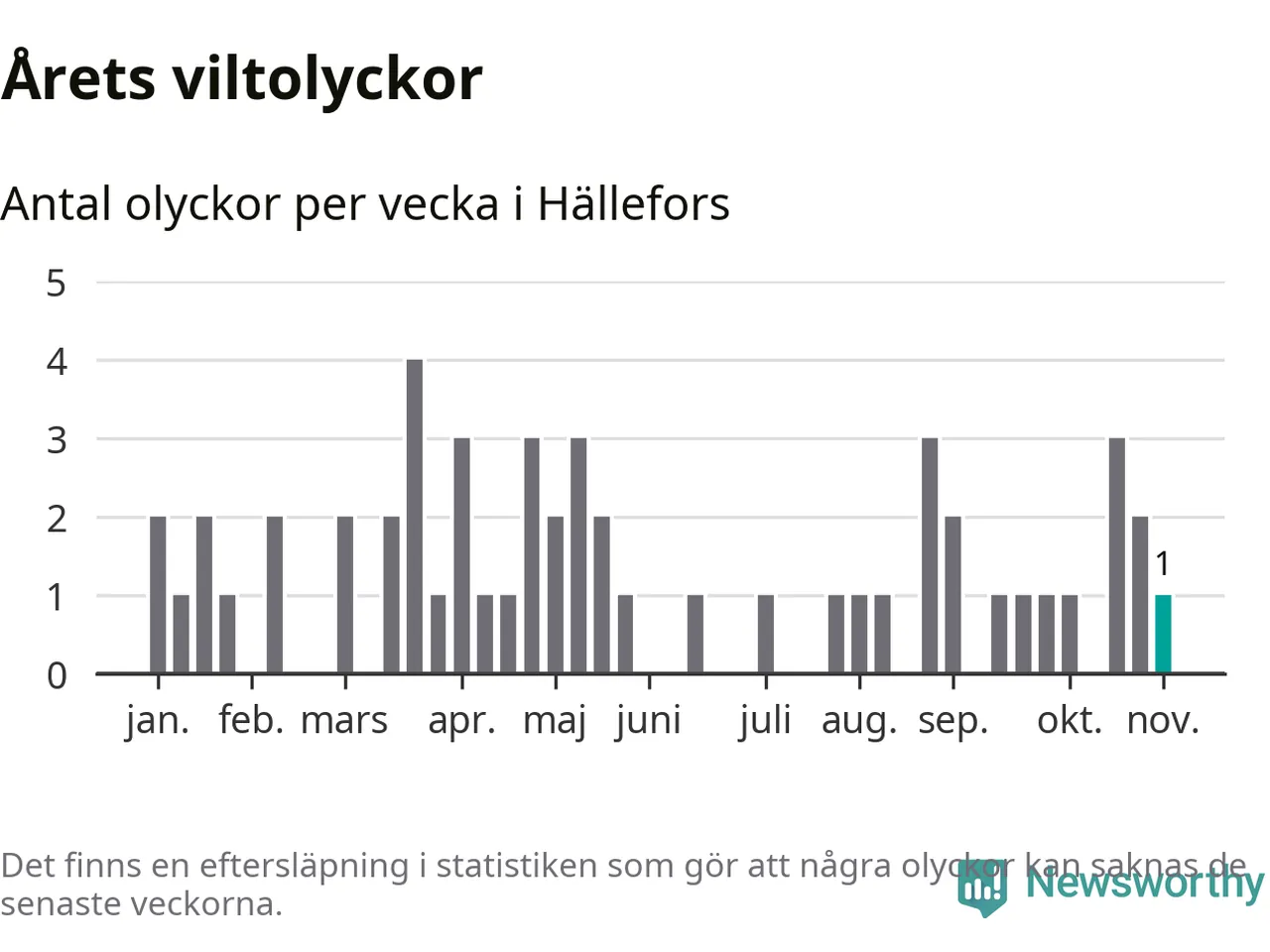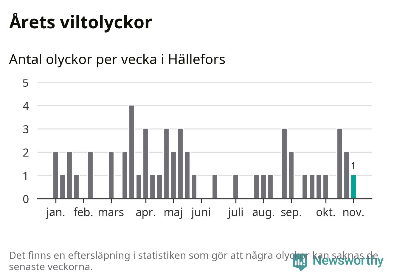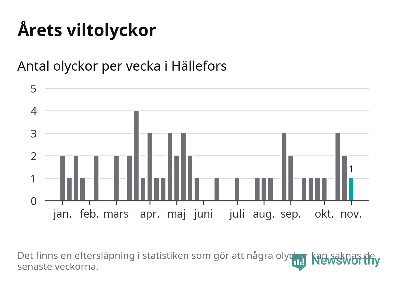 Från förra veckan (vecka 45) har hittills en viltolycka rapporterats in i Hällefors kommun.