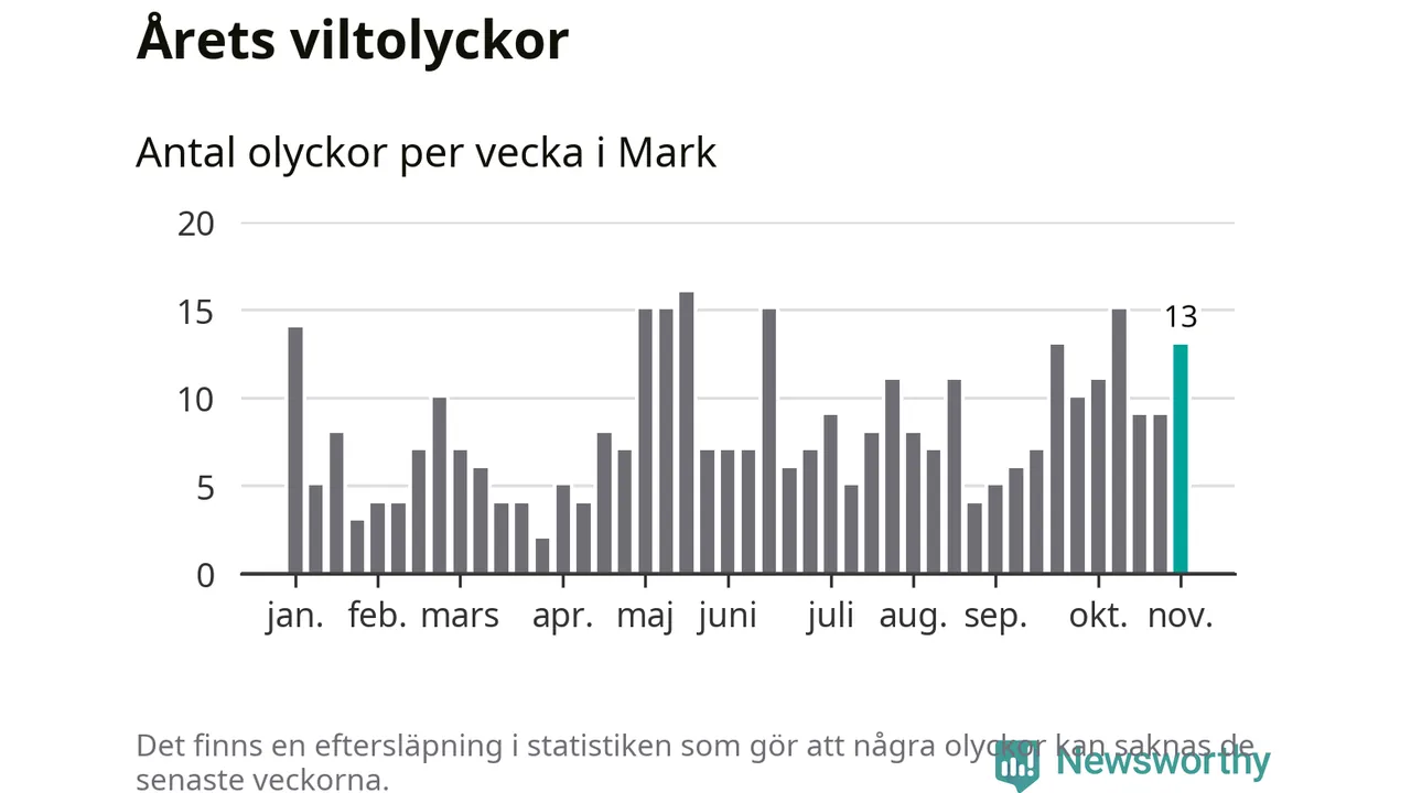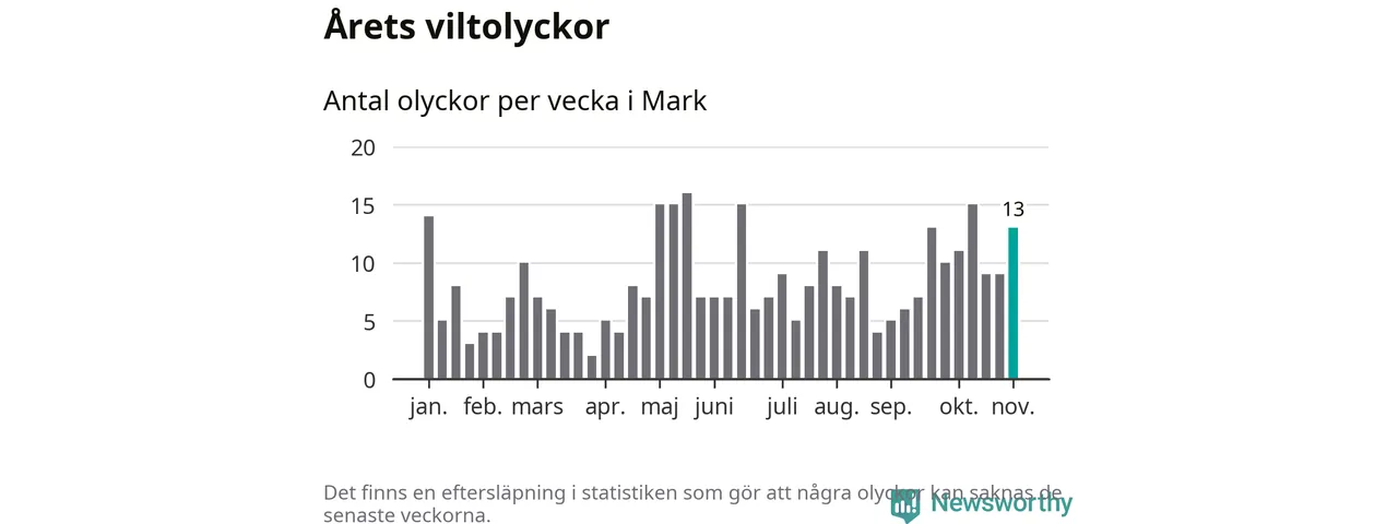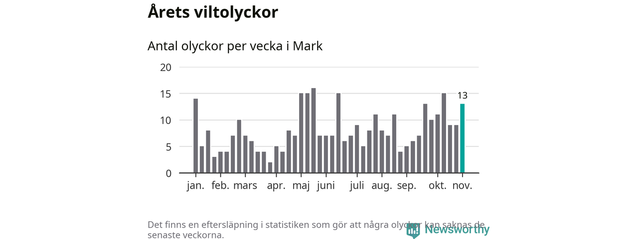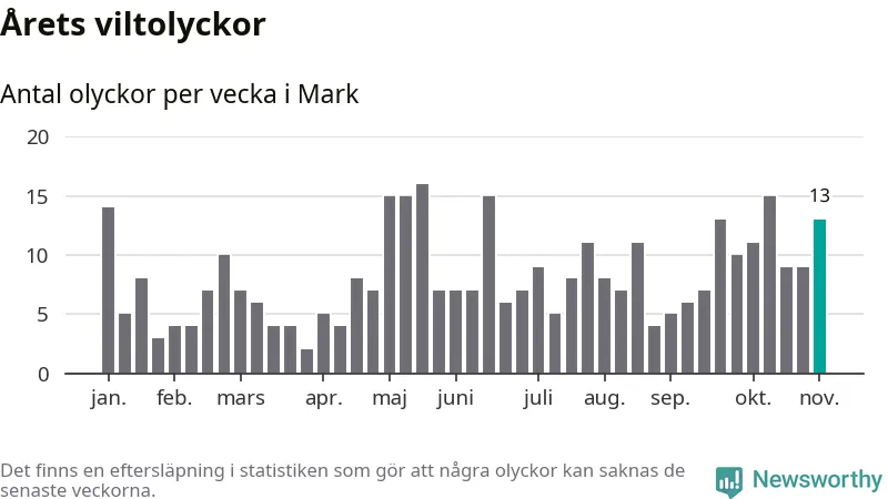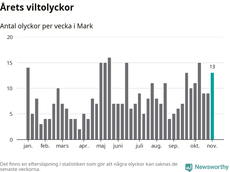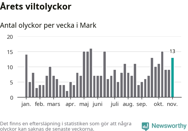 Hittills har 13 viltolyckor rapporterats in i Marks kommun från vecka 45. Se listan här.