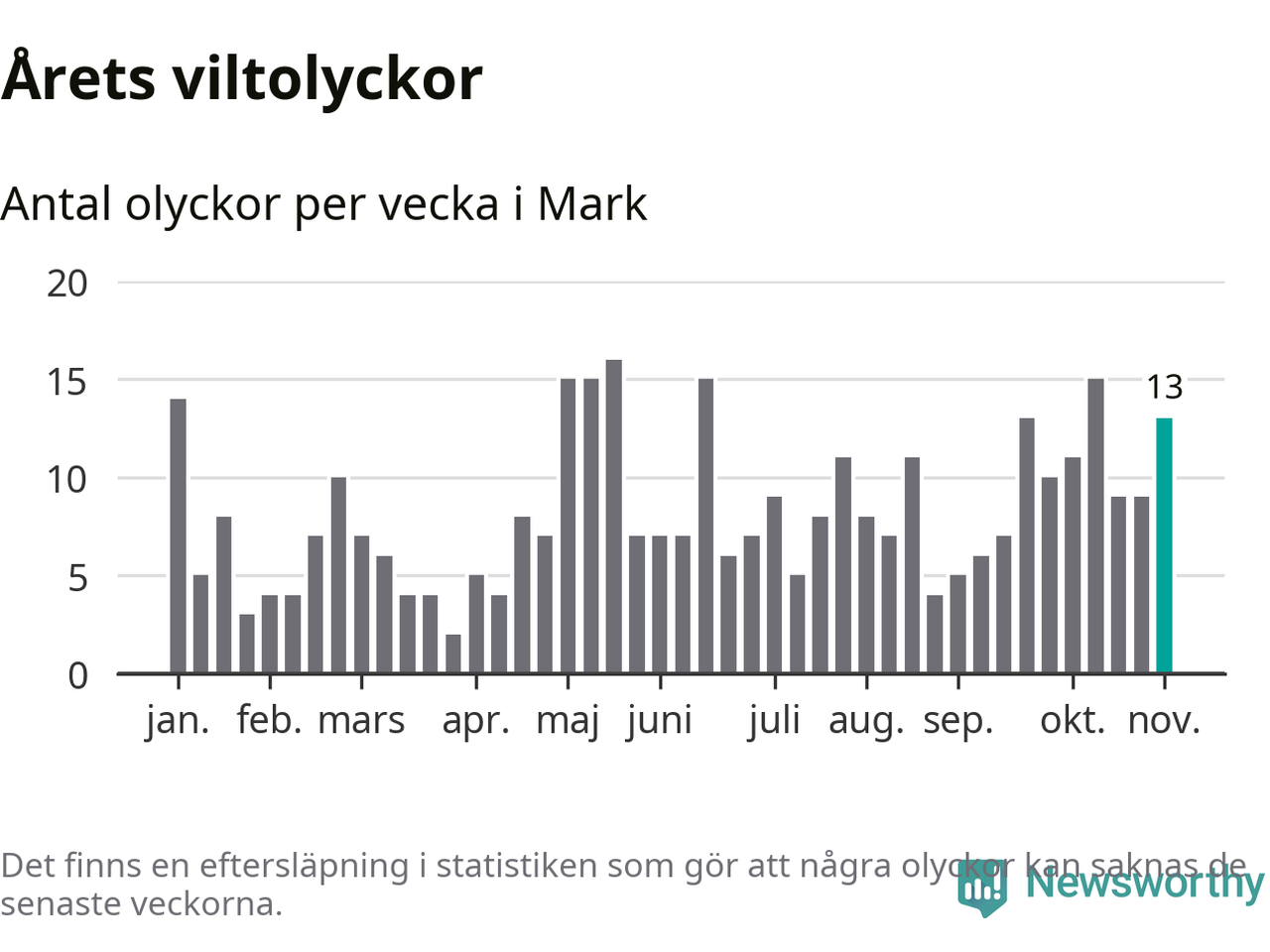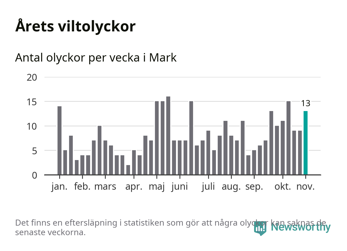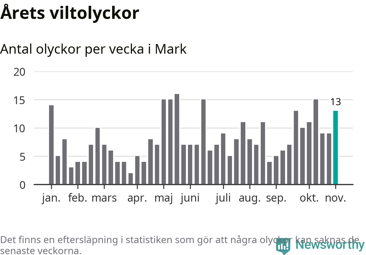Hittills har 13 viltolyckor rapporterats in i Marks kommun från vecka 45. Se listan här.