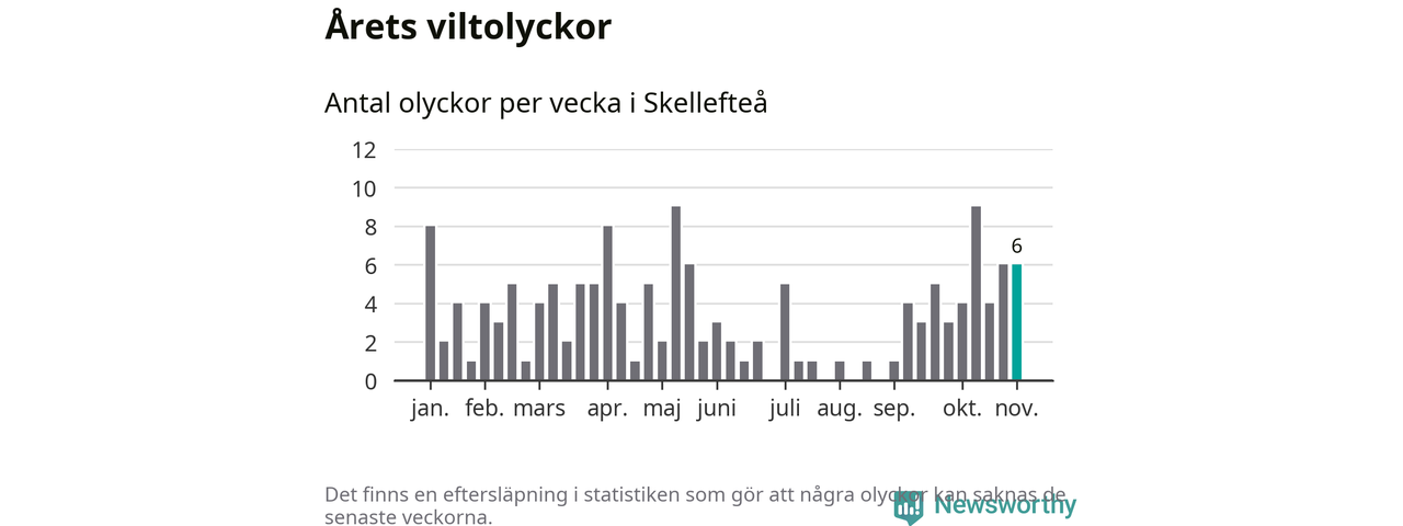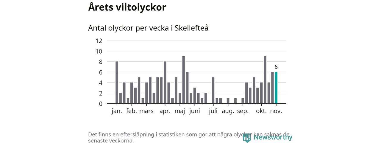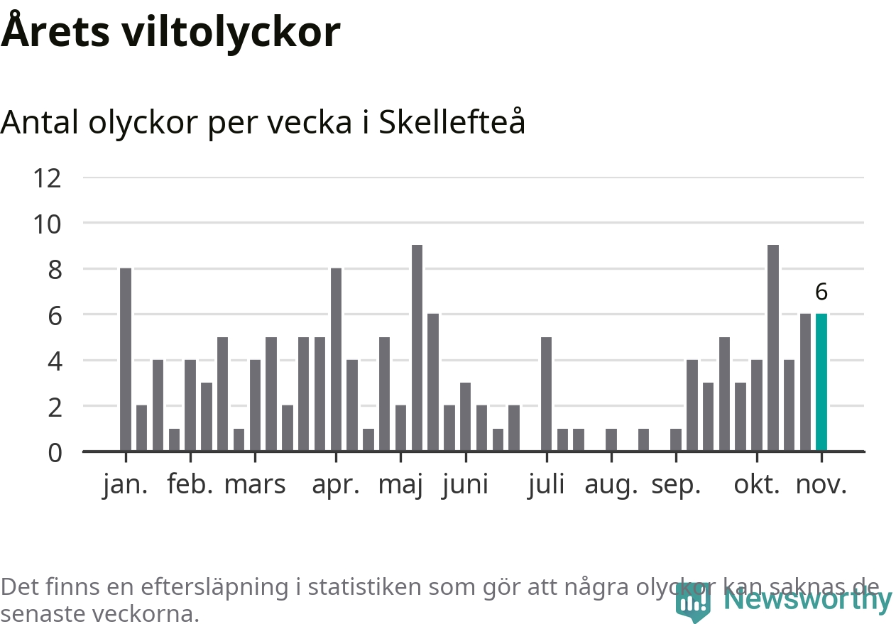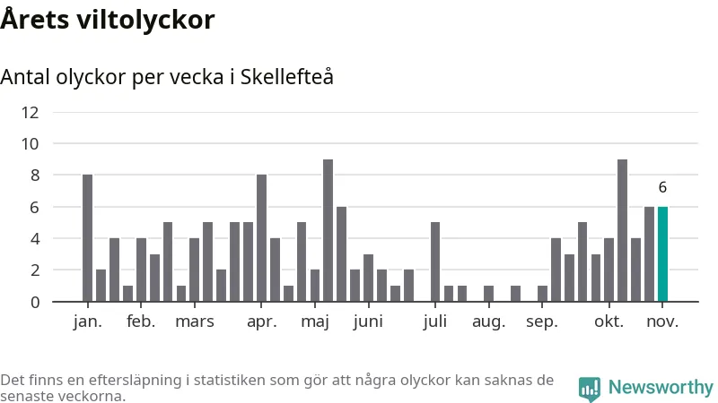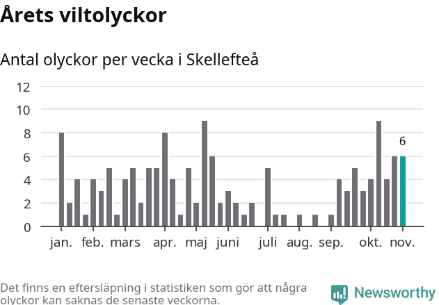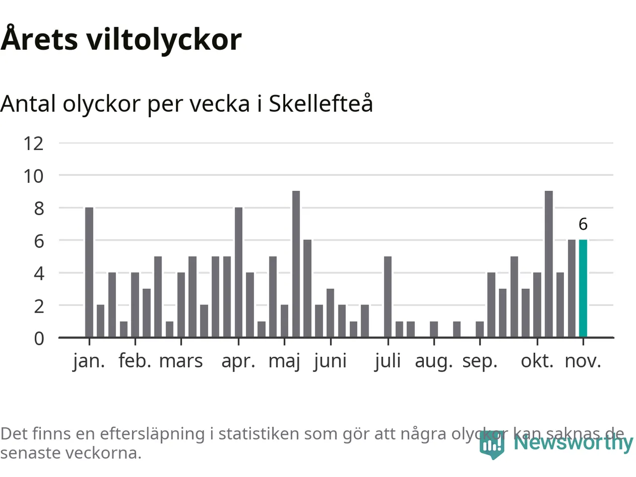 Hittills har sex viltolyckor rapporterats in i Skellefteå kommun från vecka 45. Se listan här.